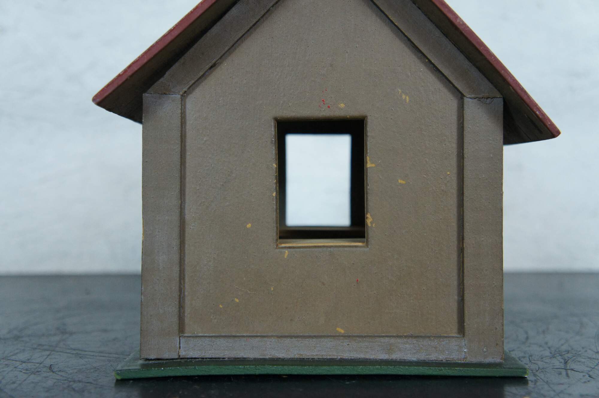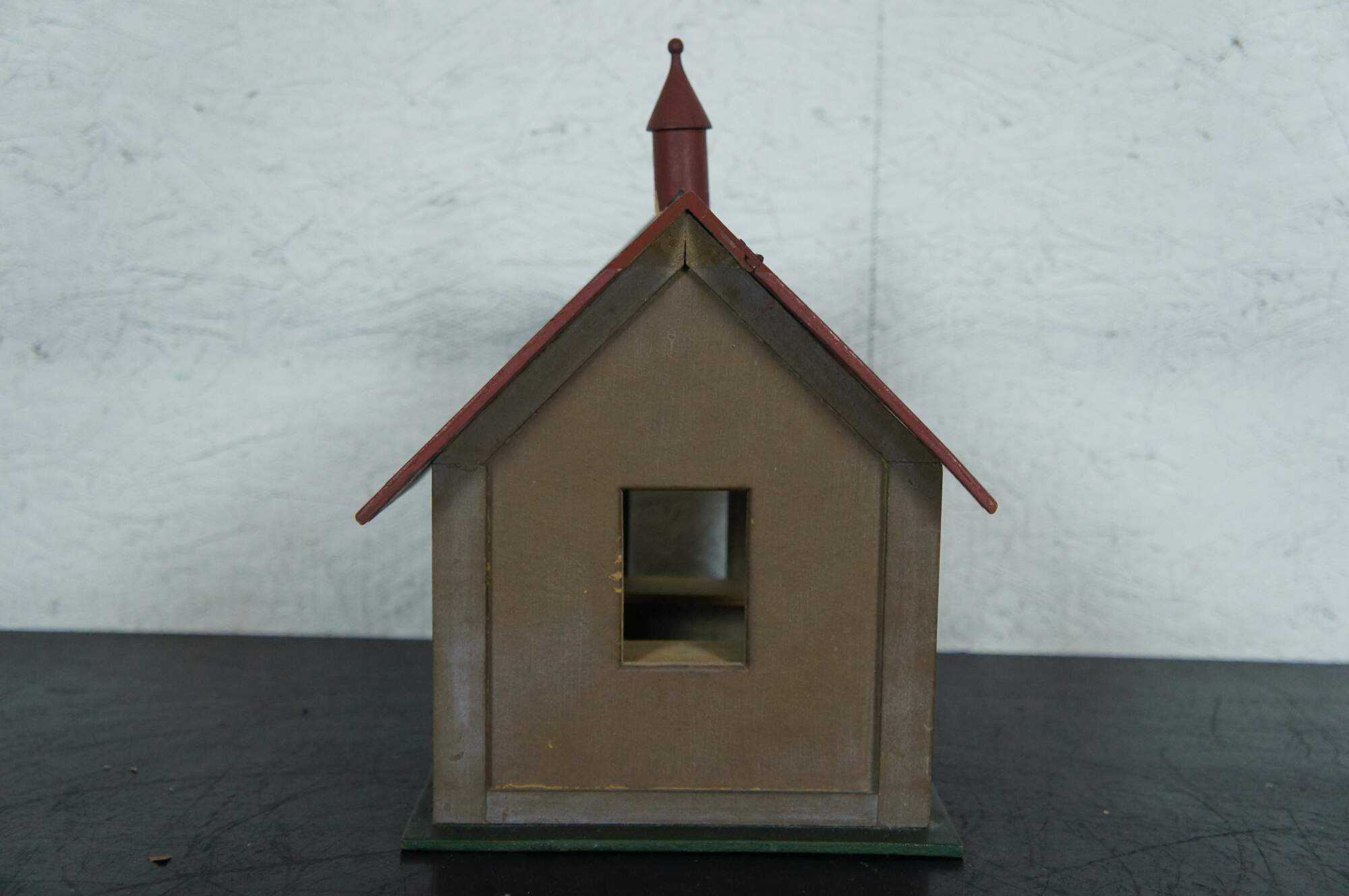 Vintage hand made folk art style school house shaped dollhouse with green grass base, brown walls, and red roof. One wall is fully open and one half of the roof flips up for better access to the interior. School room features printed wood panel walls, two windows, painted checker board floor, and unpainted desks/benches lining the sides.
