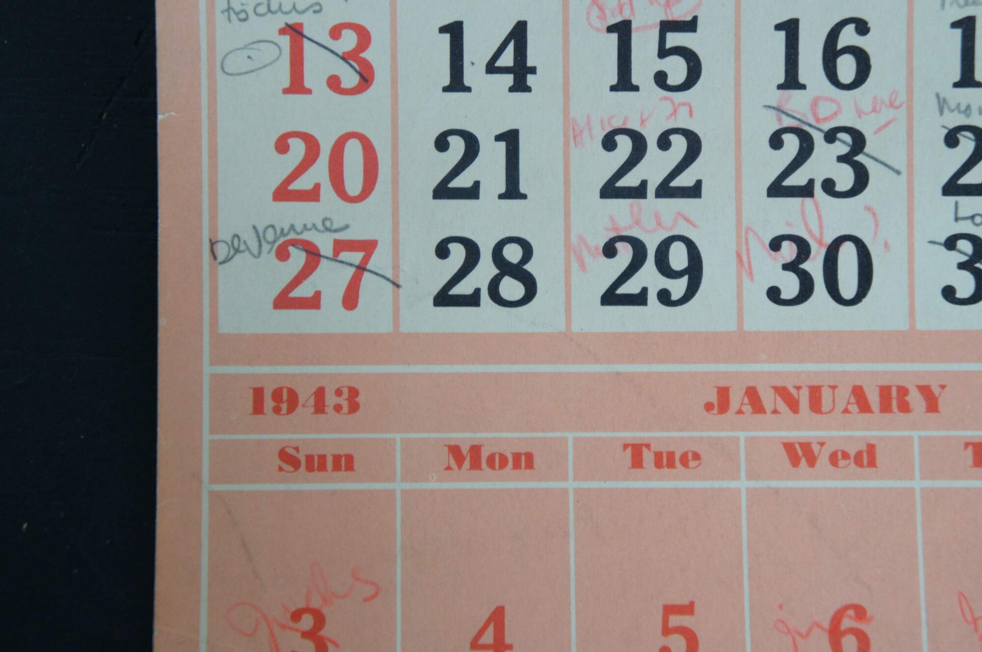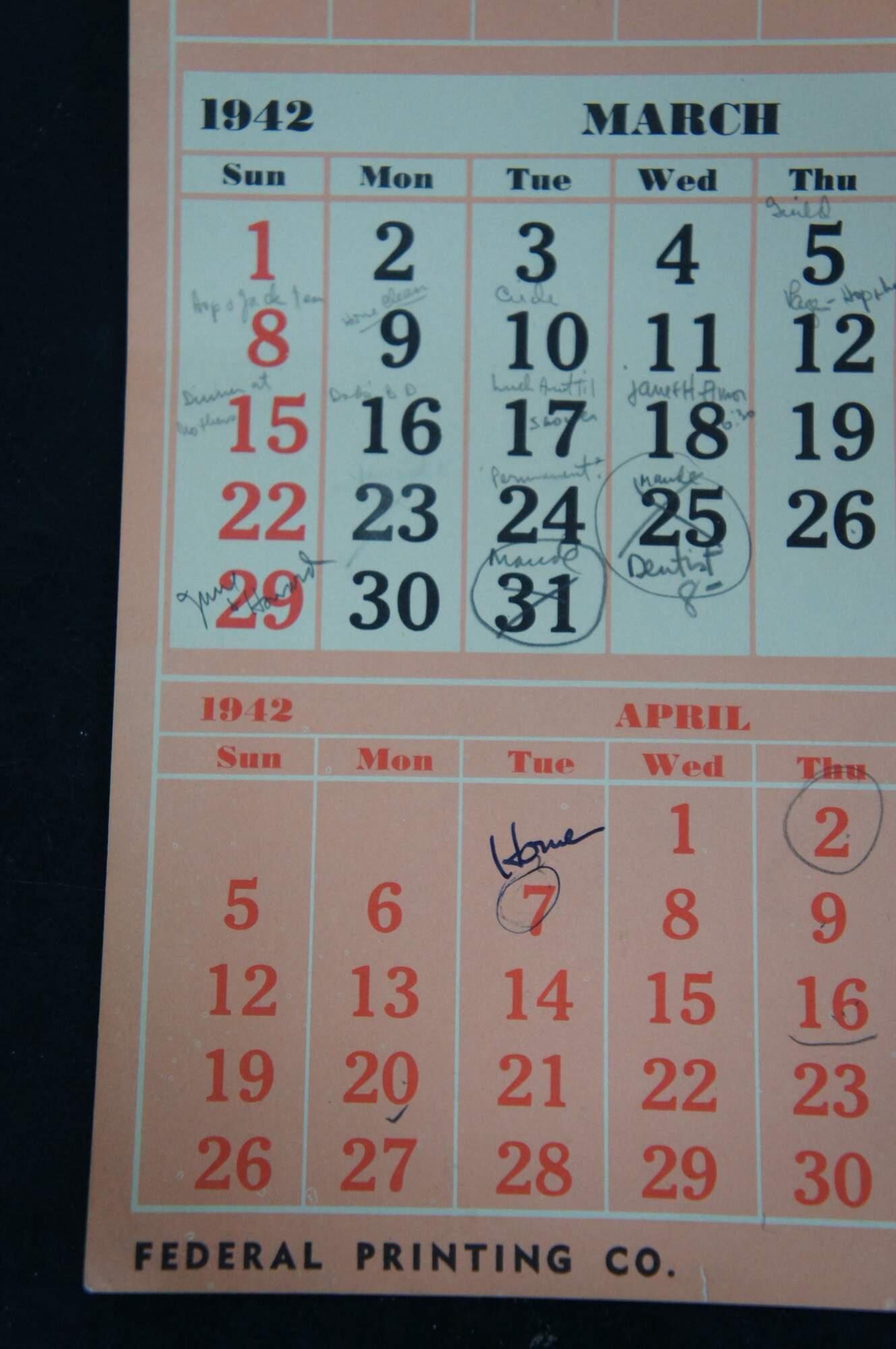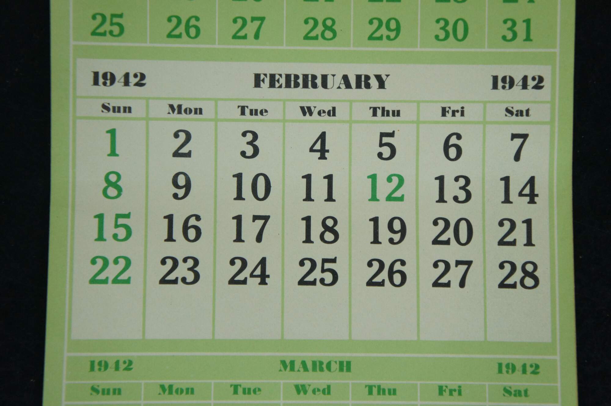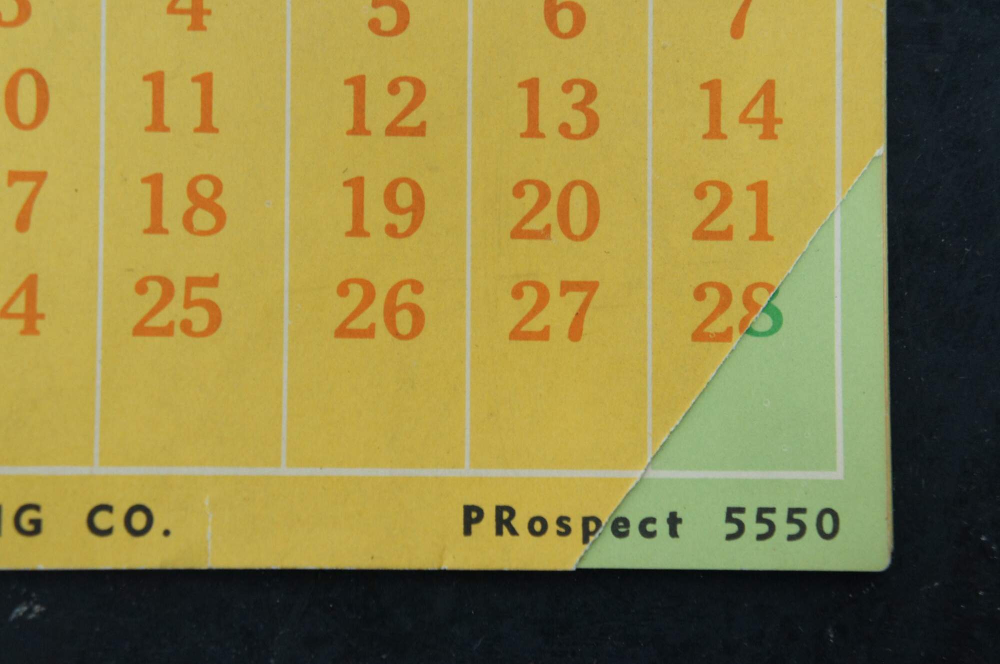 1941 - 1942 mid century twelve month calendar printed on pages of alternating colors by the Federal Printing Company, marked PRospect 5550 in the lower corner.