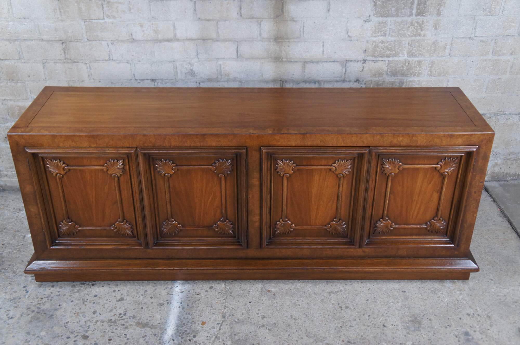 Vintage Italian Provincial console or credenza by Fancher Furniture, cica 1970s. A rectangular form made from walnut with burled accents. Features four acanthus carved doors that open to three dovetailed drawers along the left and storage to the right