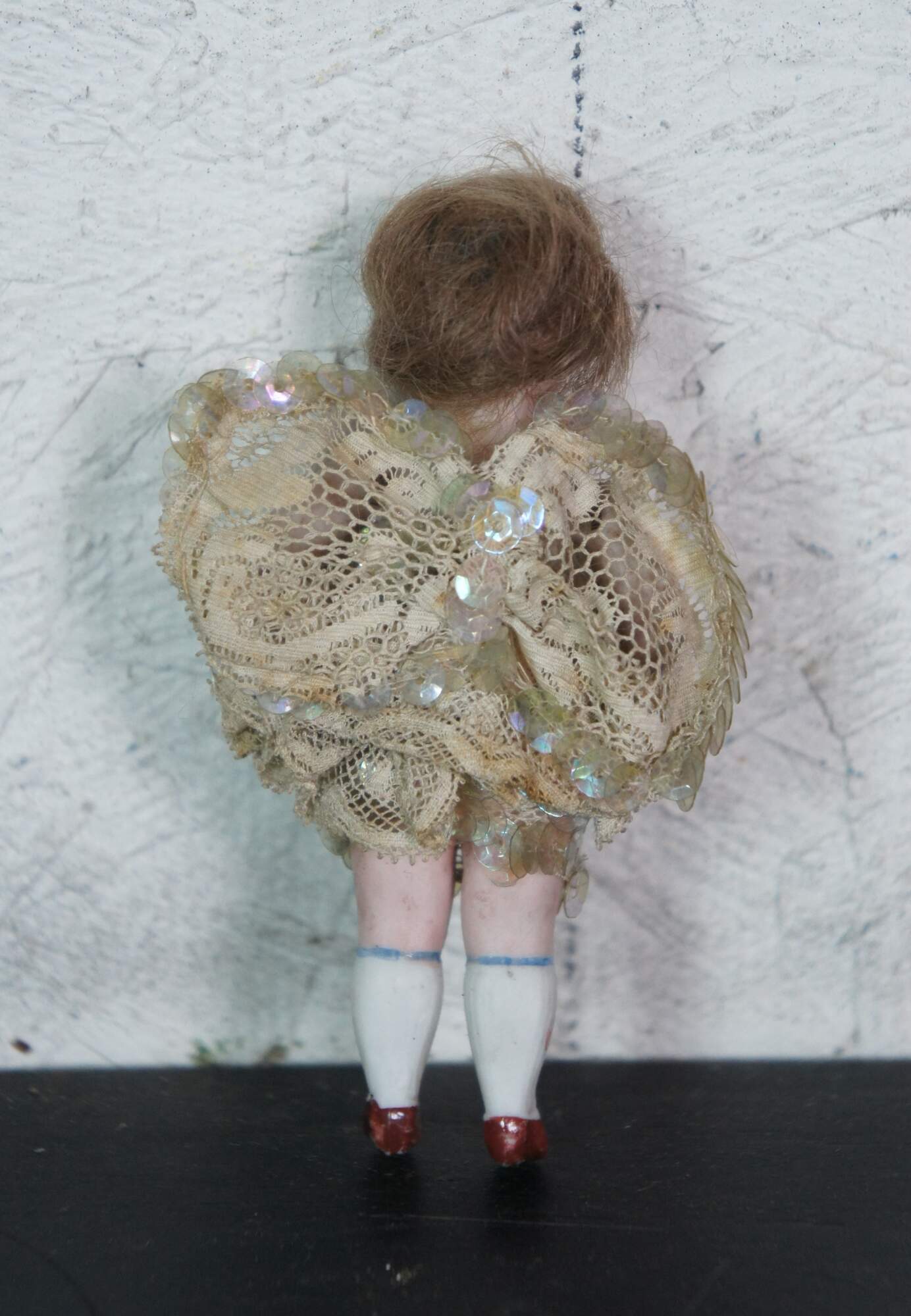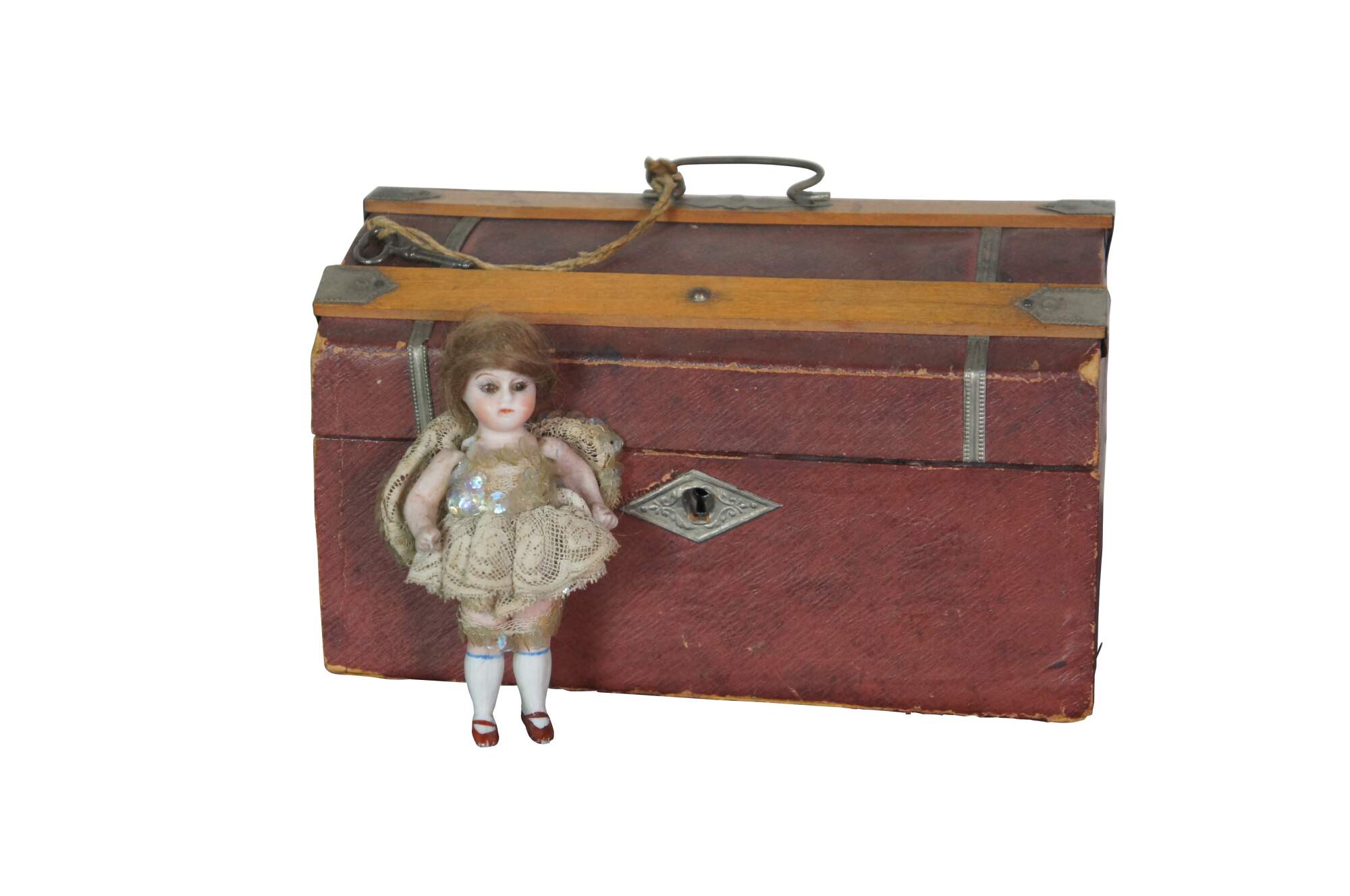 Late 19th century French mignonette doll - diminutive palm sized bique doll with jointed limbs, painted feet and features, glass eyes, and brown hair. comes with a red paper mache steamer trunk / chest with a wardrobe of six outfits. Doll marked 161-8 on back. Key included but lock is decorative, not functional.