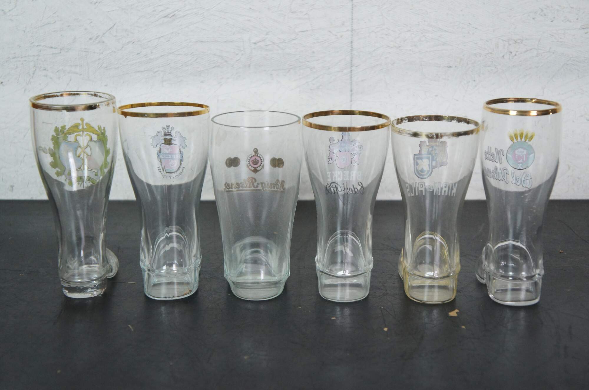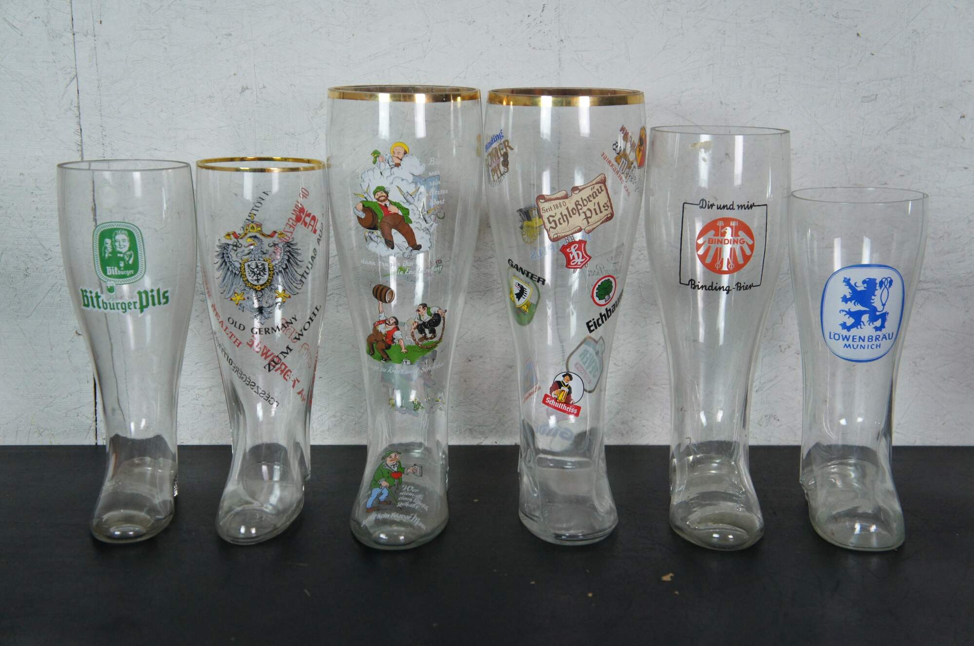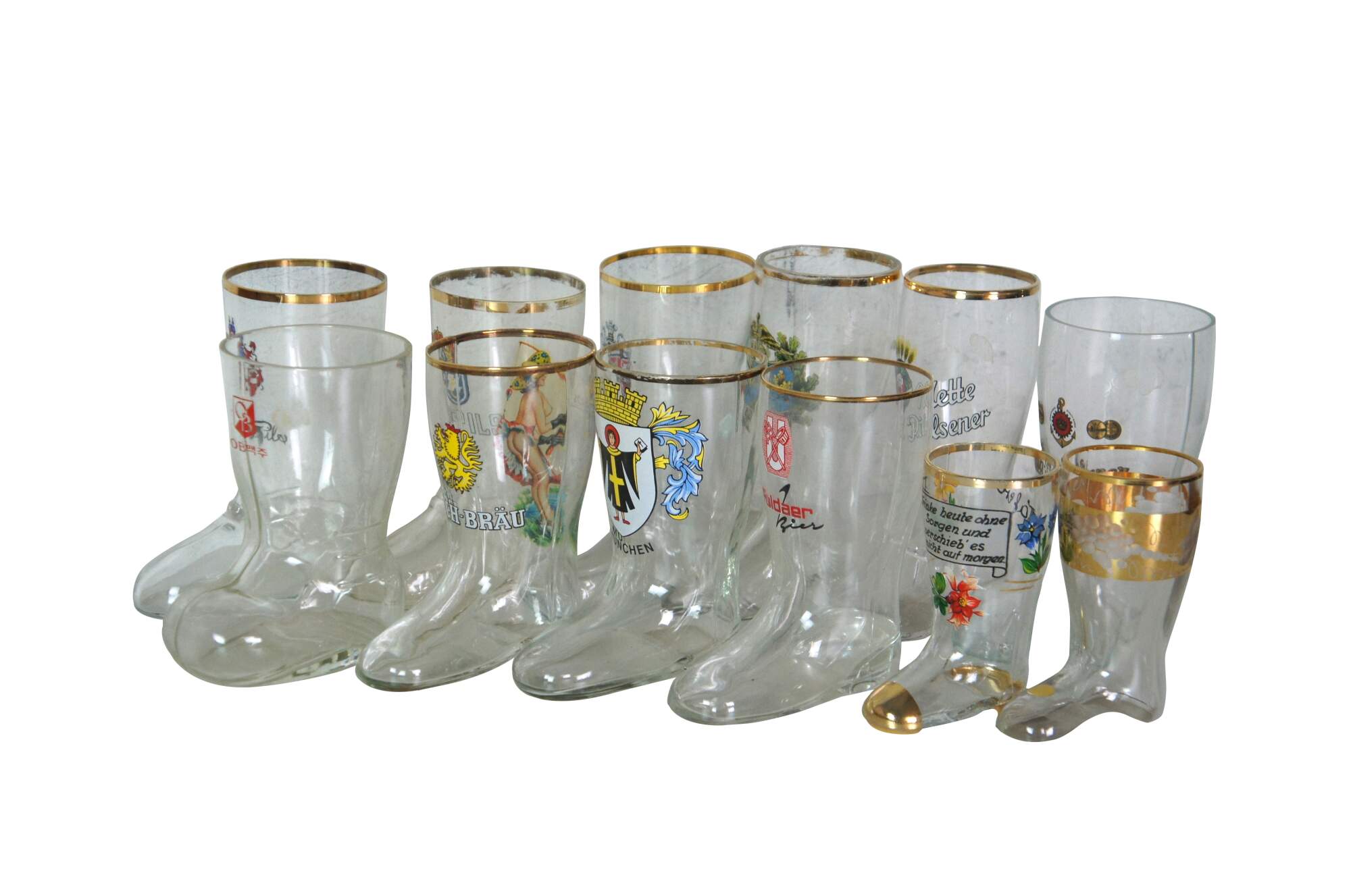 Lot of 24 mid to late 20th century German beer glass drinking boots in a wide variety of sizes. Some painted, some printed, some city souvenirs, some Heraldic Crests / Coat of Arms. Brands represented include: Bitburger, Schlopbrau, Binding, Lowenbrau, Old Germany, Parkbrau, Becks, Konig, Koch-brau, Fuldaer.