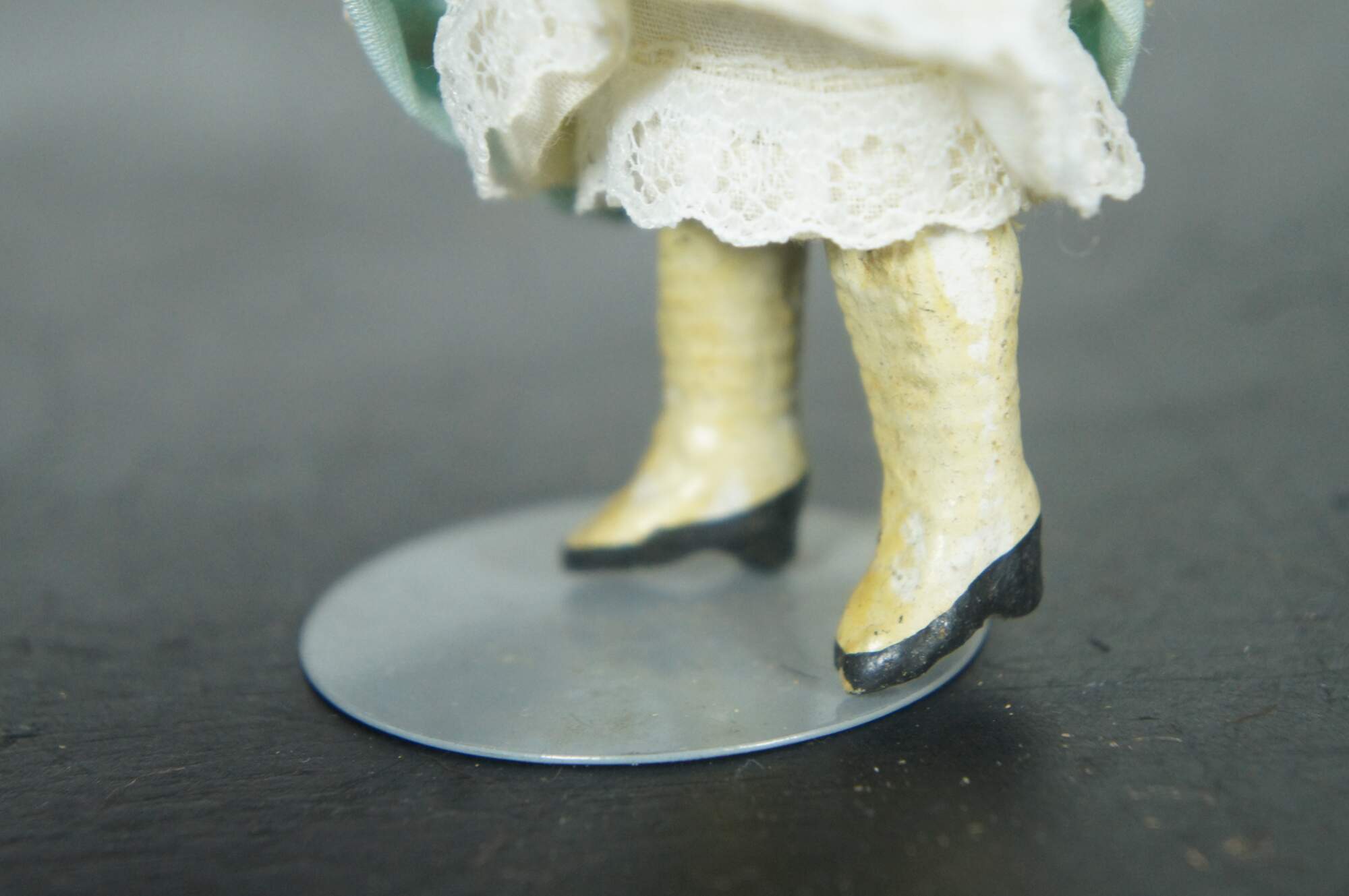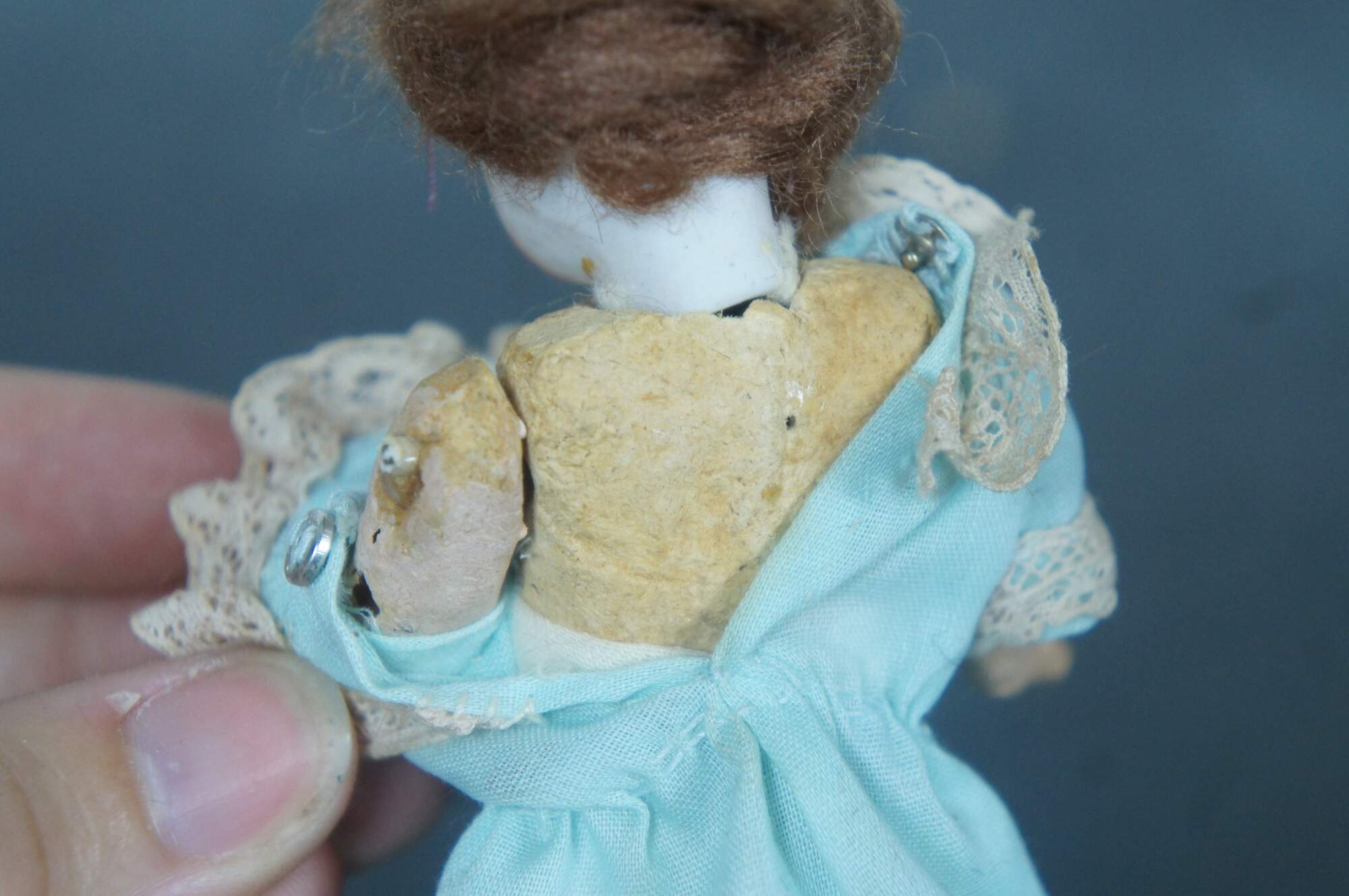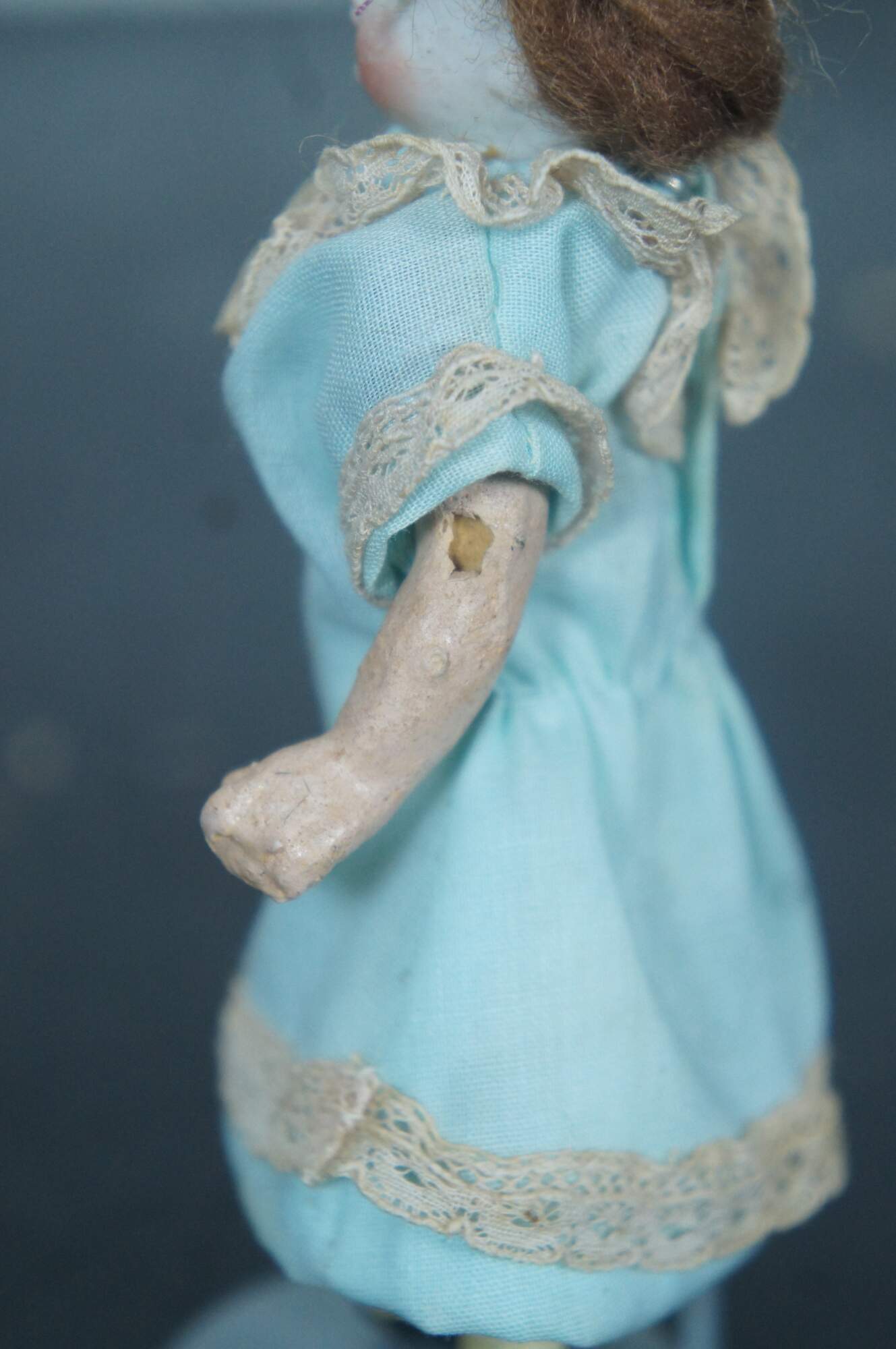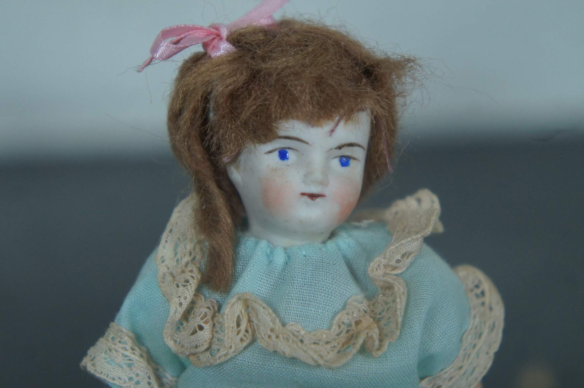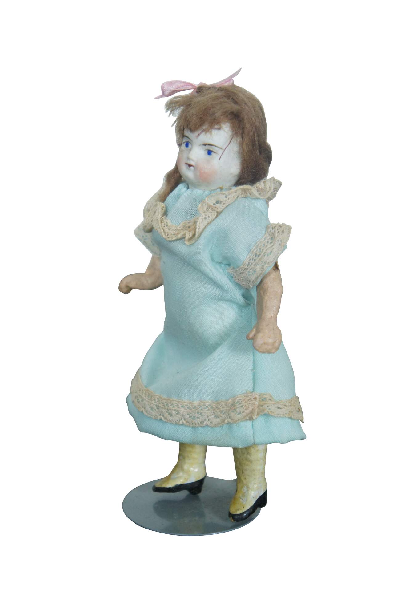 bisque head, painted features, fiber hair, composition body with articulated limbs. Dressed in a blue cotton dress with lace trim.