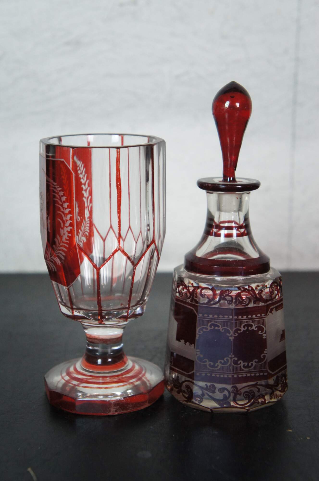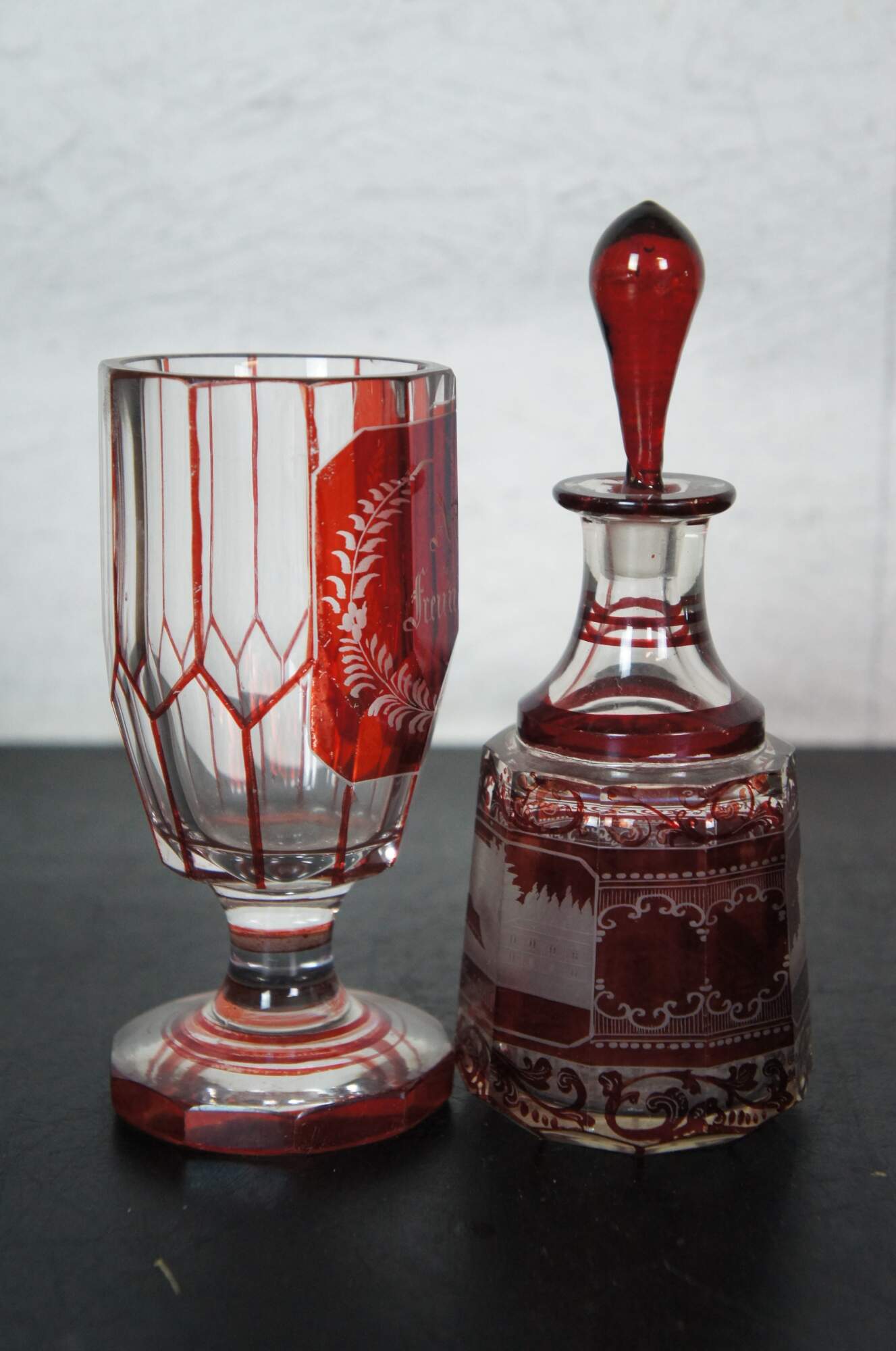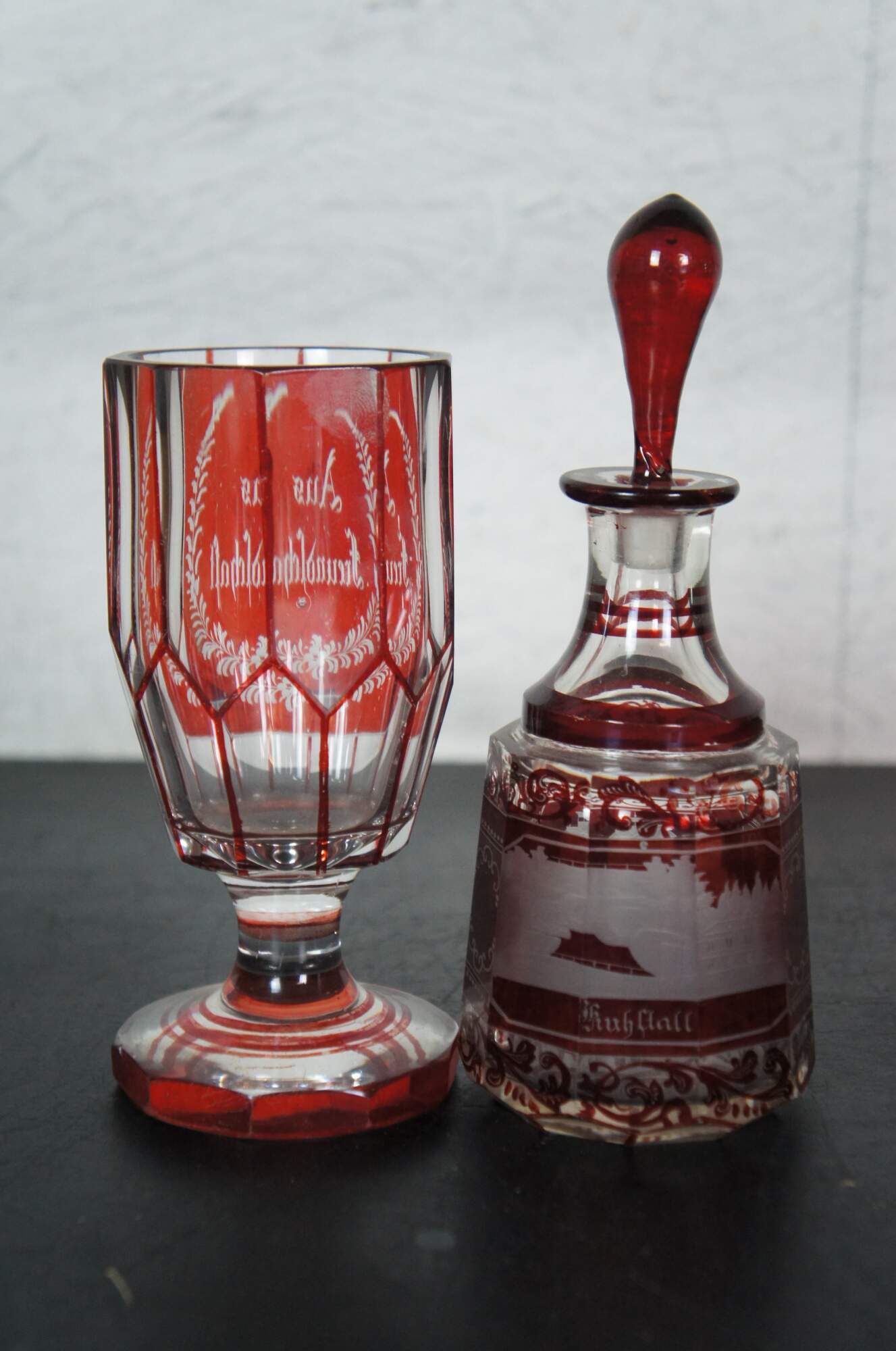 Late 19th to early 20th century Victorian era German / Bohemian flashed ruby glass souvenir goblet and small whiskey or perfume decanter. Goblet features striped faceted sides, a footed base and a floral wreath around the words "Aus Freundschaft" (Out of Friendship). Decanter features a drop / nipple shaped red stopper, and facted sides with a scrolling foliate motif framing views of Winterberg, Germany and the Kuhstall natural stone arch of Saxon Switzerland.