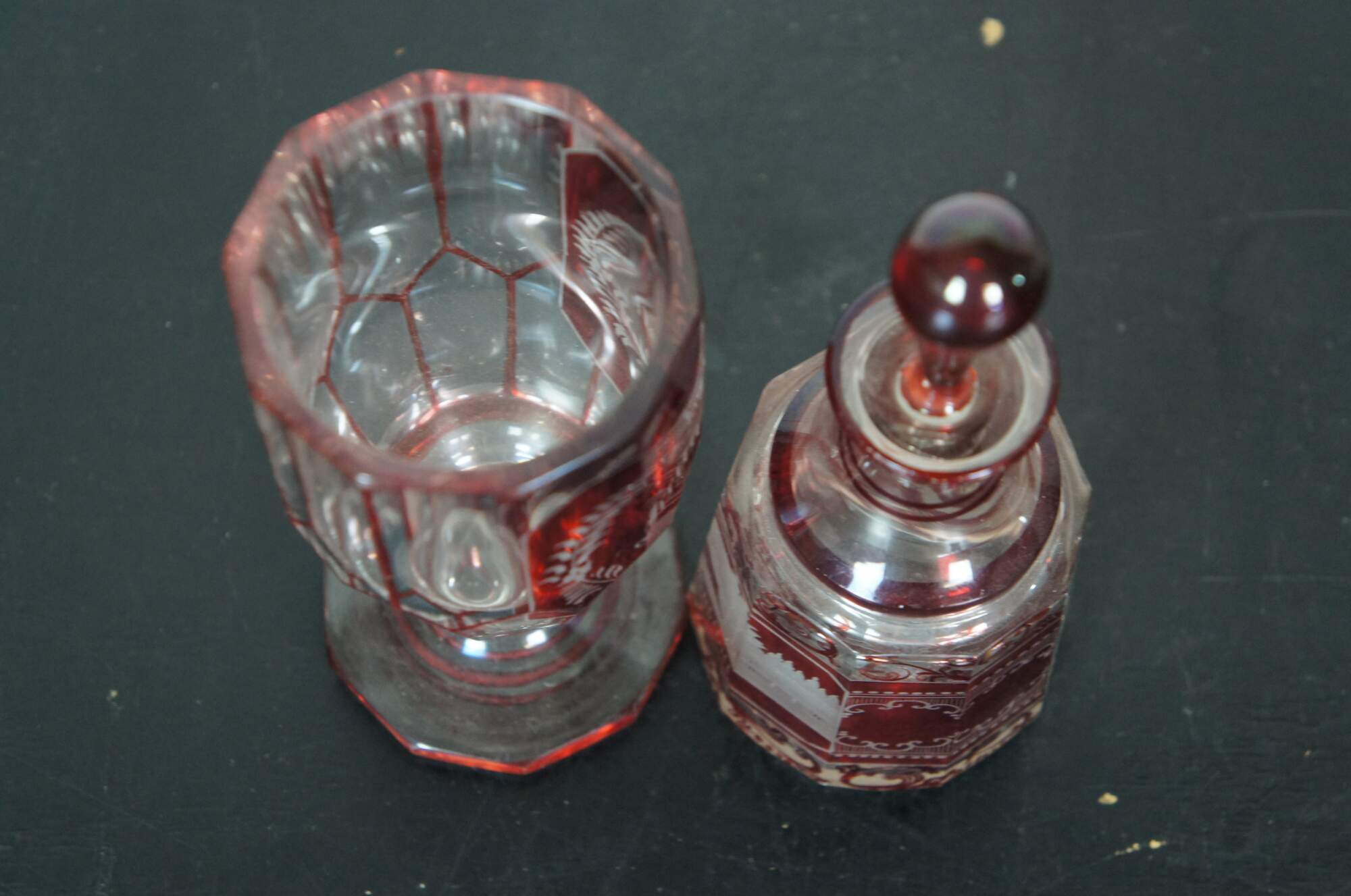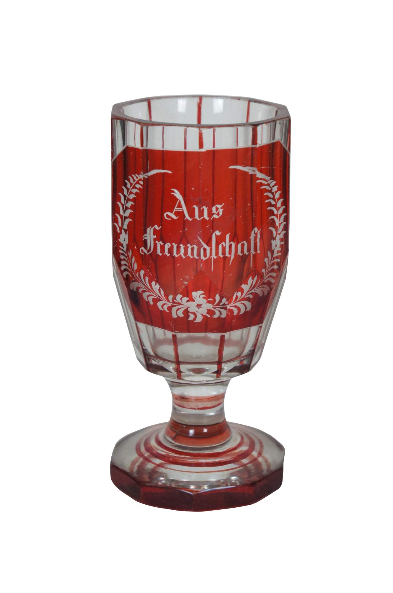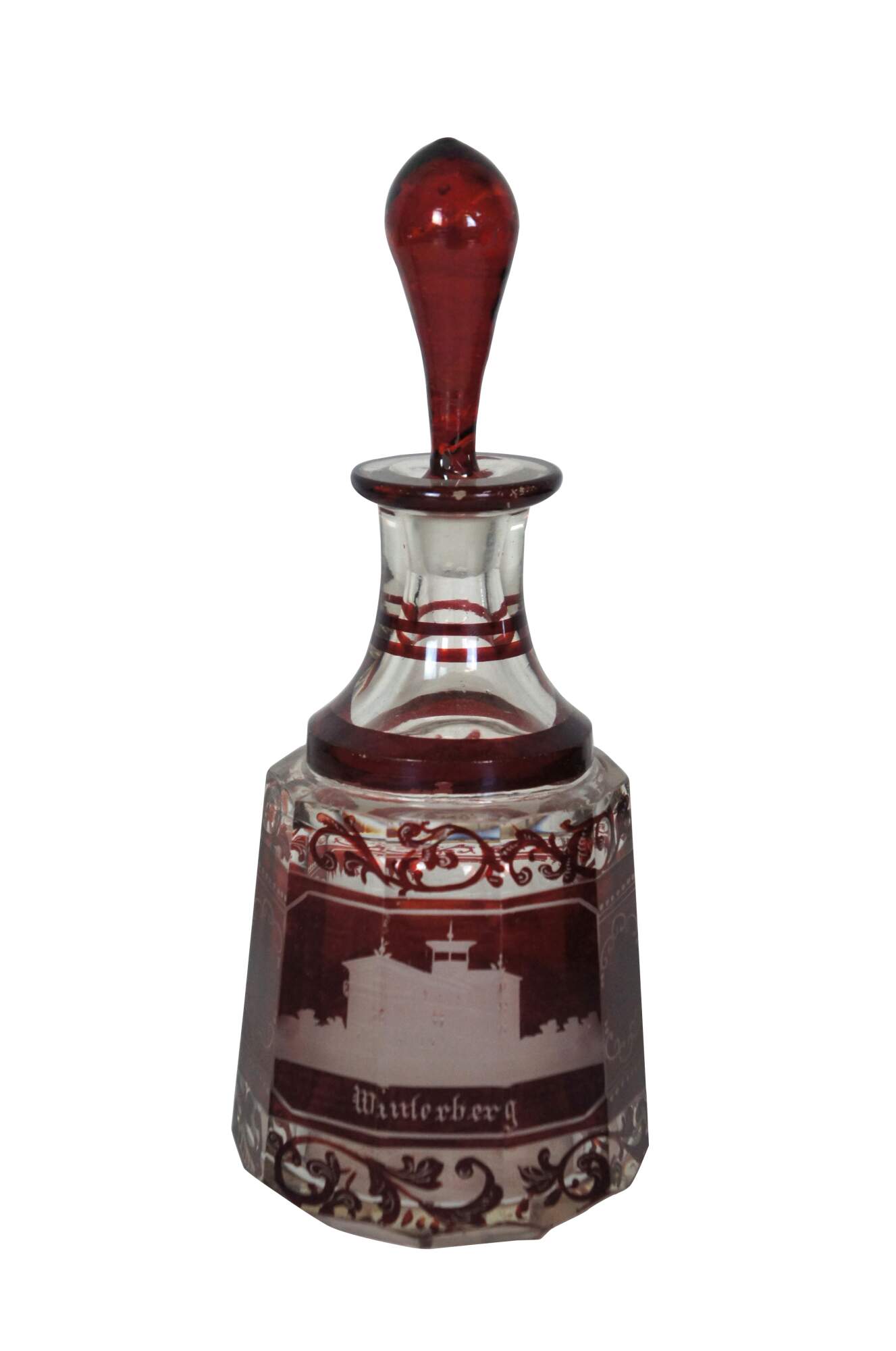 Late 19th to early 20th century Victorian era German / Bohemian flashed ruby glass souvenir goblet and small whiskey or perfume decanter. Goblet features striped faceted sides, a footed base and a floral wreath around the words "Aus Freundschaft" (Out of Friendship). Decanter features a drop / nipple shaped red stopper, and facted sides with a scrolling foliate motif framing views of Winterberg, Germany and the Kuhstall natural stone arch of Saxon Switzerland.