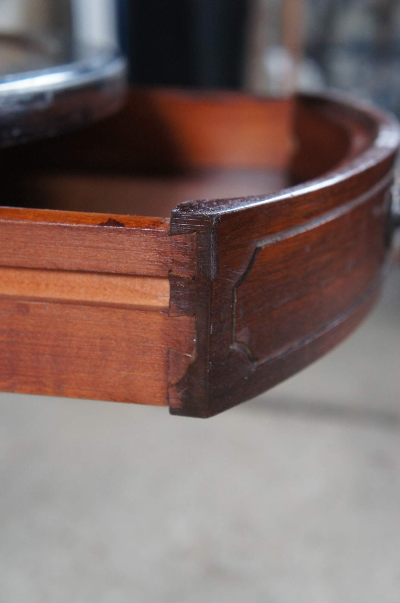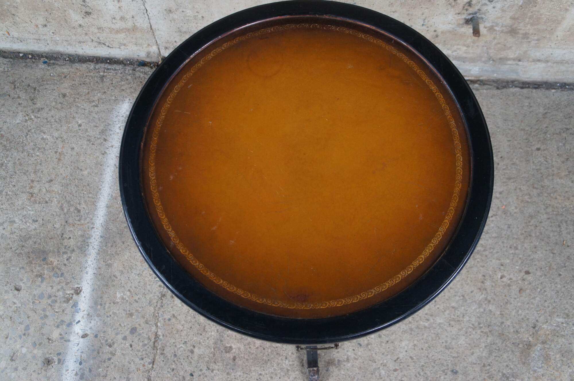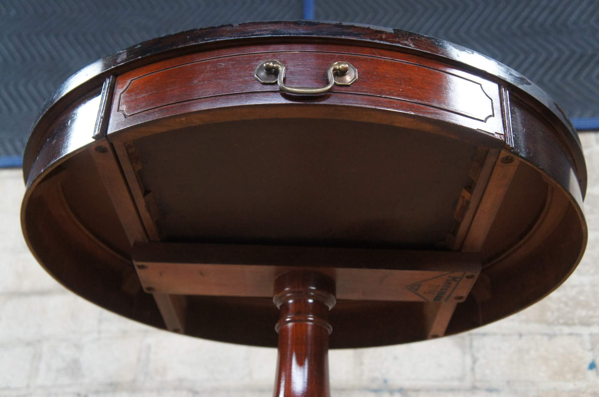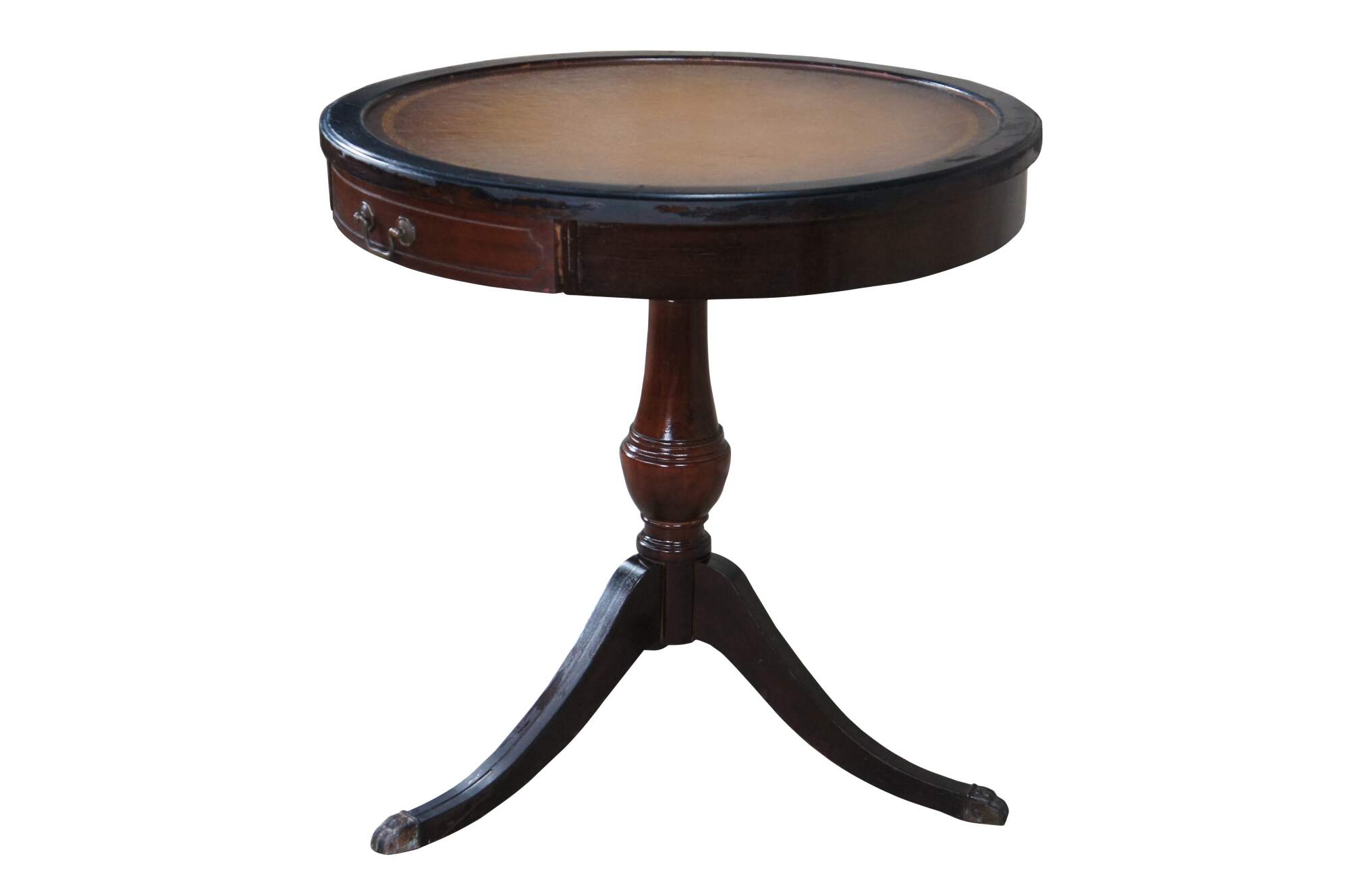 Mid 20th century Mersman side table. Made of mahogany featuring round form with tooled leather top, one drawer, and tri foot pedestal base with brass capped claw feet.