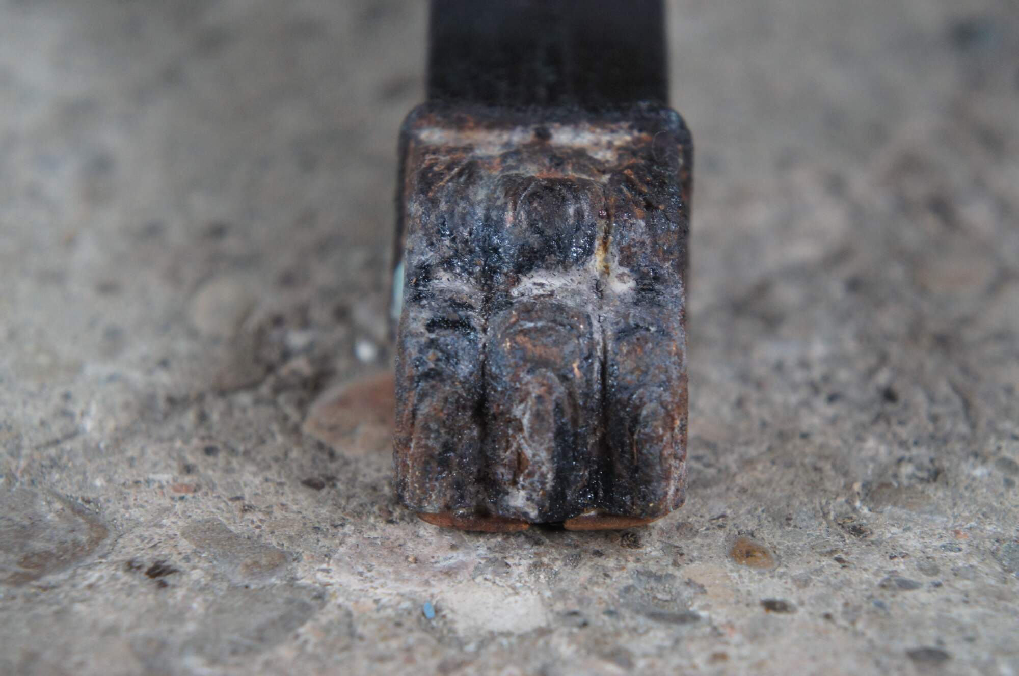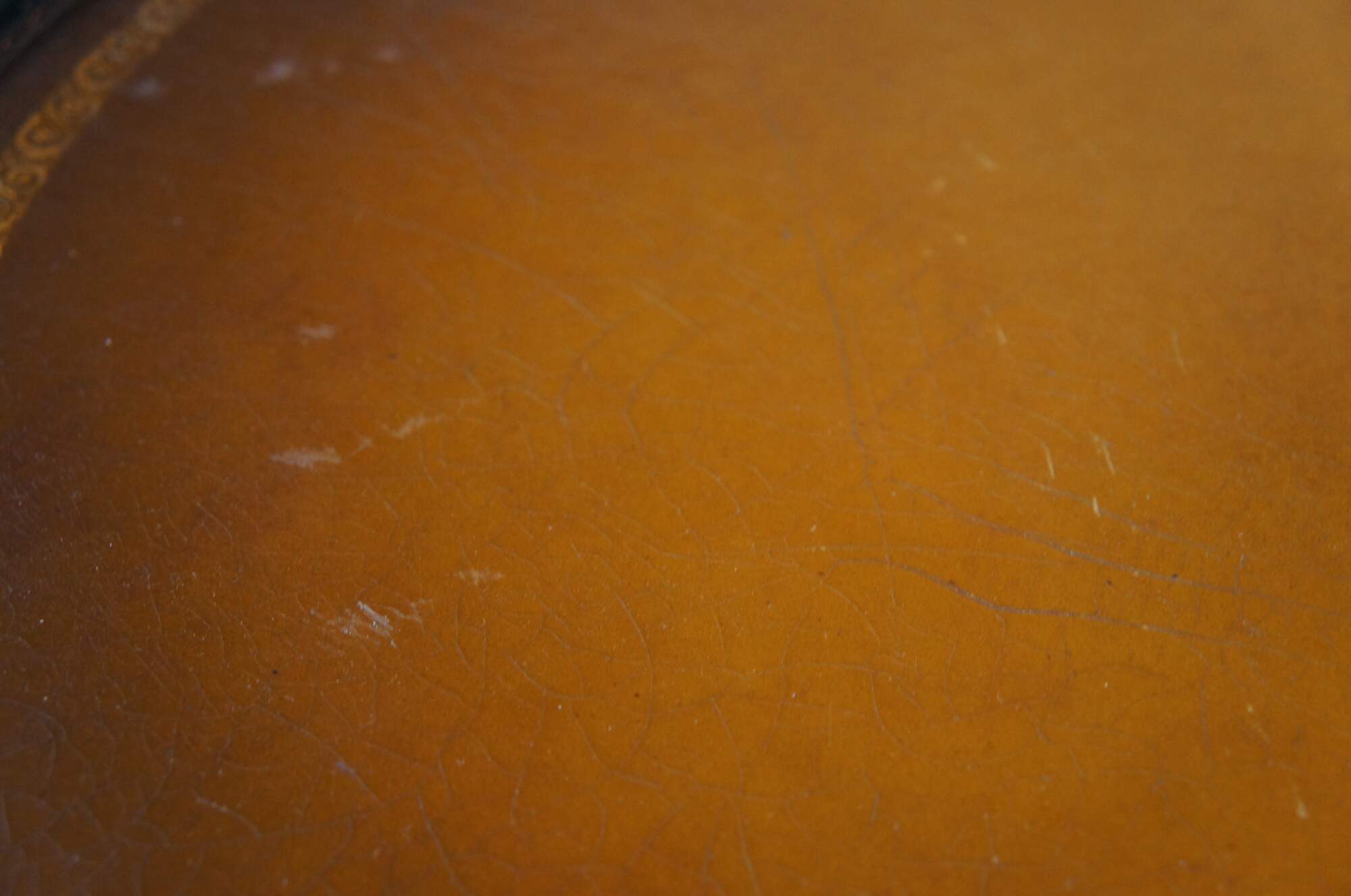Fair condition, wear and distressing commensurate with age and use, finish loss, marking / crazing to leather, missing one brass cap.