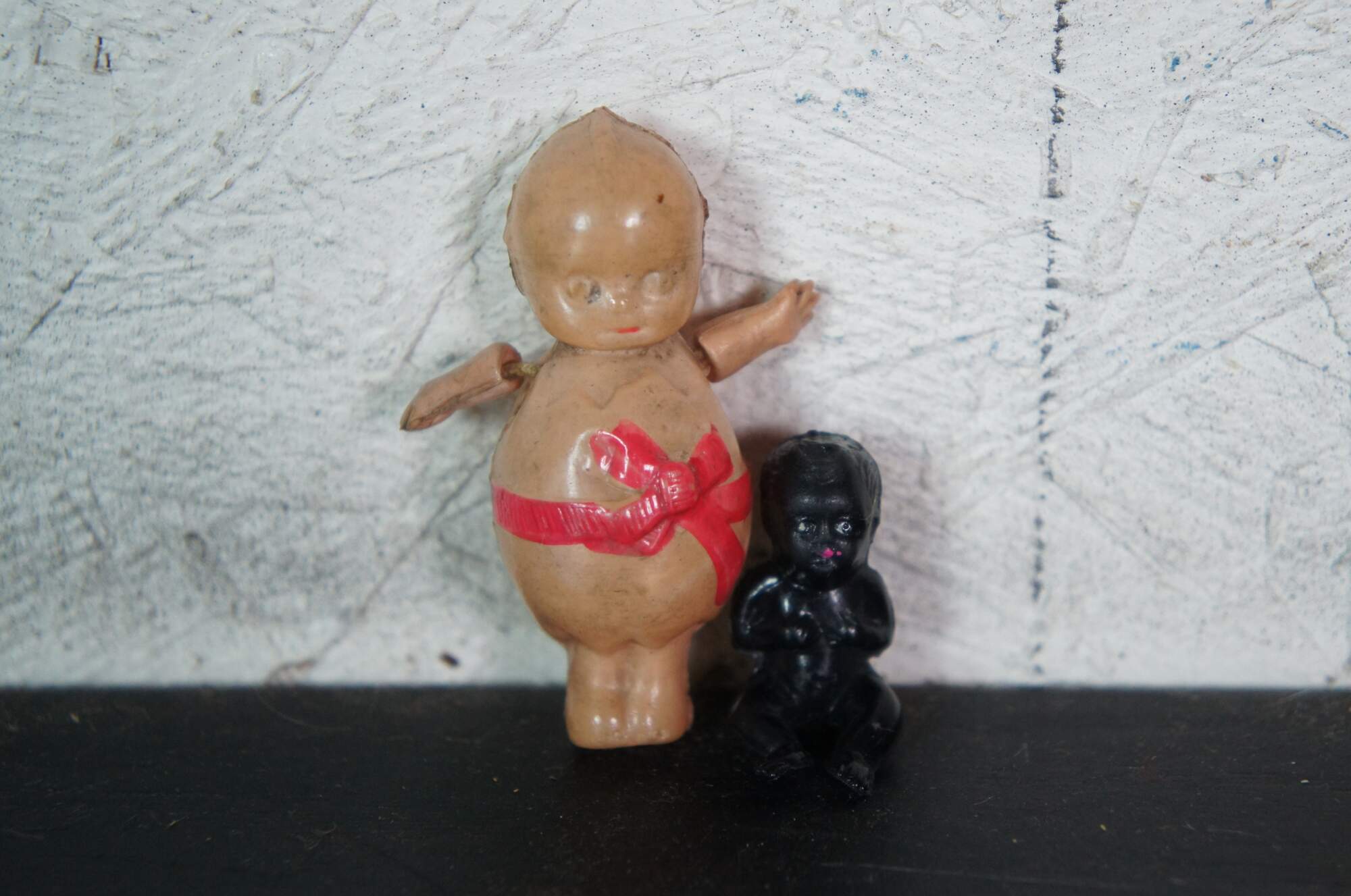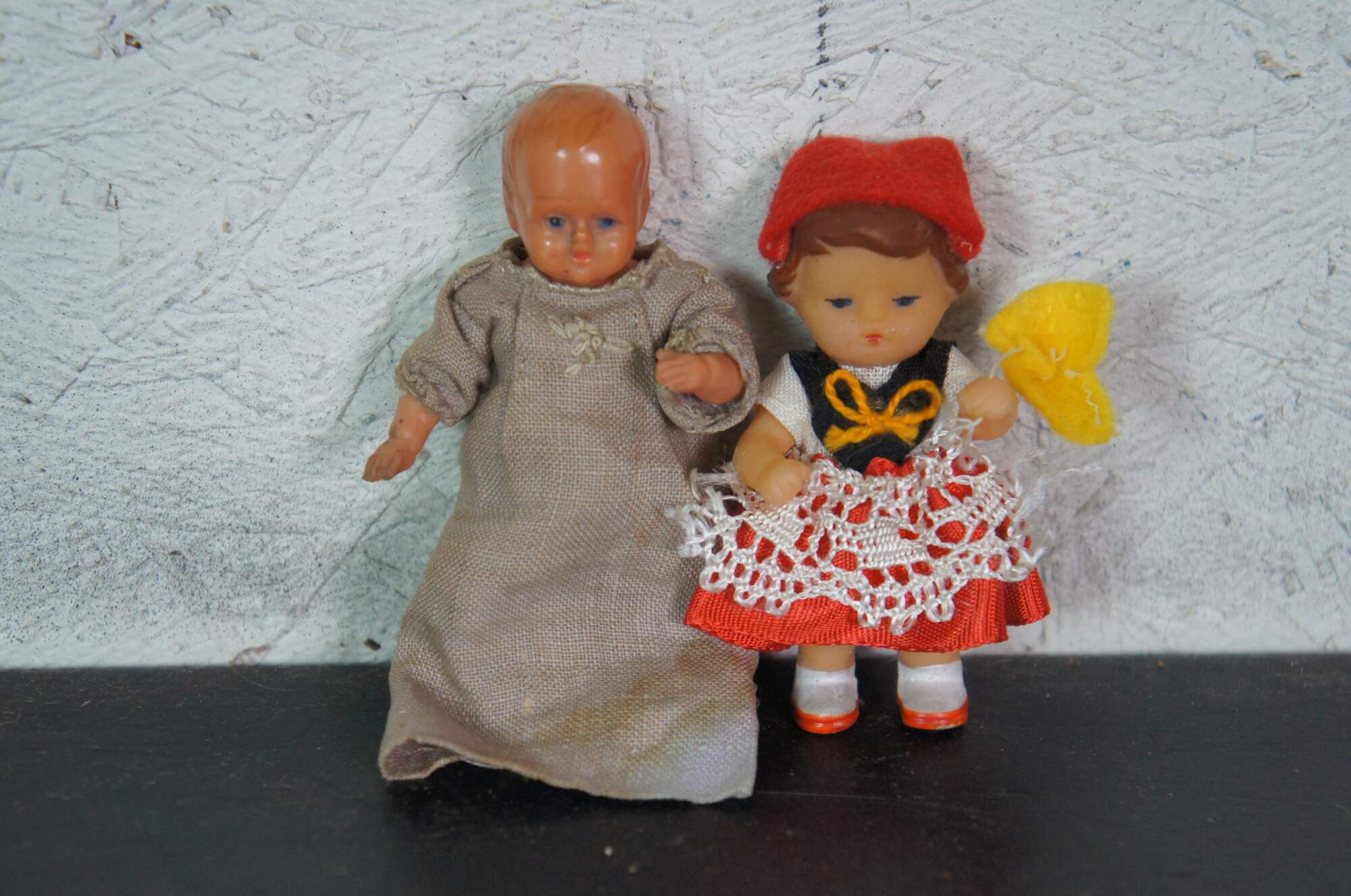 Lot of 12 early to mid 20th century celluloid and composition miniature baby dolls. Five with sleep eyes. Kewpie, Swiss Guard, folk costumes.