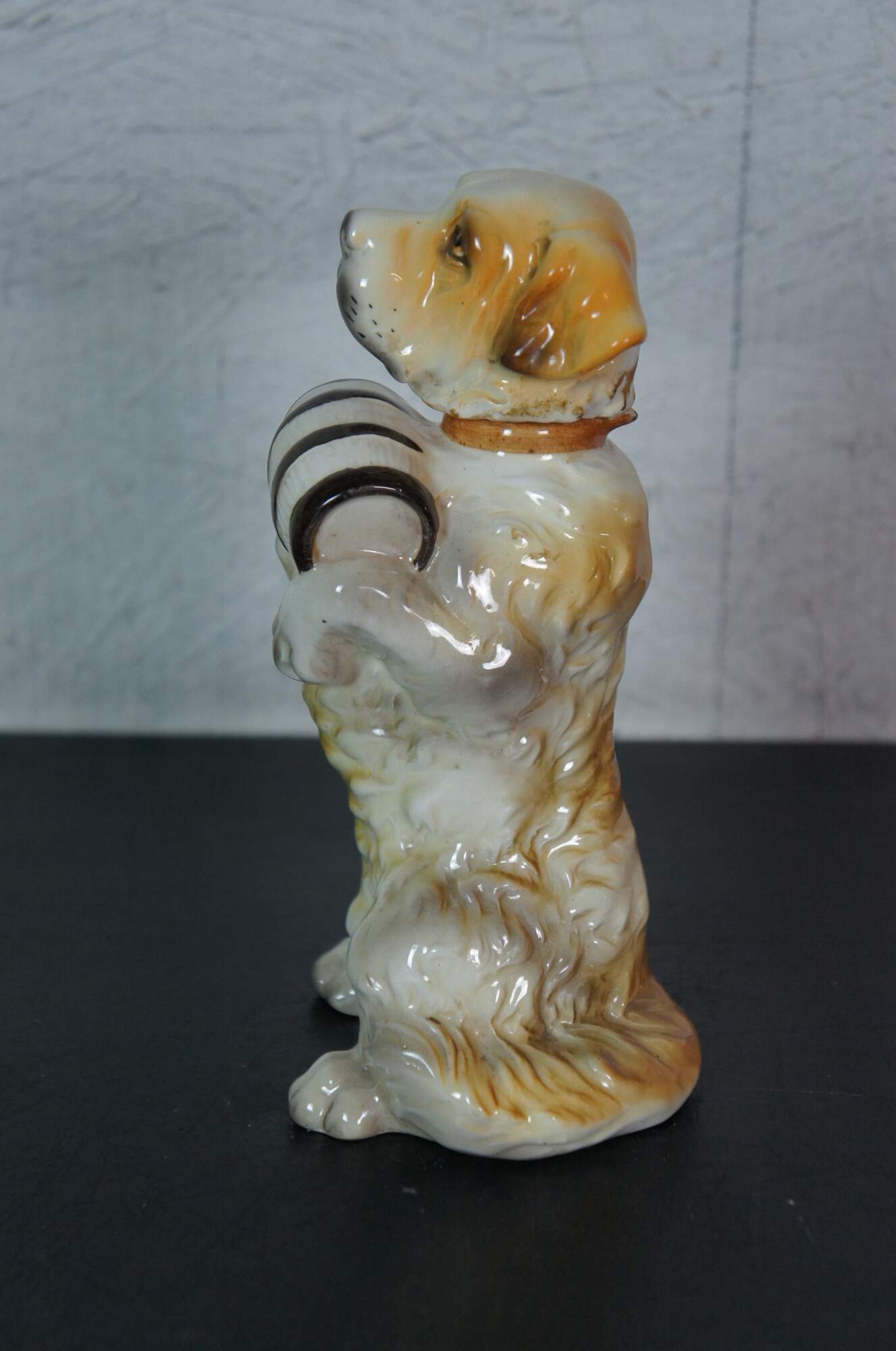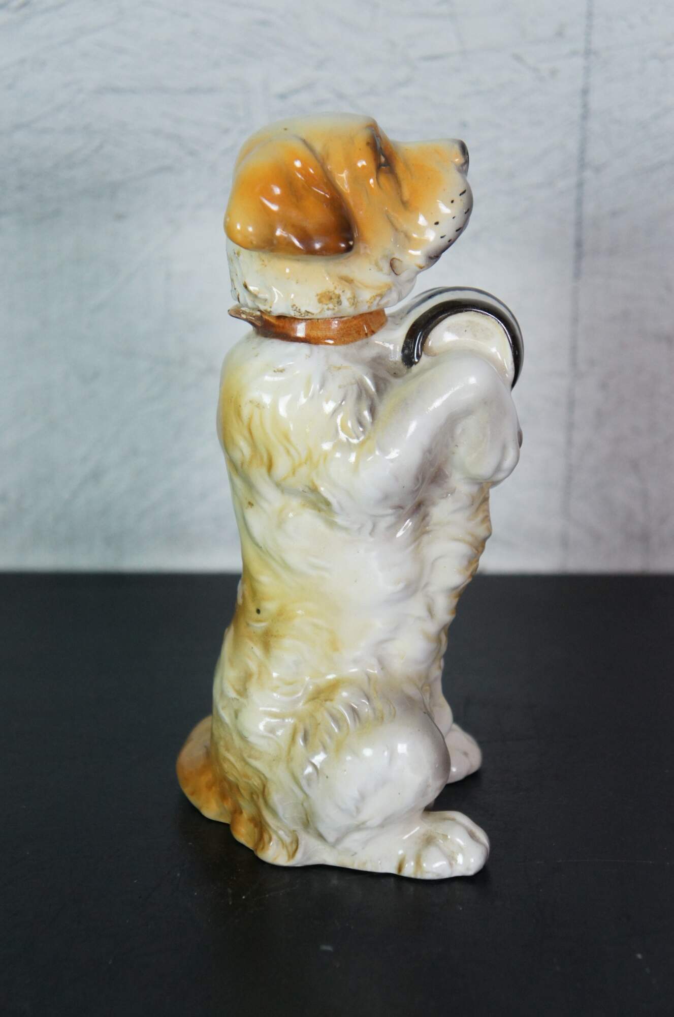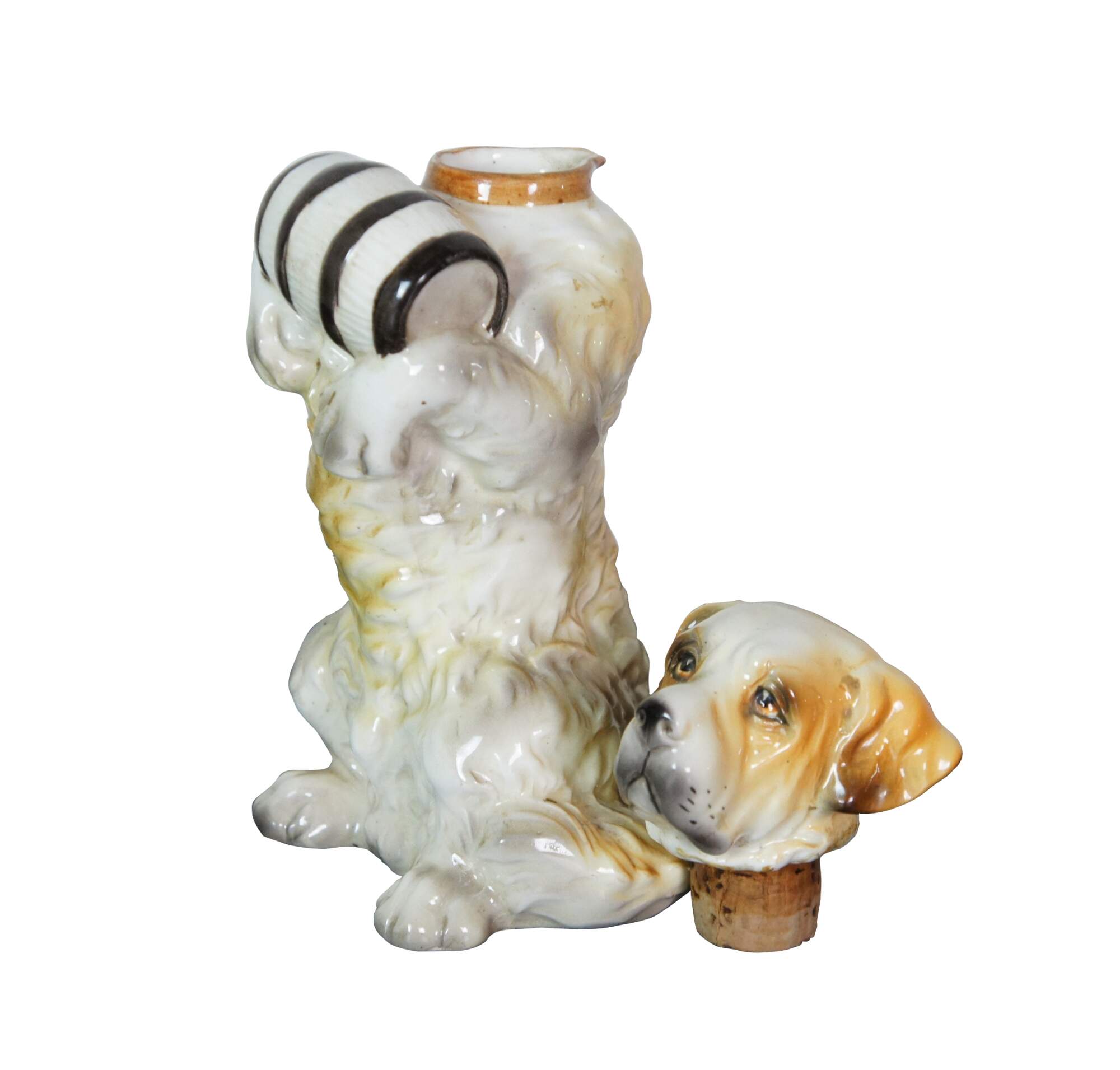 Vintage 1955 ceramic decanter / bottle by Lefton, in the shape of a Saint Bernard dog "sitting pretty" with his front paws supporting a small barrell. Cork stopper attached to head; small pouring lip at back of neck.