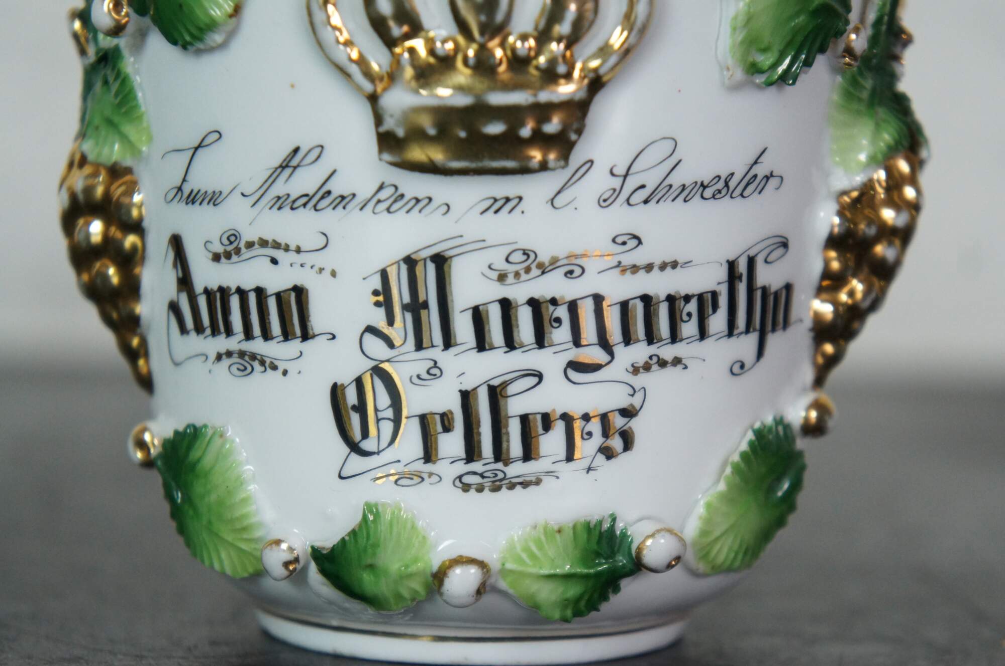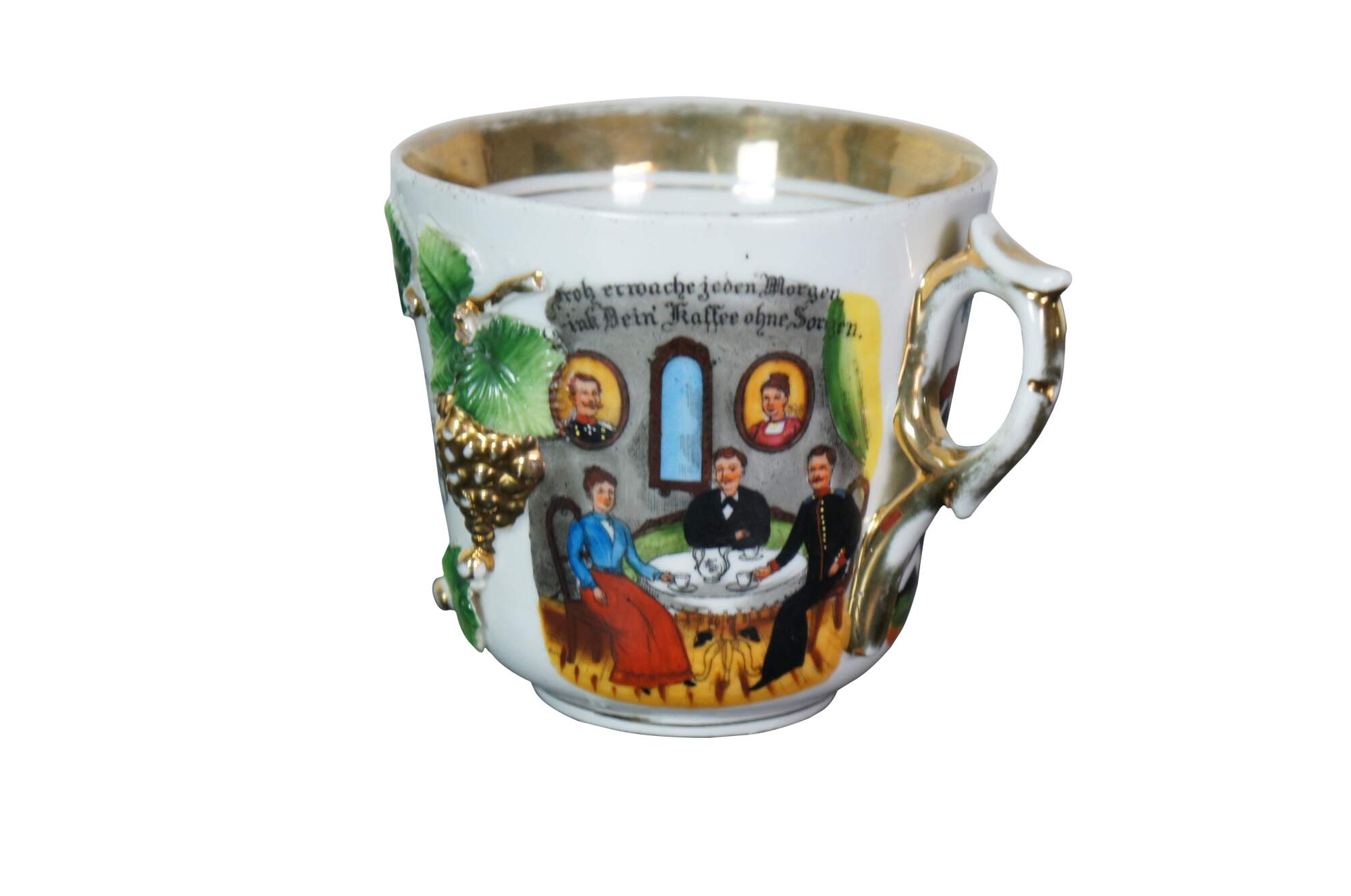 Antique World War I military souvenir / presentation cup / mug - personalized as memnto for a soldier's sister. Molded porcelain with a gilt imperial crown and bunches of leaves and grapes, framing a personalized inscription on the front (approximately "A souvenir for my sister" and a name) and a pair of images / scenes on the sides, with the phrases "Auf einfam stiller Wacht Hab ich an meine Schmester gedacht." (I thought about my sister in a very quiet wake.) and "Froh erroche jeden Morgen Drink Dein Kaffee ohne Sorgen." (Happy to drink your coffee every morning without any worries.)