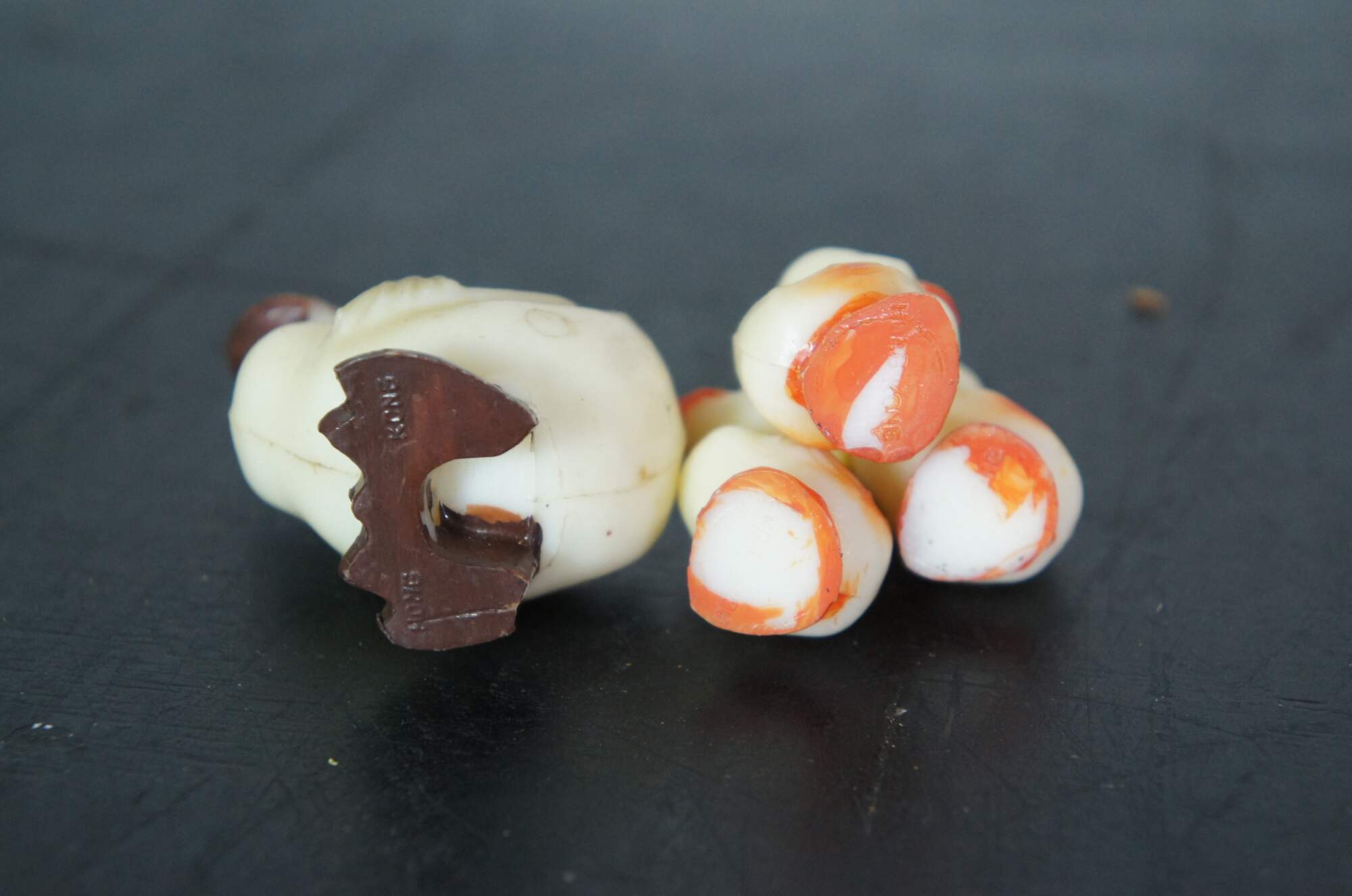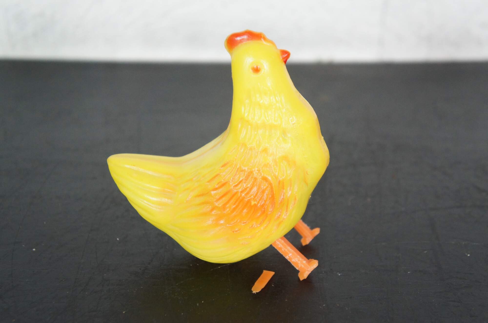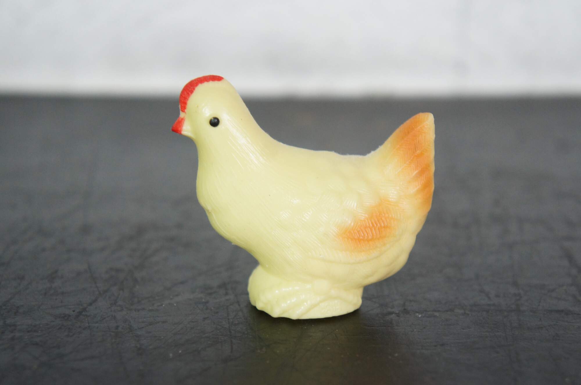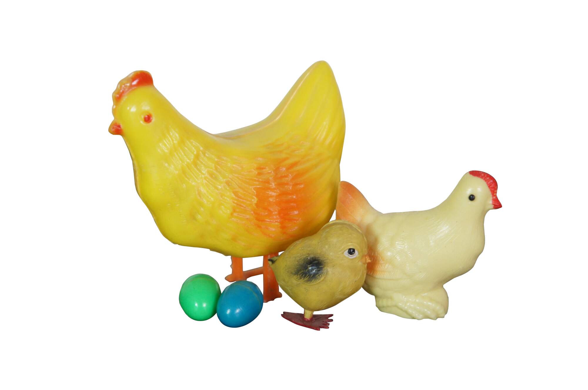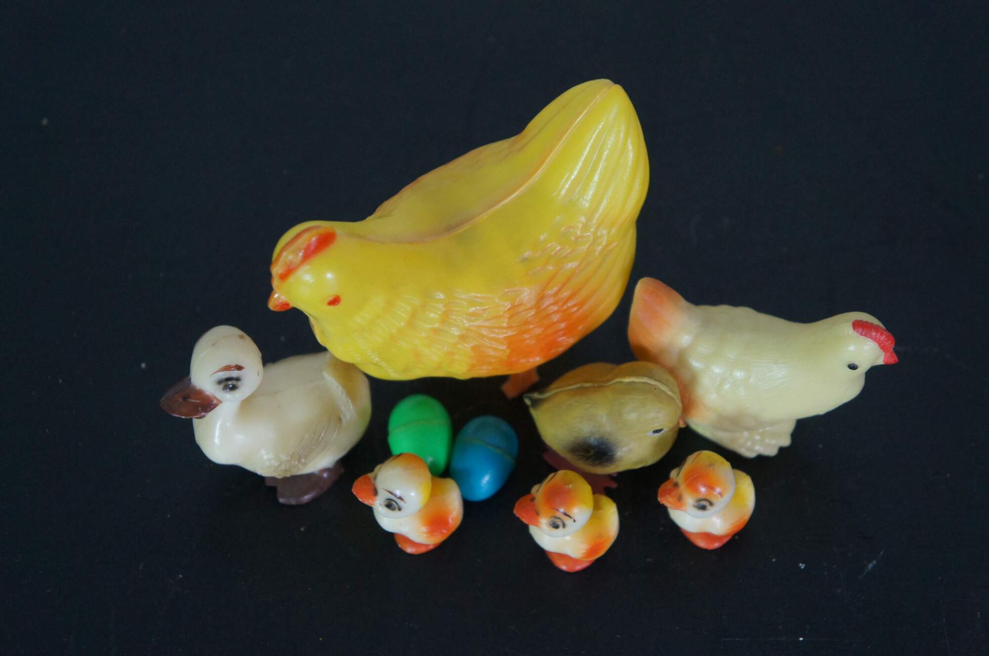 Lot of 6 vintage plastic chickens and ducks. Includes Wilton mother duck and three ducklings, one fat chick, one squeaking chicken, and one egg laying chicken with two eggs.