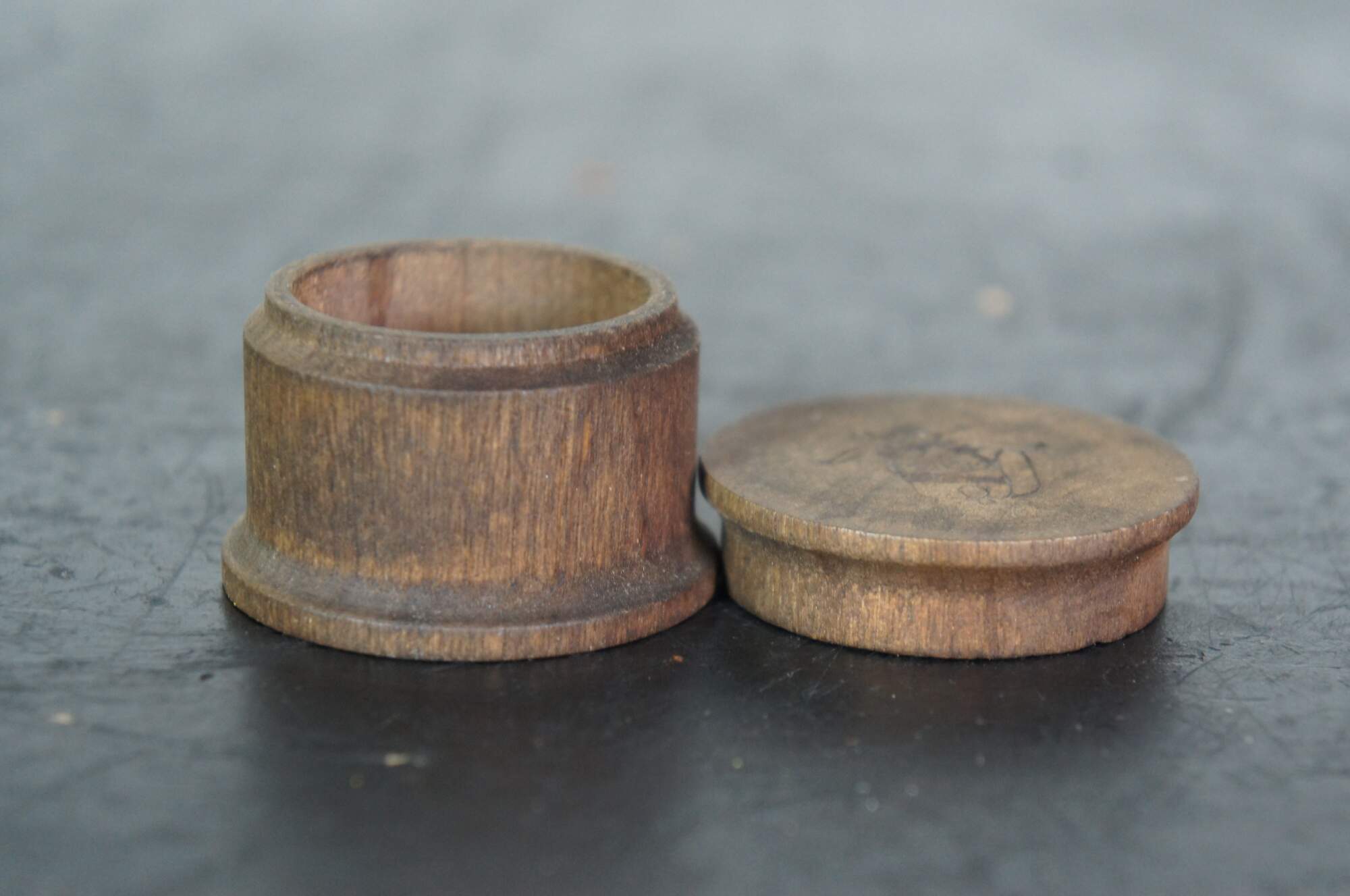 20th century wooden trinket / keepsake / pill box - round form with flared base and lid, carved with the image of a Turkish / Cossack soldier with comical oversized nose and mustache.