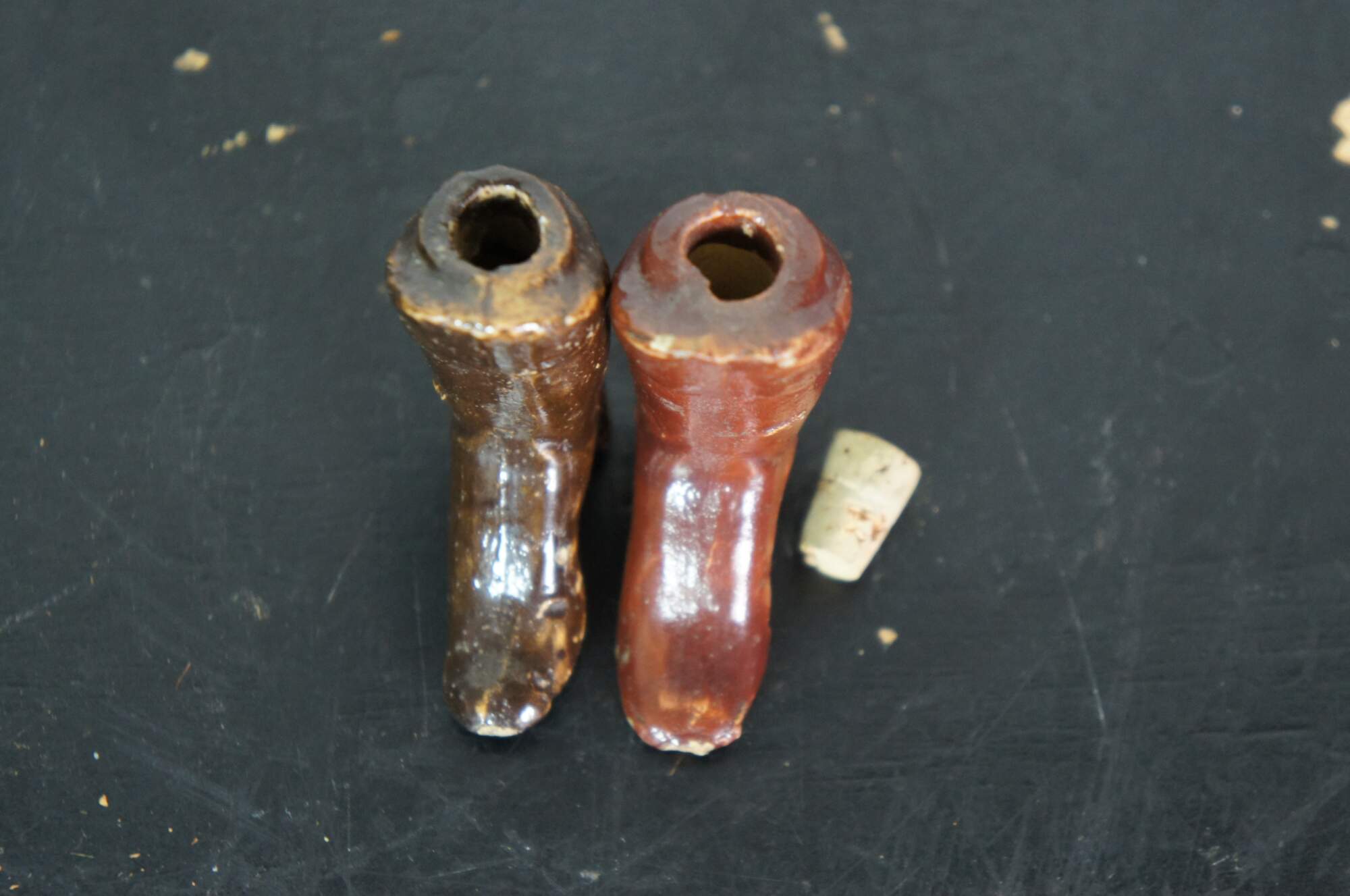 Pair of antique American Western / Southwestern stoneware miniature snuff bottles / salt shakers in the shape of tall heeled cowboy boots, glazed in two shades of brown.