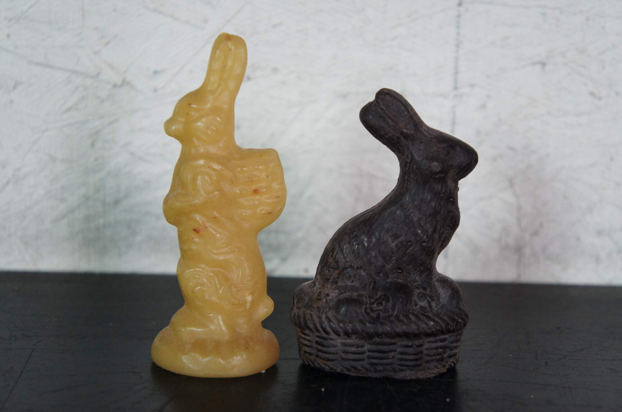 Pair of early 20th century Easter Bunny / rabbit figurines - one in undyed beeswax, standing on its haunches with a basket on its back; the other colored brown to imitate chocolate, seated in a basket of eggs - and one half of a tin chocolate or cookie mold showing a seated rabbit on a rectangular plinth.