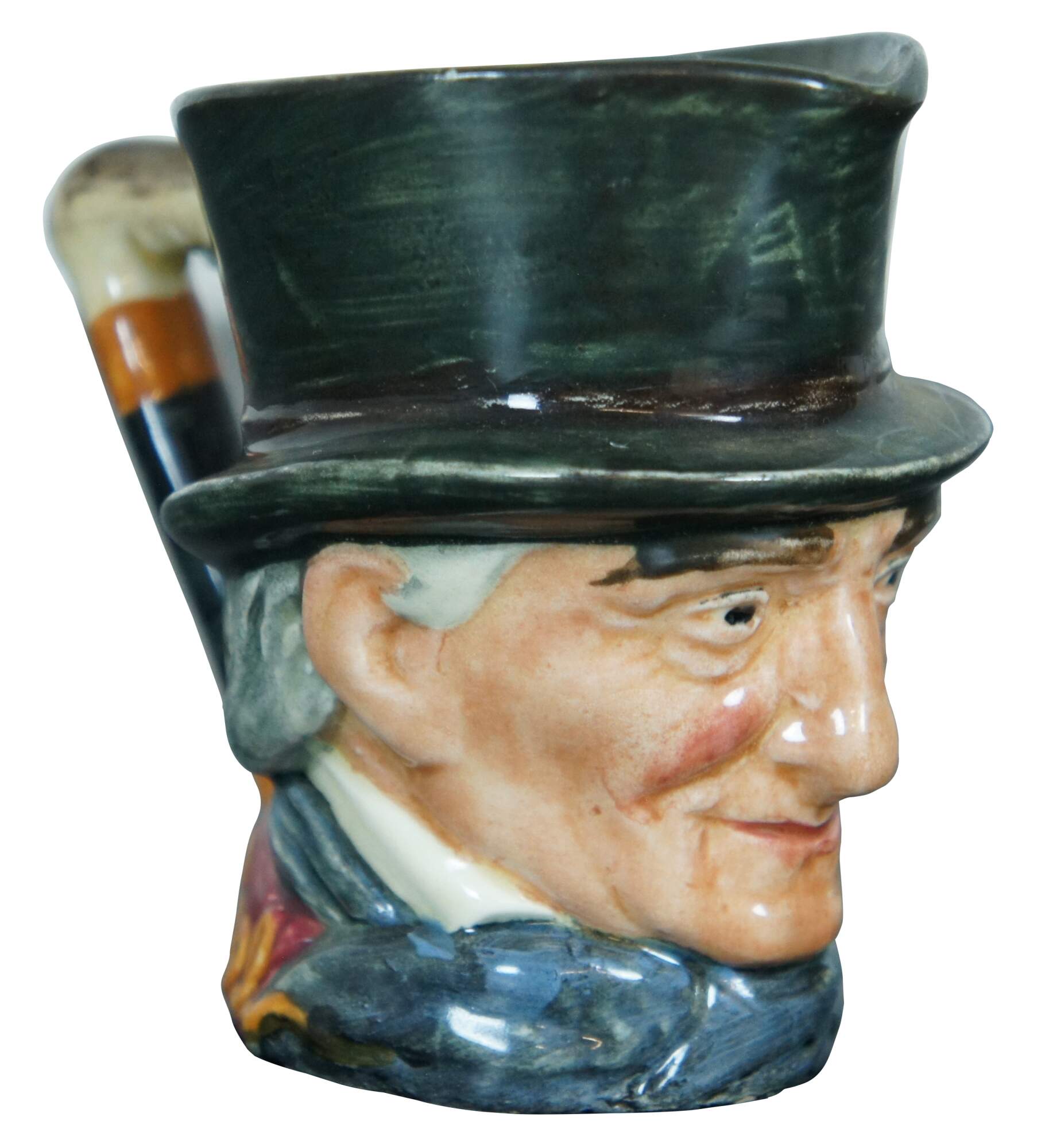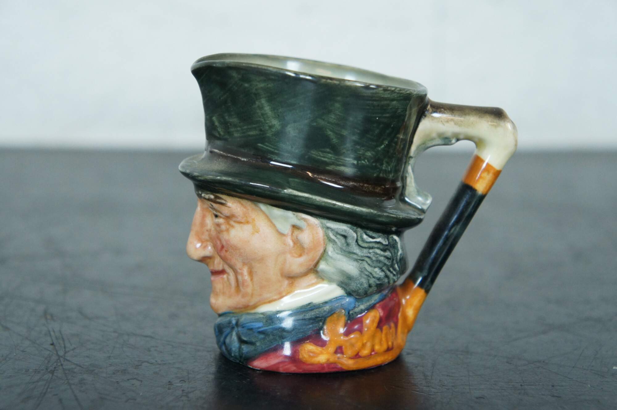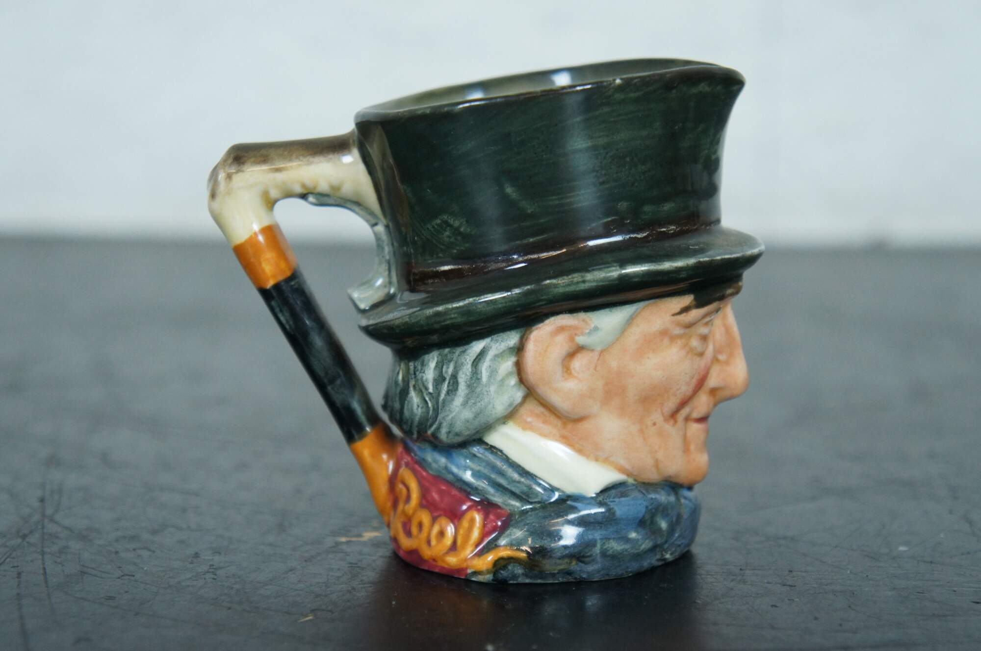 Mid Century Royal Doulton porcelain miniature Toby jug / character mug in the shape of John Peel. “John Peel (13th November 1776? – 13 November 1854) was an English huntsman who is the subject of the nineteenth century song "D'ye ken John Peel" - "ken" meaning 'to be aware of' or 'to know' in some dialects of the North of England and Scotland. a famous Cumberland hunting song written around 1824 by John Woodcock Graves (1795–1886) in celebration of his friend John Peel (1776–1854), an English fox hunter from the Lake District. The melody is said to be a contrafactum of a popular border rant, "Bonnie Annie." A different version, the one that endures today, was musically adapted in 1869 by William Metcalfe (1829–1909), the organist and choirmaster of Carlisle Cathedral. The tune etymology has a long history that has been traced back to 1695 and attributed to adaptations – one in particular, from the 20th century, the 1939 jingle, "Pepsi-Cola Hits the Spot.