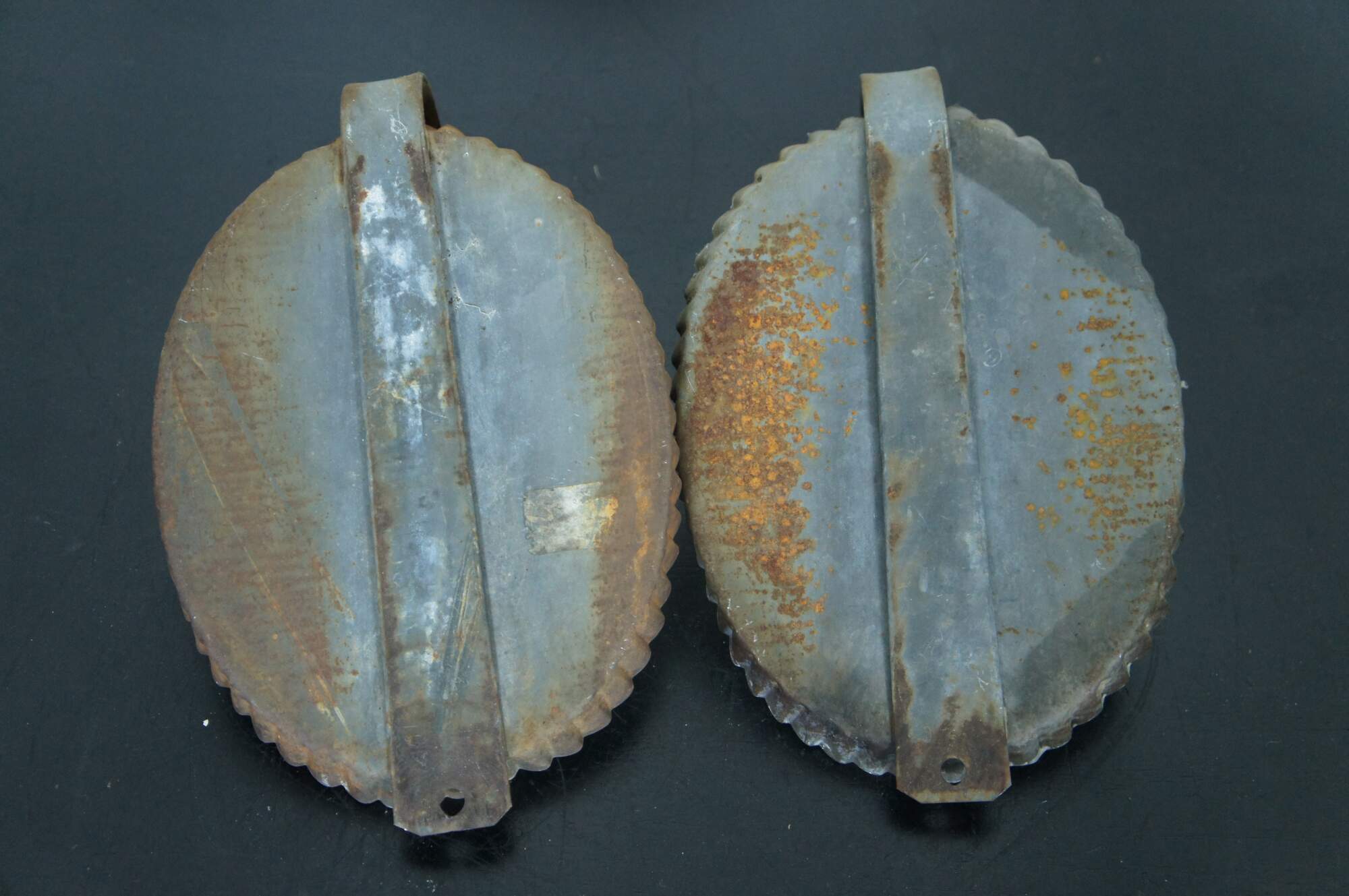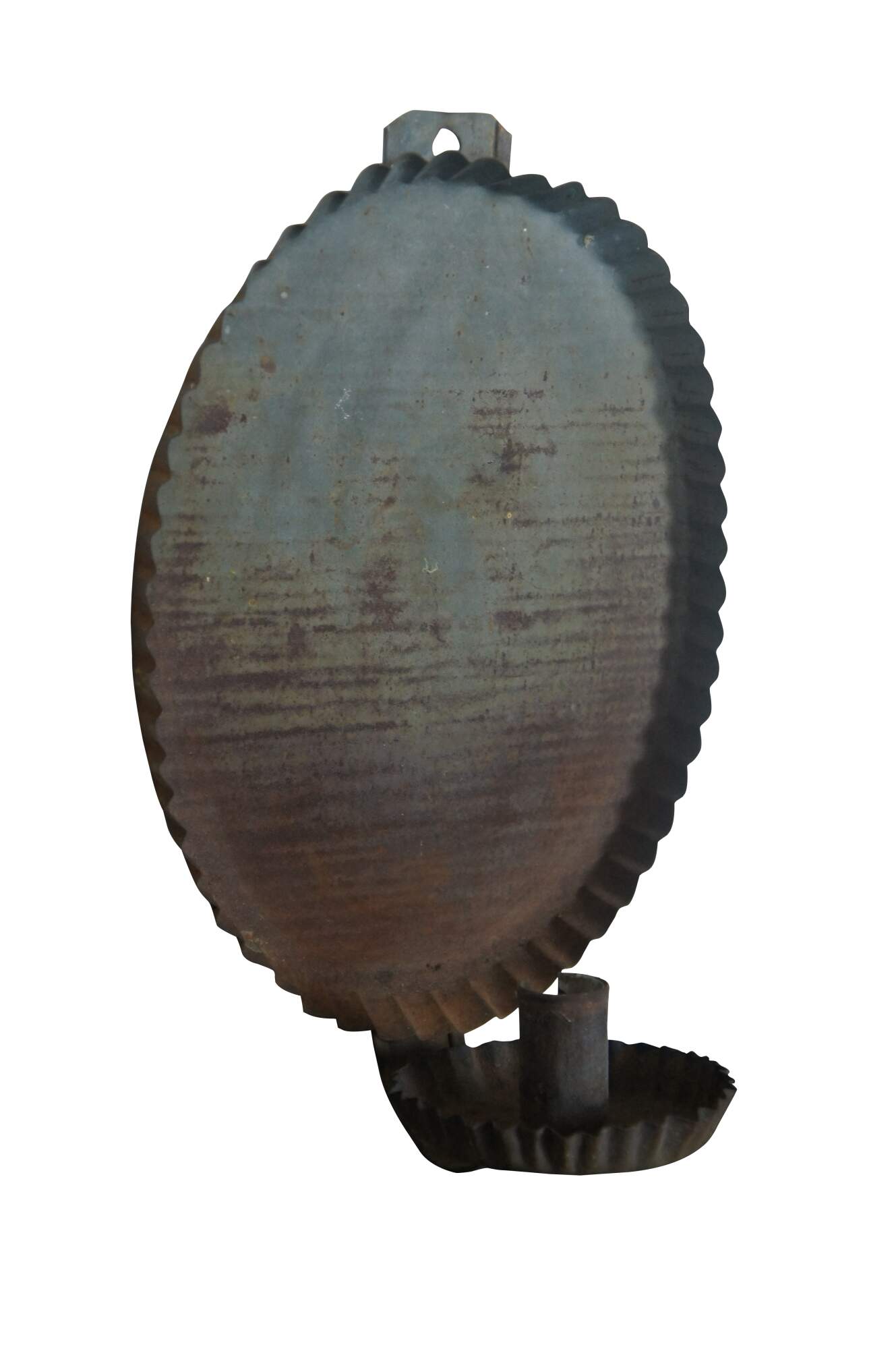 Pair of antique tin wall sconces with candle holder and drip pan. Each is neatly designed with a pie crust crimped edge.