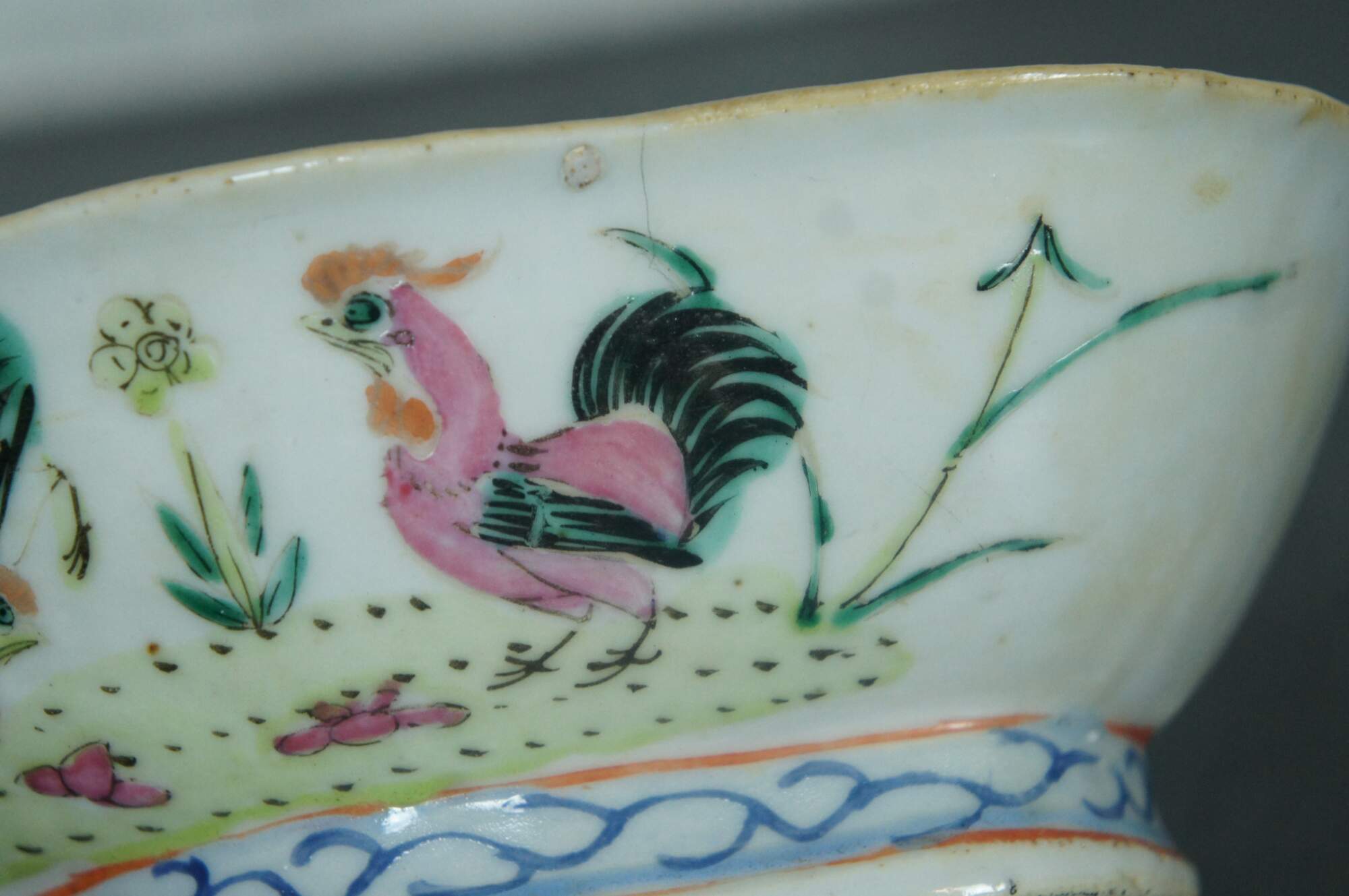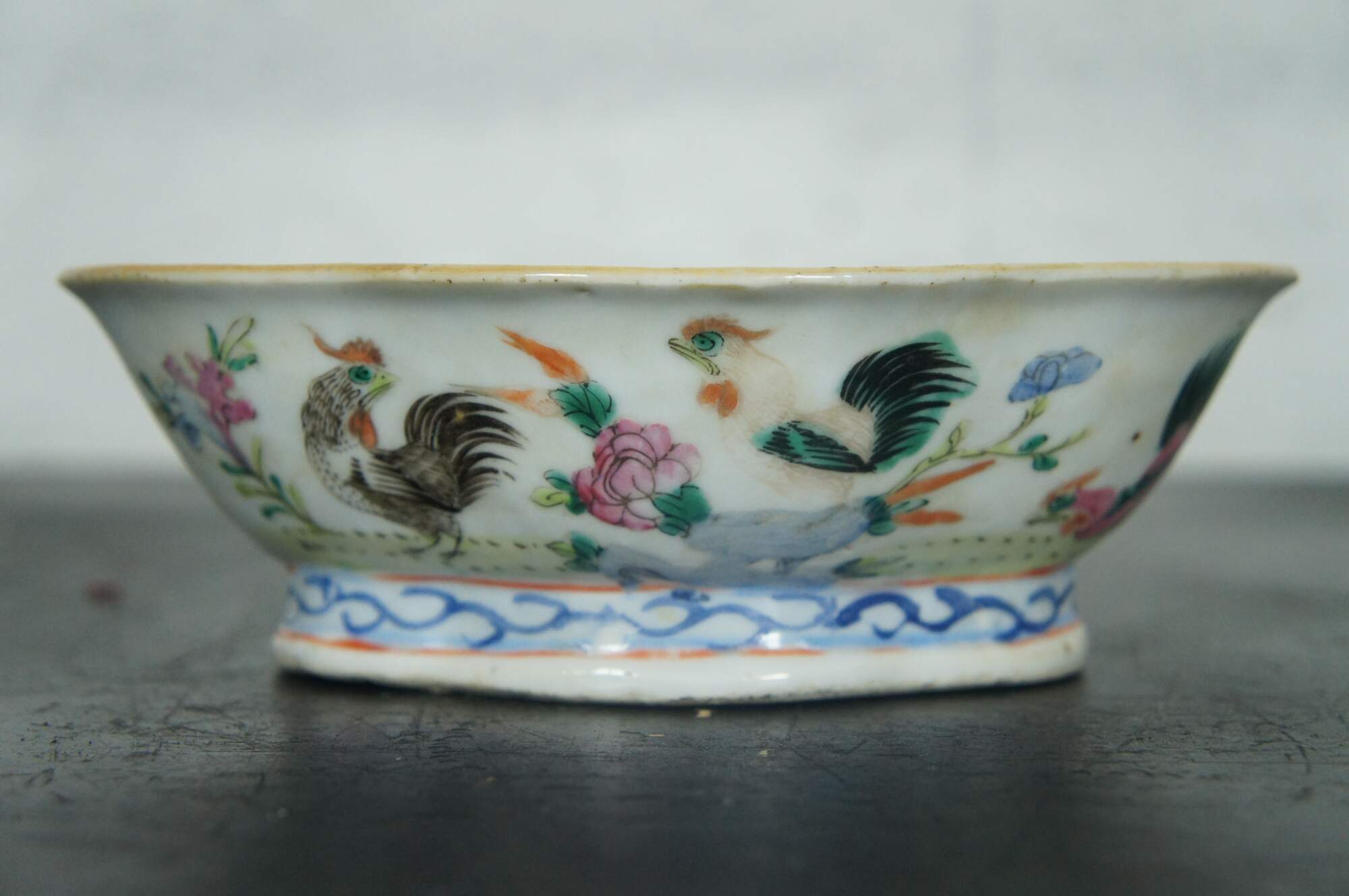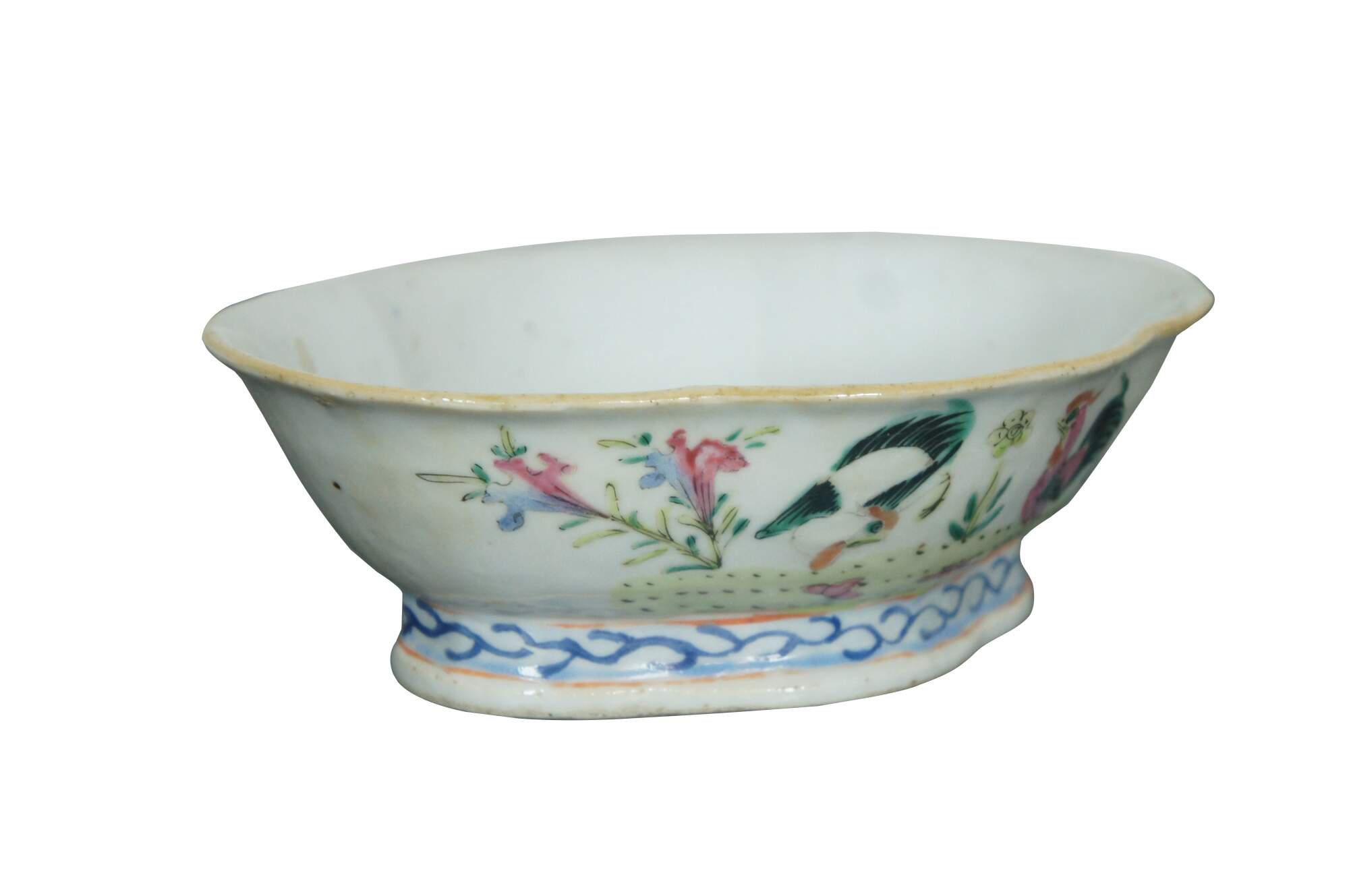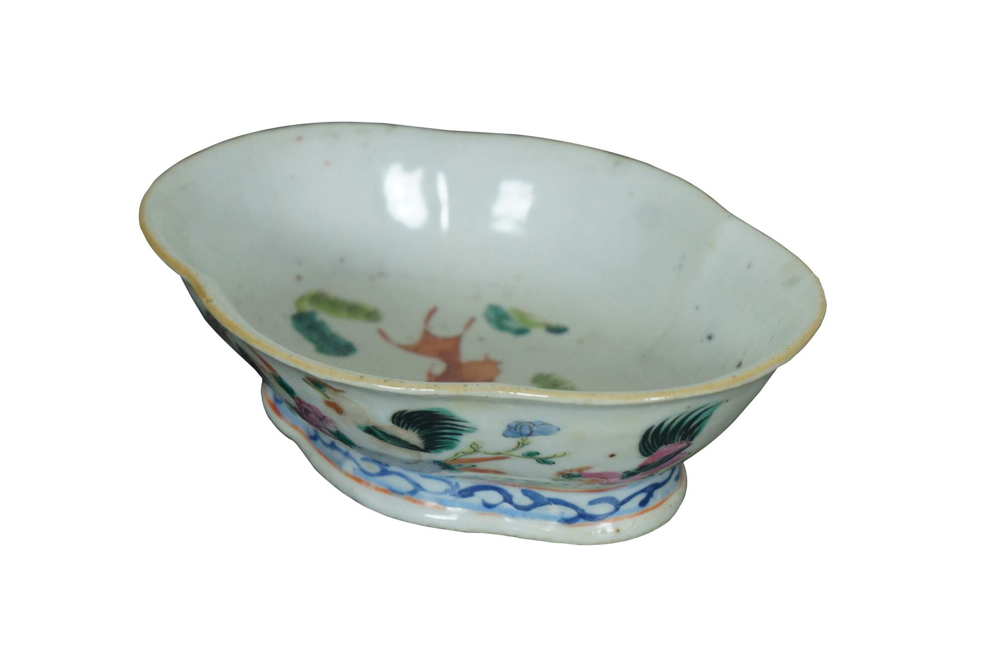 An impressive mid 19th century Chinese Export Bowl. Made from porcelain with polychrome rooster and hen design. Features a lobed / scalloped shape with footed base. The interior is features a koi fish design. Great for serving or display. Stamped along underside