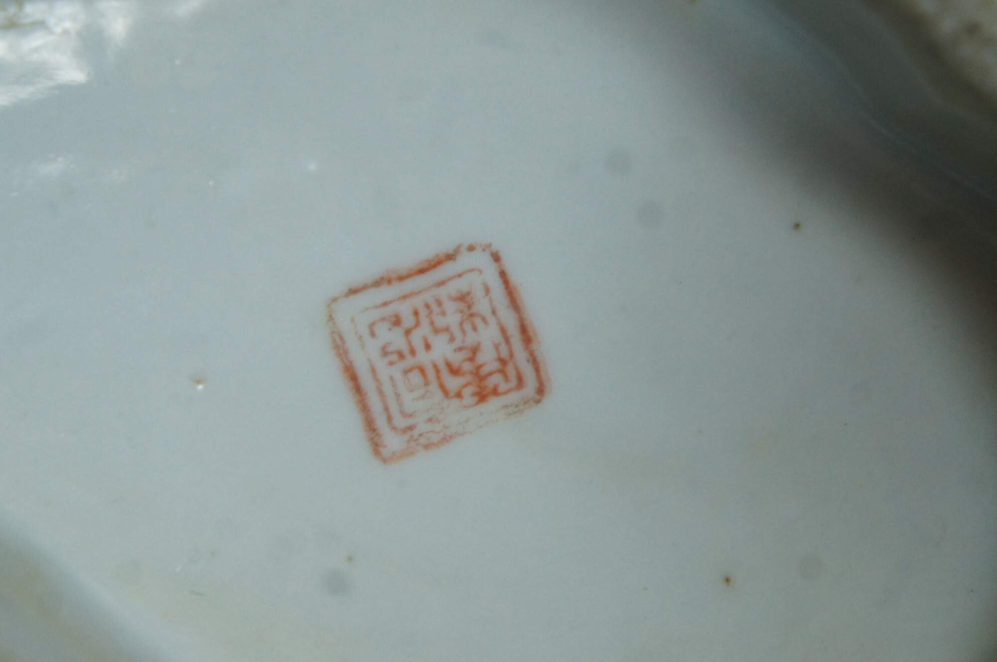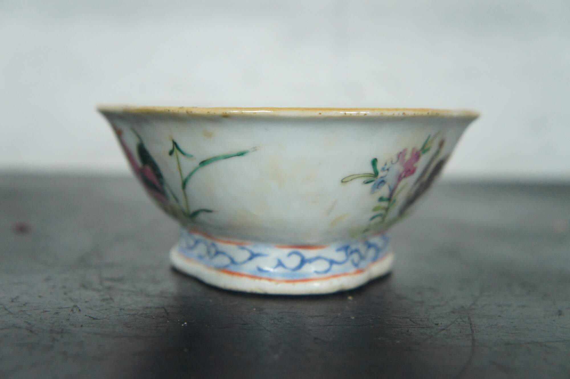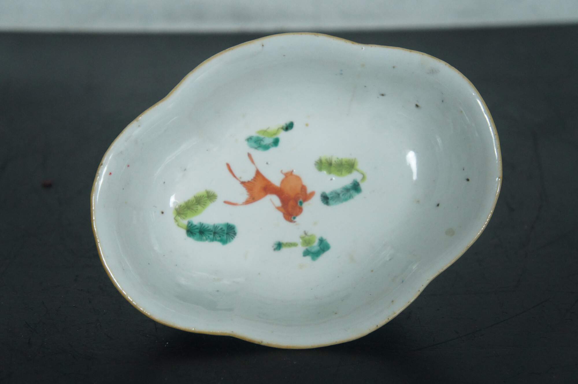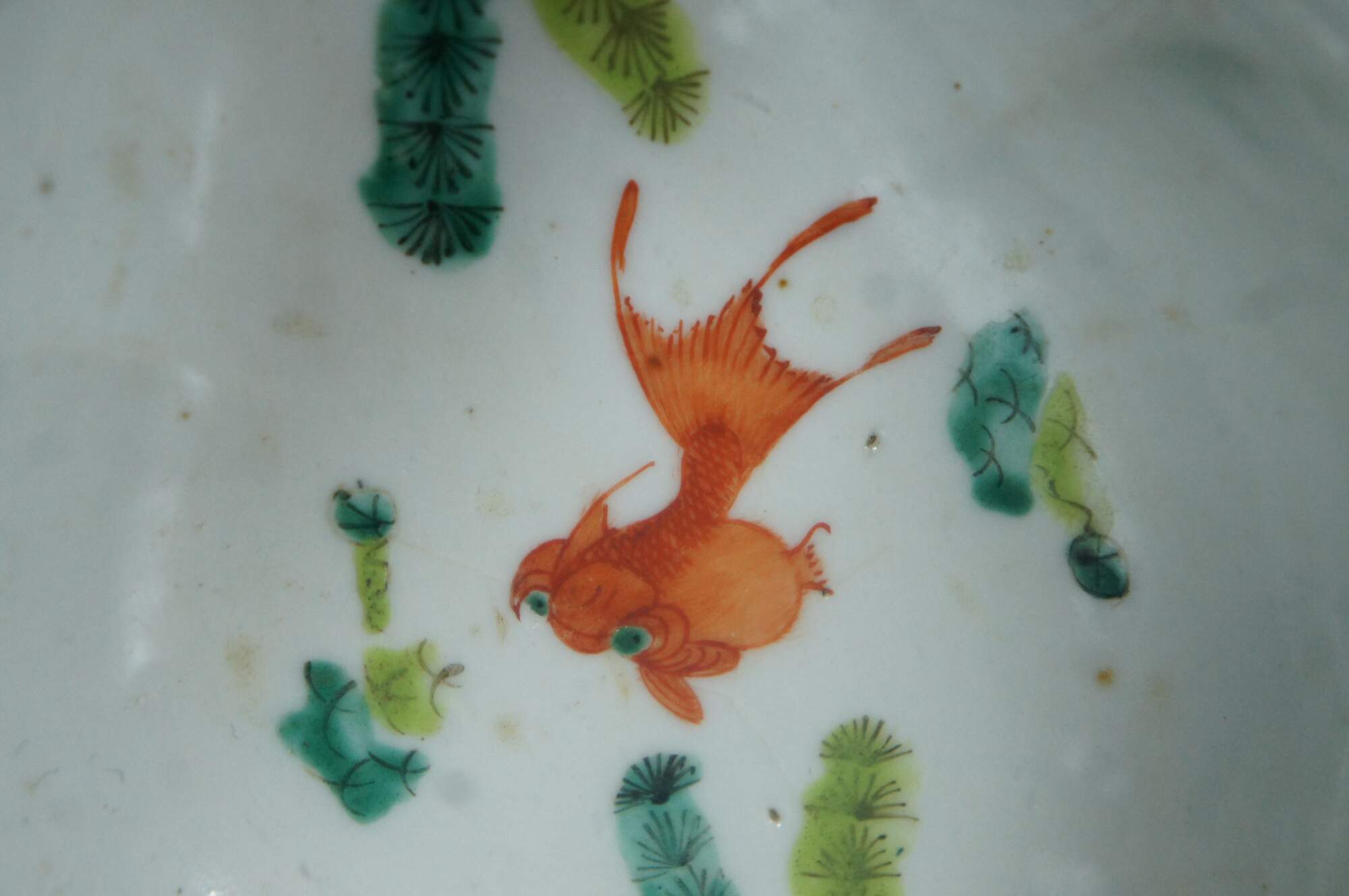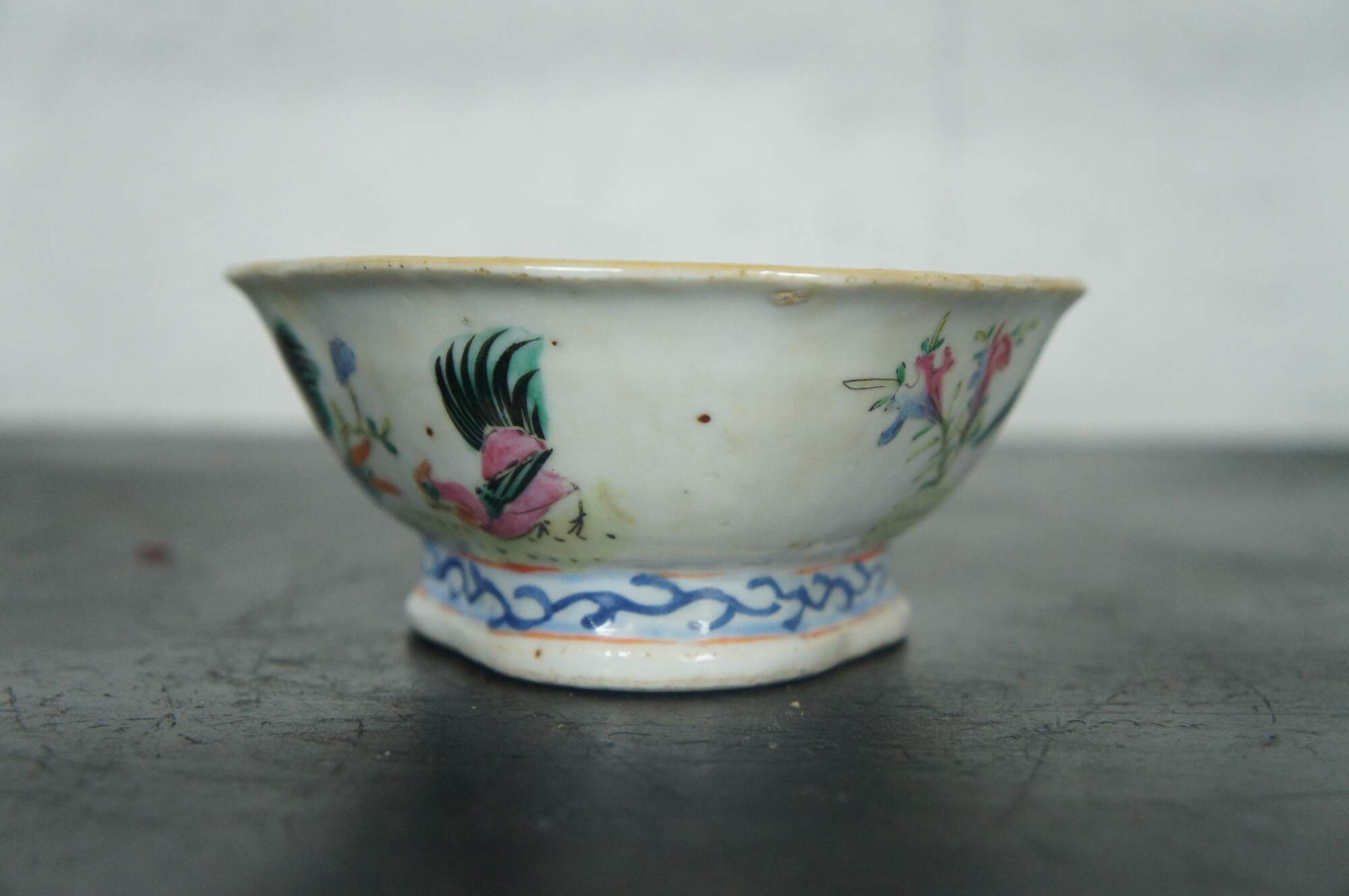 An impressive mid 19th century Chinese Export Bowl. Made from porcelain with polychrome rooster and hen design. Features a lobed / scalloped shape with footed base. The interior is features a koi fish design. Great for serving or display. Stamped along underside
