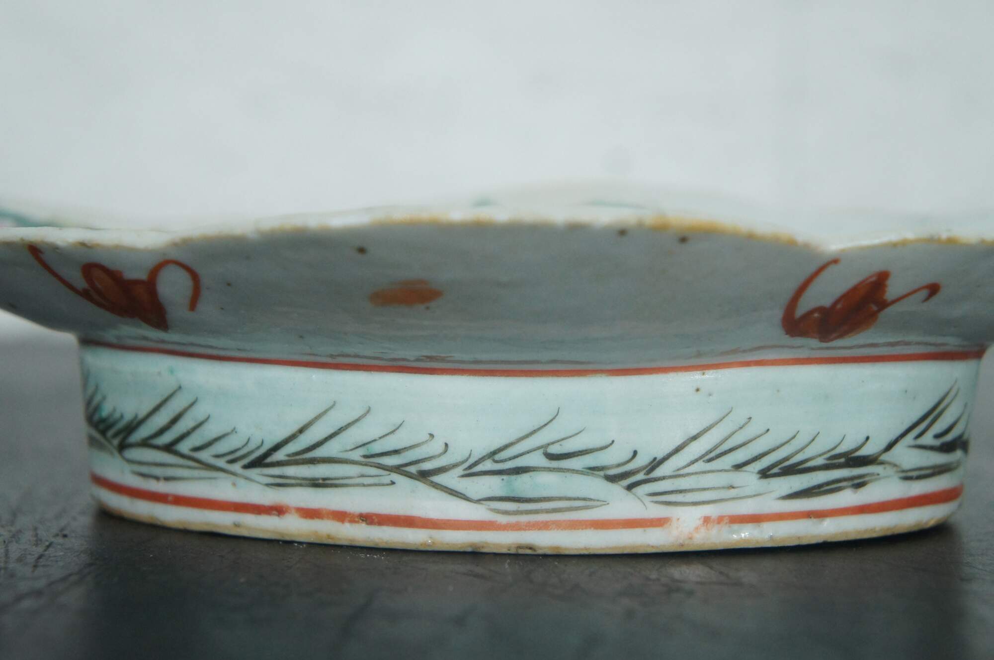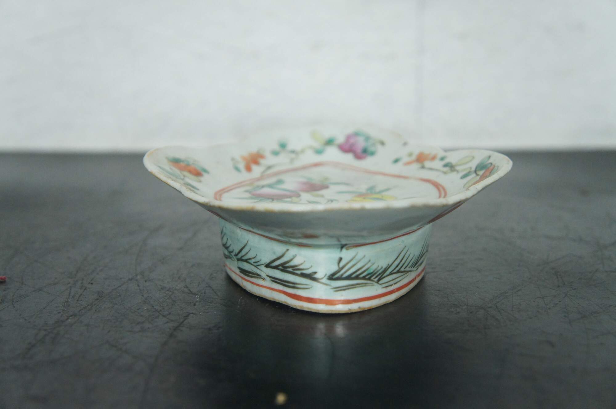 Antique early 20th century Chinese famille rose porcelain tazza / chop suey / footed altar dish with a scalloped oval edge, decorated with pink, orange and yellow flowers.