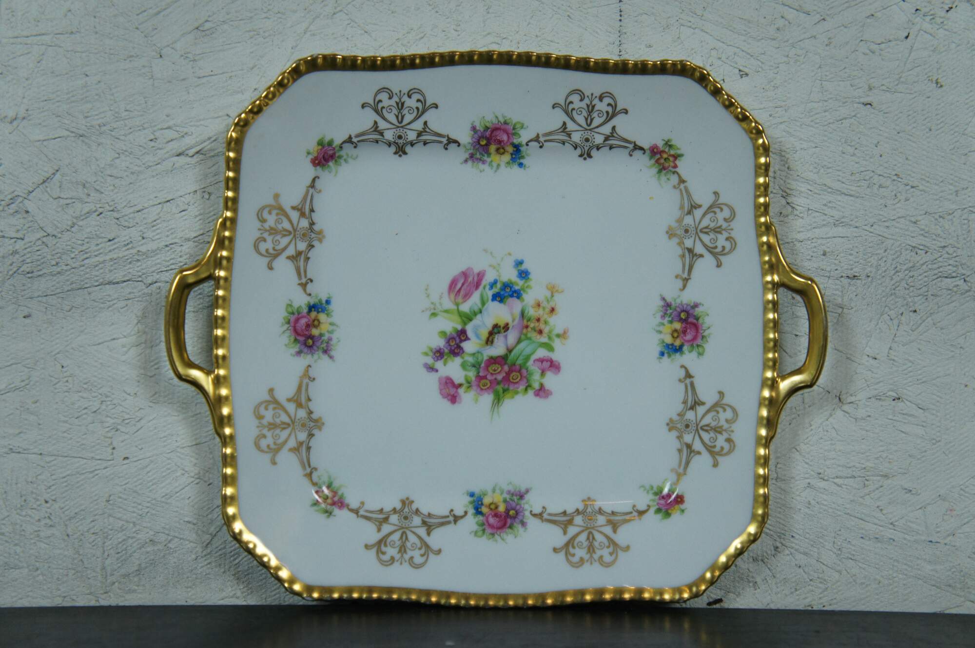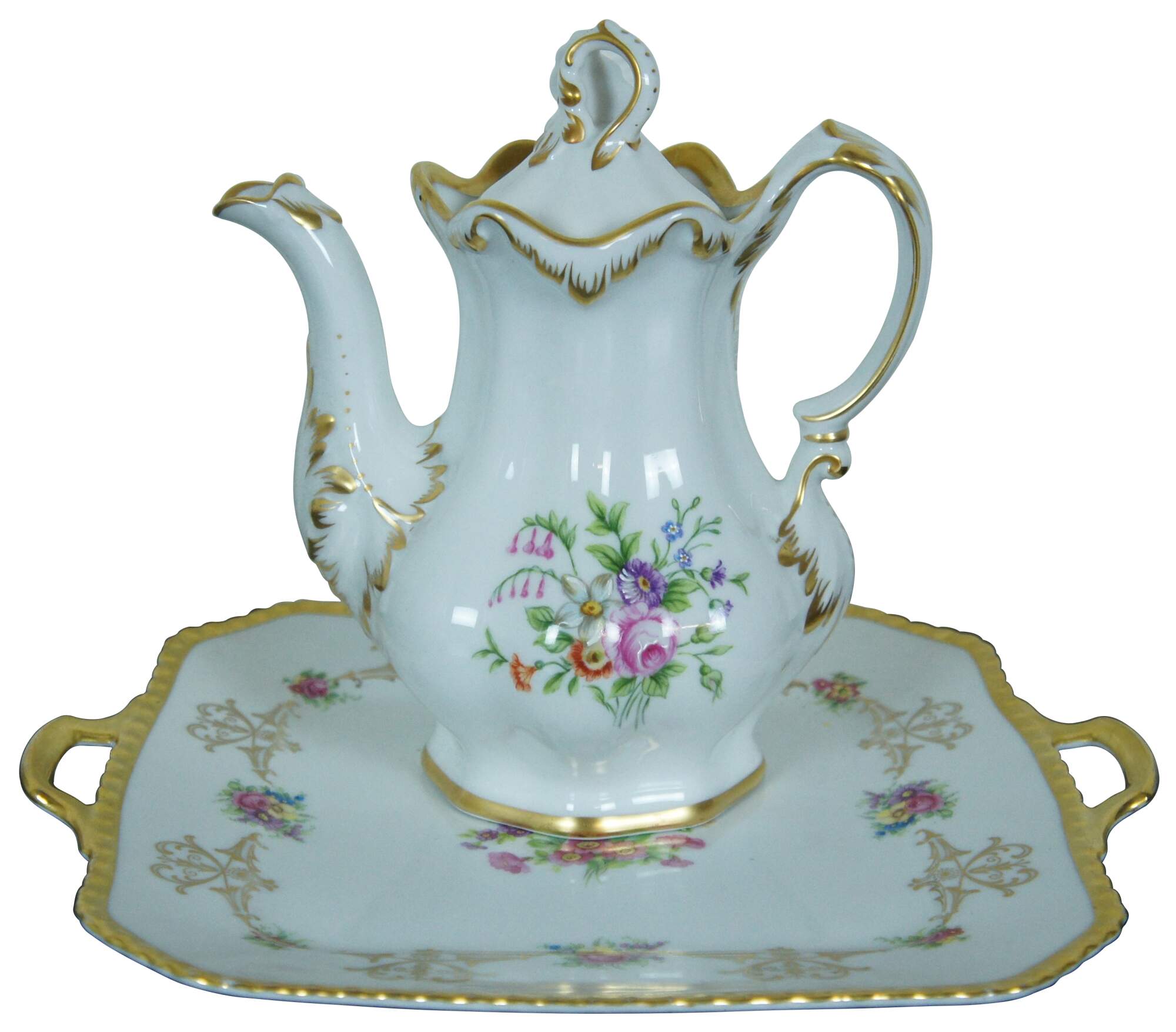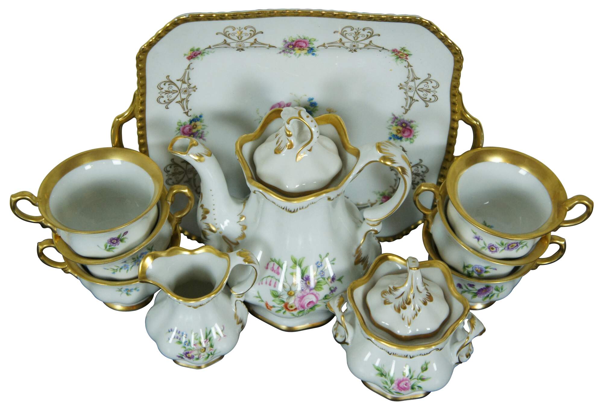 Early to mid 20th century exquisite twelve piece gilded floral tea set including a lidded teapot, creamer, lidded sugar bowl, six teacups, and dessert serving tray. Dessert tray by Royal Bayreuth Bavaria. Tea set by Kobenhavns Porcellains Maleri. "Royal Bayreuth is the name of a factory that was founded in Tettau, Bavaria, in 1794. It closed in 2019. It made figural and souvenir items from about 1885 to 1915, but its most important products have been tableware and coffee and tea sets. The marks have changed through the years. A stylized crest, the name Royal Bayreuth, and the word Bavaria appear in slightly different forms from 1870 to about 1919. Later dishes may include the words U.S. Zone (1945–1949), the year of the issue, or the word Germany instead of Bavaria." "The Copenhagen Porcellain Decorating Workshop was founded in 1883. In 1924 it was acquired by the wholesaler company Holst & Knudsen. Holst & Knudsen imported to Denmark whiteware porcelain from Germany and decorated it.The Great Depression made difficult importing cheap German porcelain. That's why Holst & Knudsen established in 1936 own porcelain factory Porcelænsfabriken Danmark. During first years of production, the factory was using the Kjøbenhavns Porcellains Maleri (KPM) mark. It continued production till 1969. In 2012, the Danish Porcelain Manufactory – Lyngby Porcelæn was reopened by Christian Elving who in 2011 acquired from owner's family all rights and drawings.