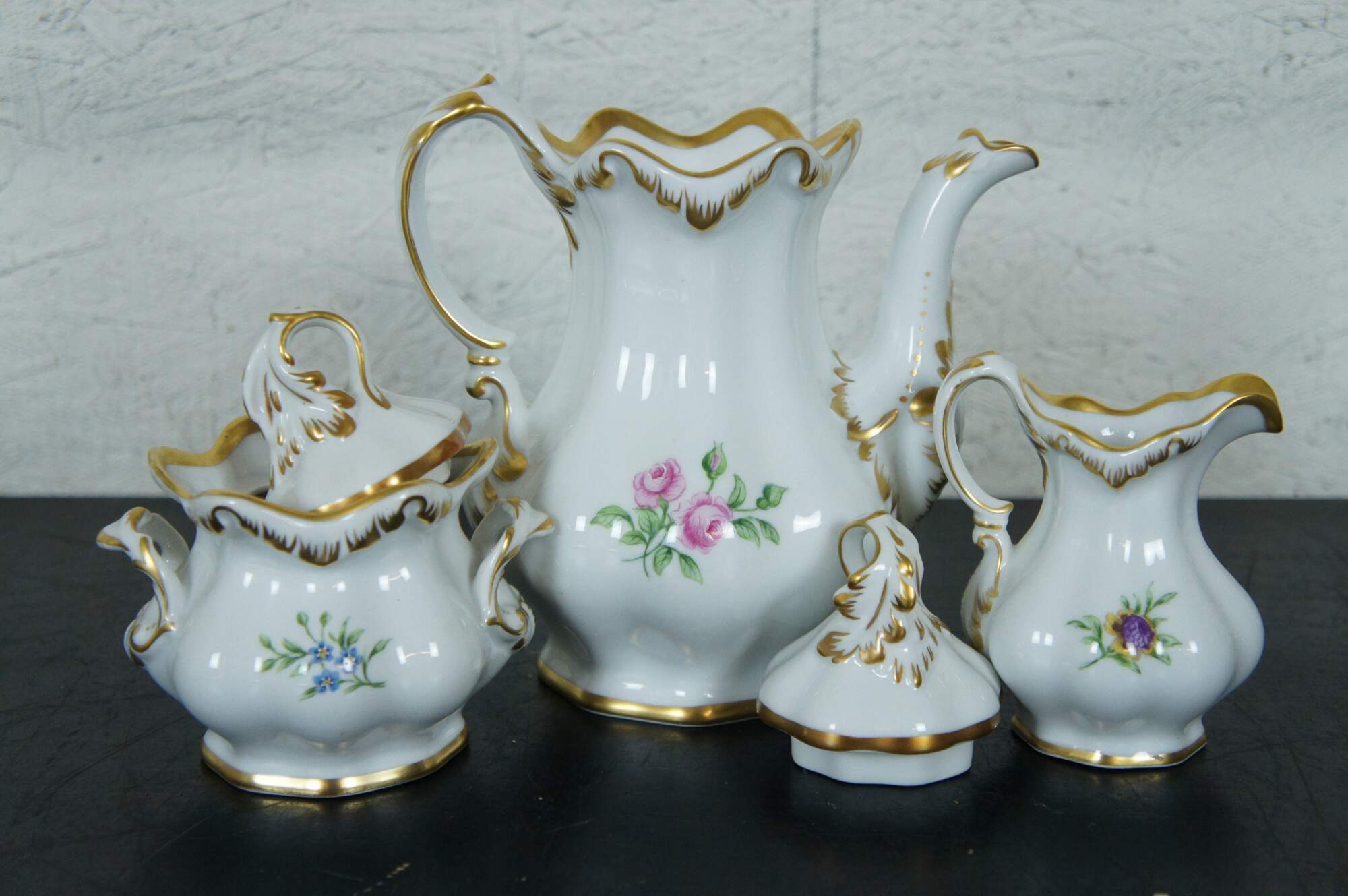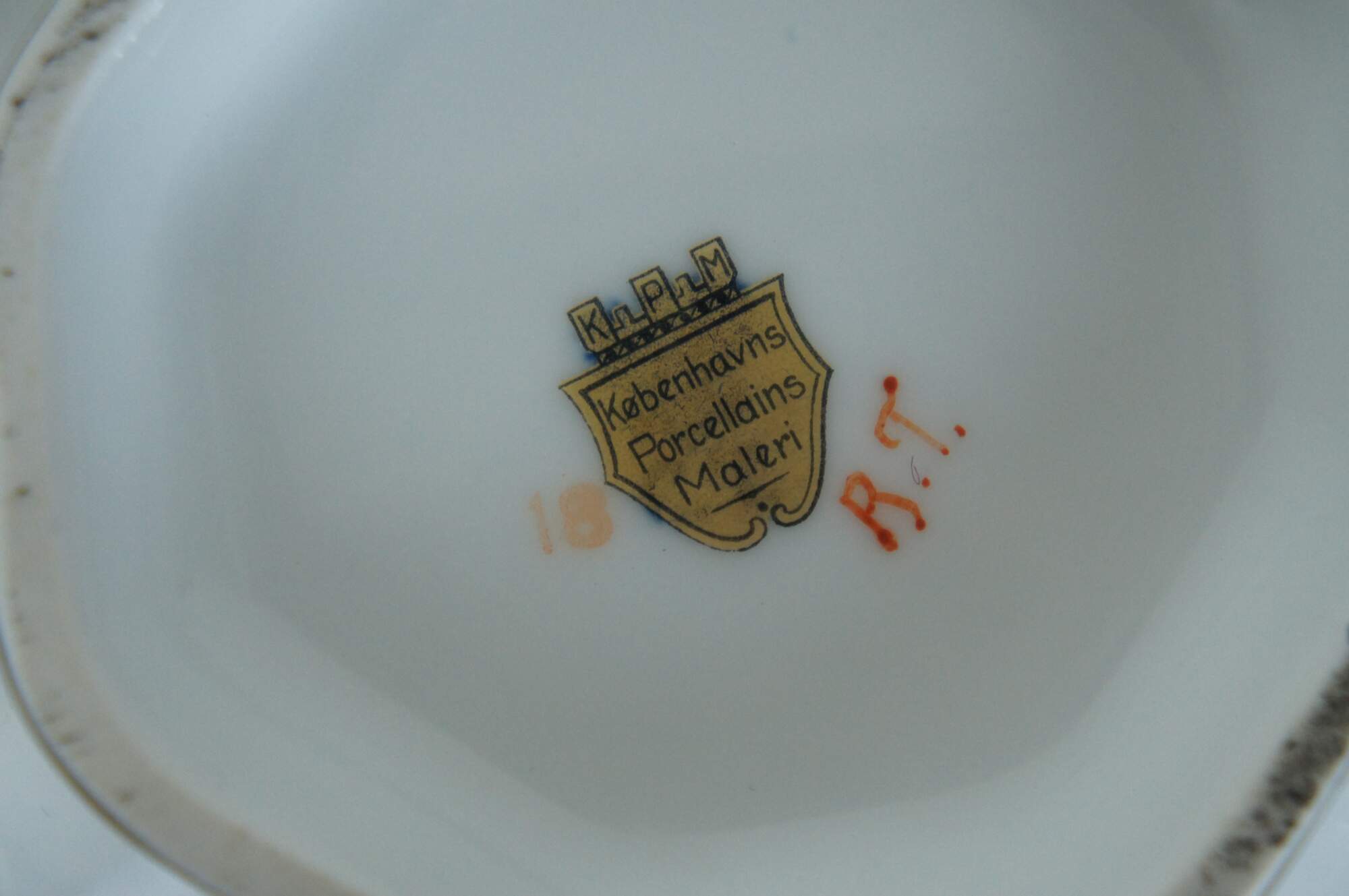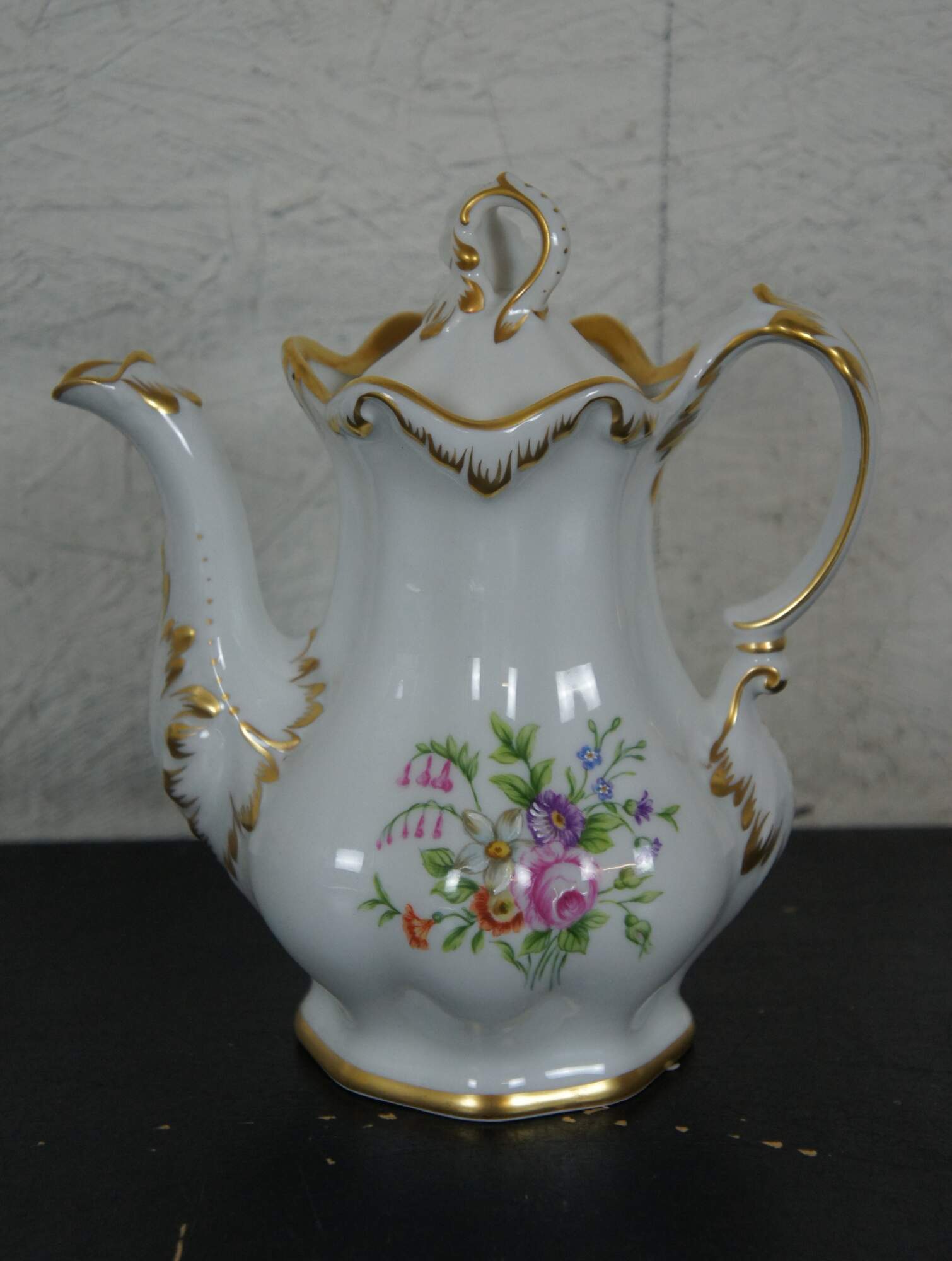Early to mid 20th century exquisite twelve piece gilded floral tea set including a lidded teapot, creamer, lidded sugar bowl, six teacups, and dessert serving tray. Dessert tray by Royal Bayreuth Bavaria. Tea set by Kobenhavns Porcellains Maleri. "Royal Bayreuth is the name of a factory that was founded in Tettau, Bavaria, in 1794. It closed in 2019. It made figural and souvenir items from about 1885 to 1915, but its most important products have been tableware and coffee and tea sets. The marks have changed through the years. A stylized crest, the name Royal Bayreuth, and the word Bavaria appear in slightly different forms from 1870 to about 1919. Later dishes may include the words U.S. Zone (1945–1949), the year of the issue, or the word Germany instead of Bavaria." "The Copenhagen Porcellain Decorating Workshop was founded in 1883. In 1924 it was acquired by the wholesaler company Holst & Knudsen. Holst & Knudsen imported to Denmark whiteware porcelain from Germany and decorated it.The Great Depression made difficult importing cheap German porcelain. That's why Holst & Knudsen established in 1936 own porcelain factory Porcelænsfabriken Danmark. During first years of production, the factory was using the Kjøbenhavns Porcellains Maleri (KPM) mark. It continued production till 1969. In 2012, the Danish Porcelain Manufactory – Lyngby Porcelæn was reopened by Christian Elving who in 2011 acquired from owner's family all rights and drawings.