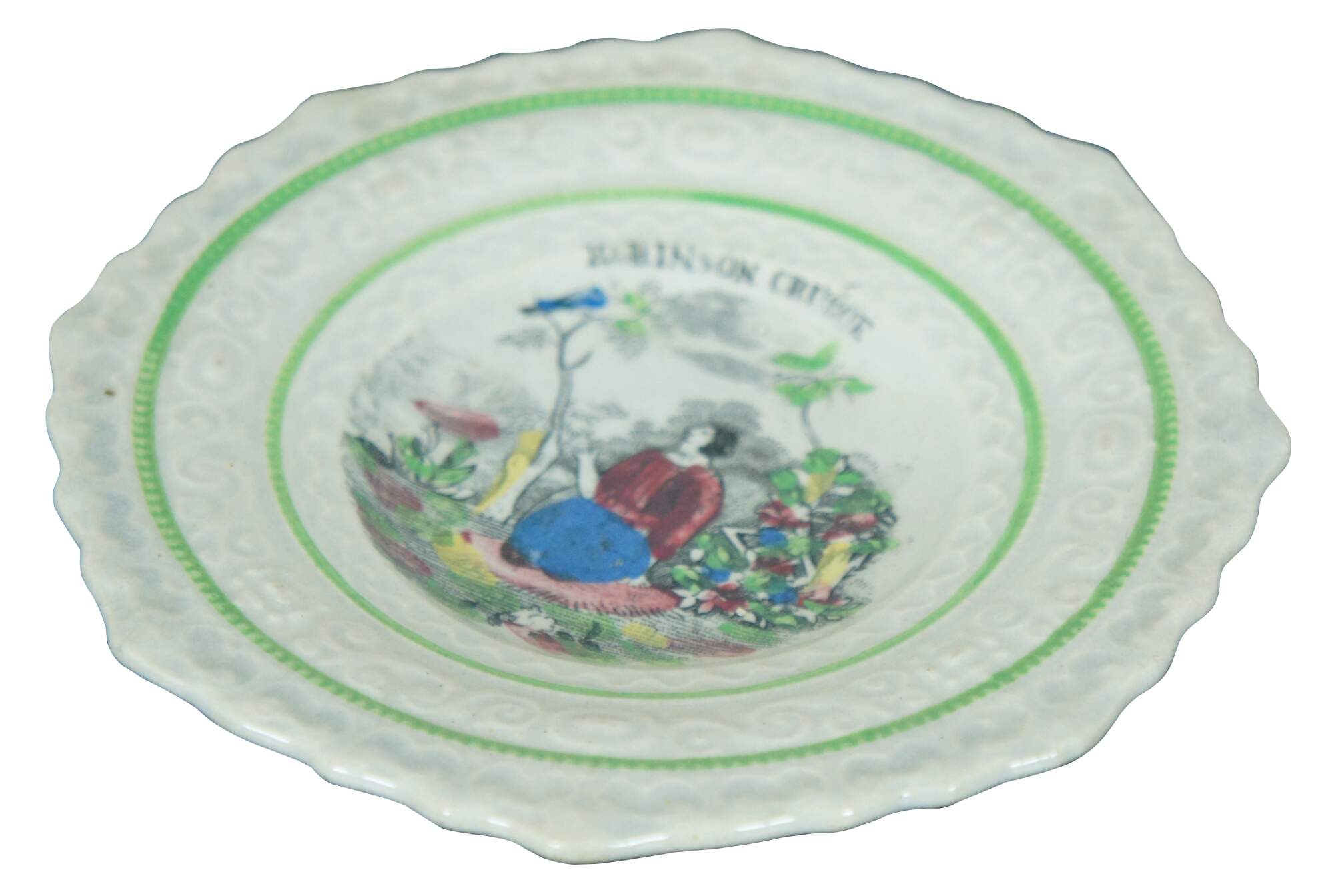 Antique Staffordshire transferware porcelain, eight sided child’s plate, embossed with a swirling design alternating with lime green rings and a scene of Robinson Crusoe seated in a flowering landscape.
