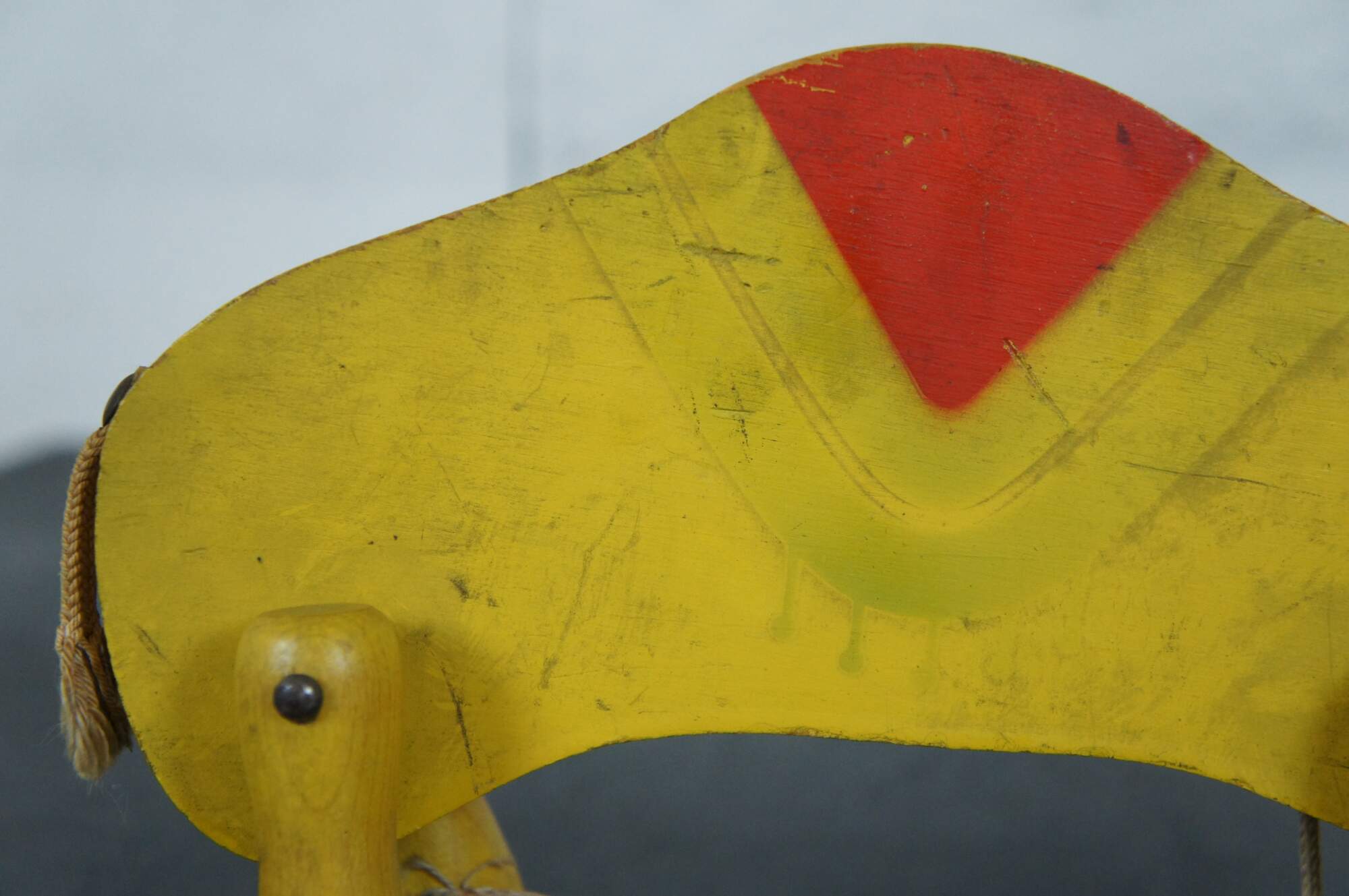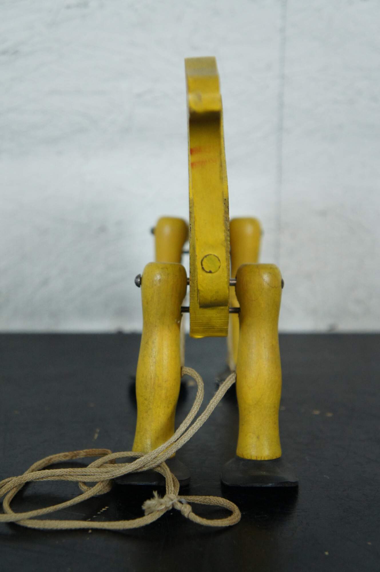 Antique wooden walking pull toy in the shape of a yellow walking camel with red details, made by Hustler Toy Corporation of Sterling Illinois USA.