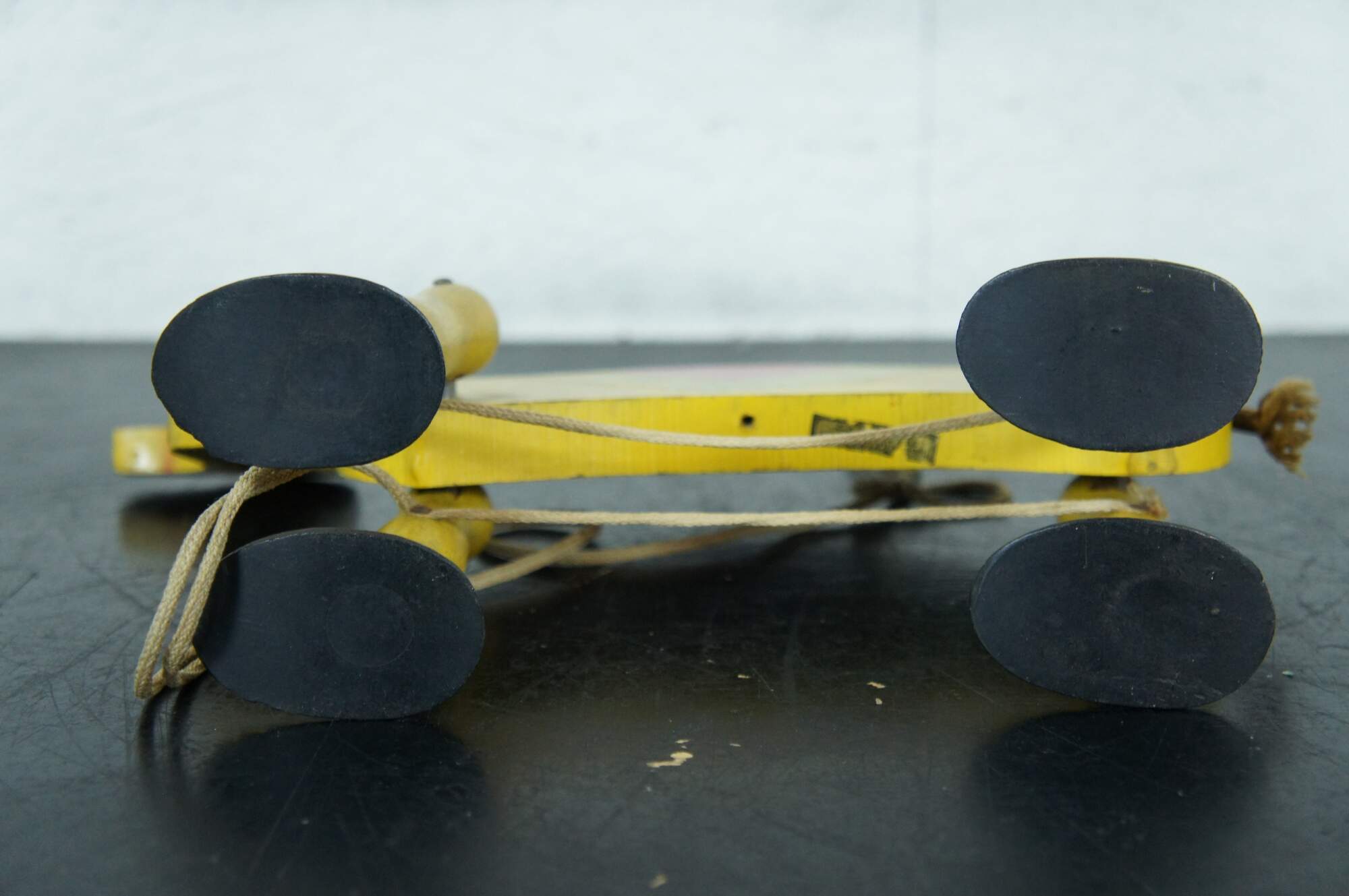 Hustler Toy Company made wooden toys until 1934. After that, the Hustler name appears only on metal strap-on roller skates which were made until about 1970.