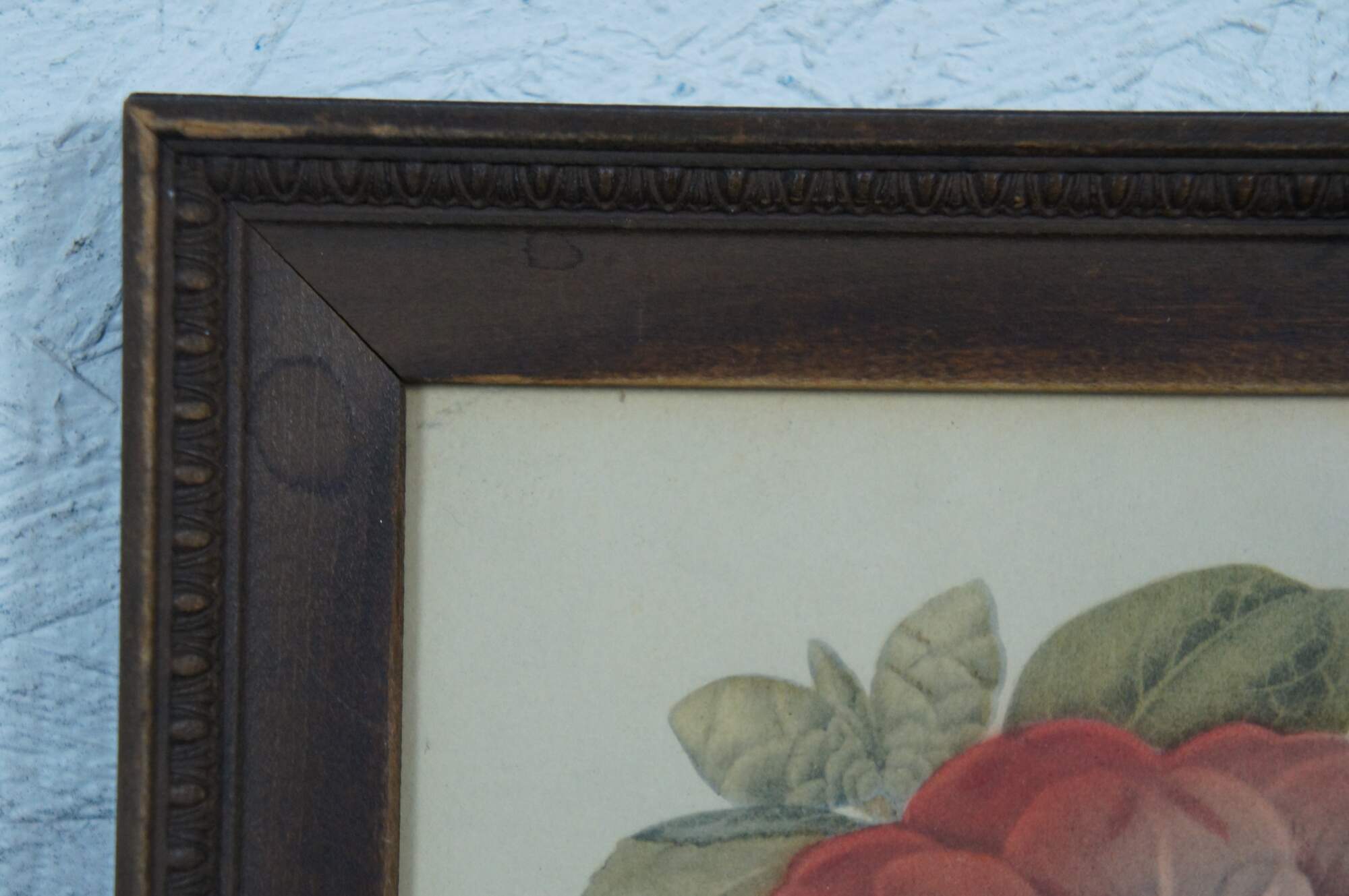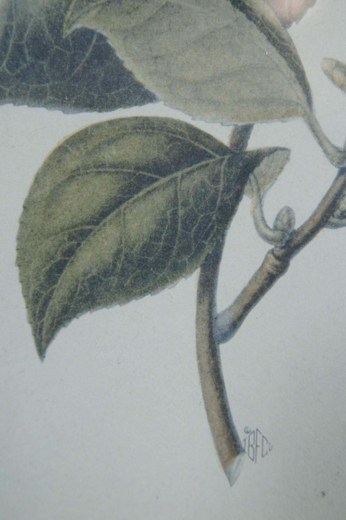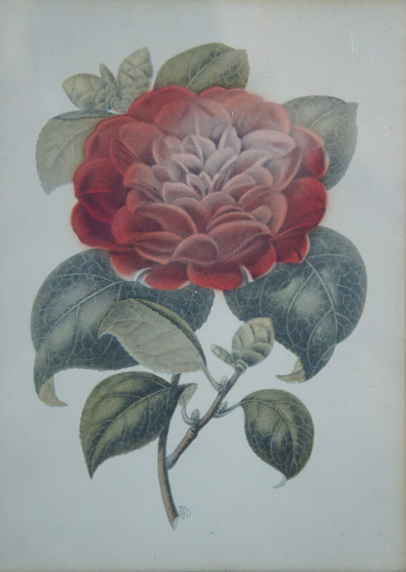 Antique 1940s chromolithograph print of a red camellia, published by IBF Co.