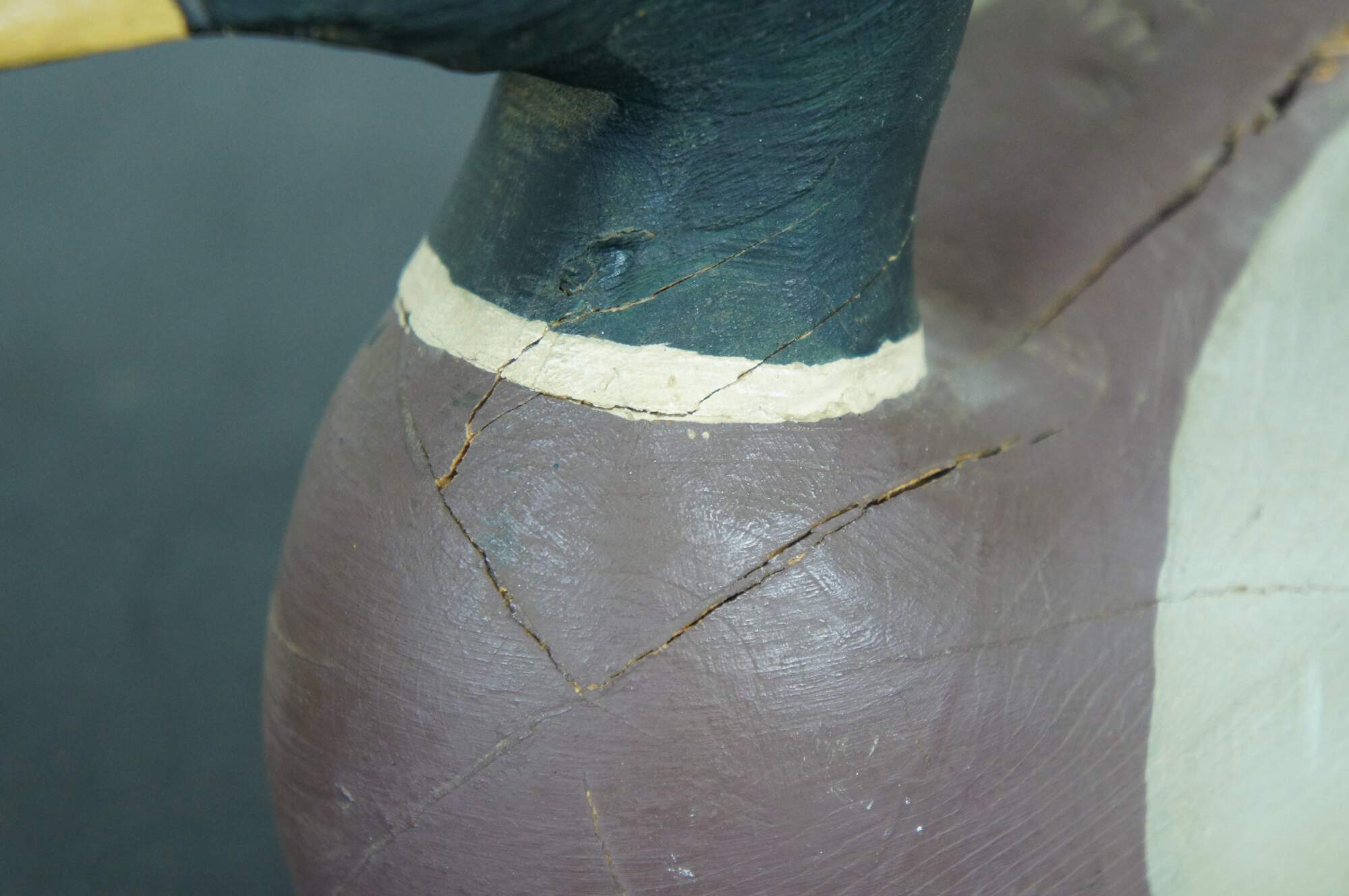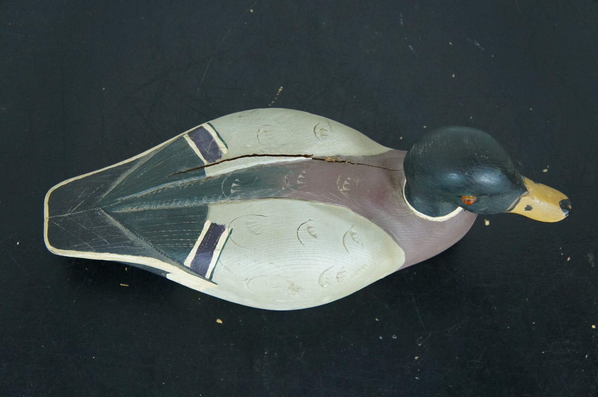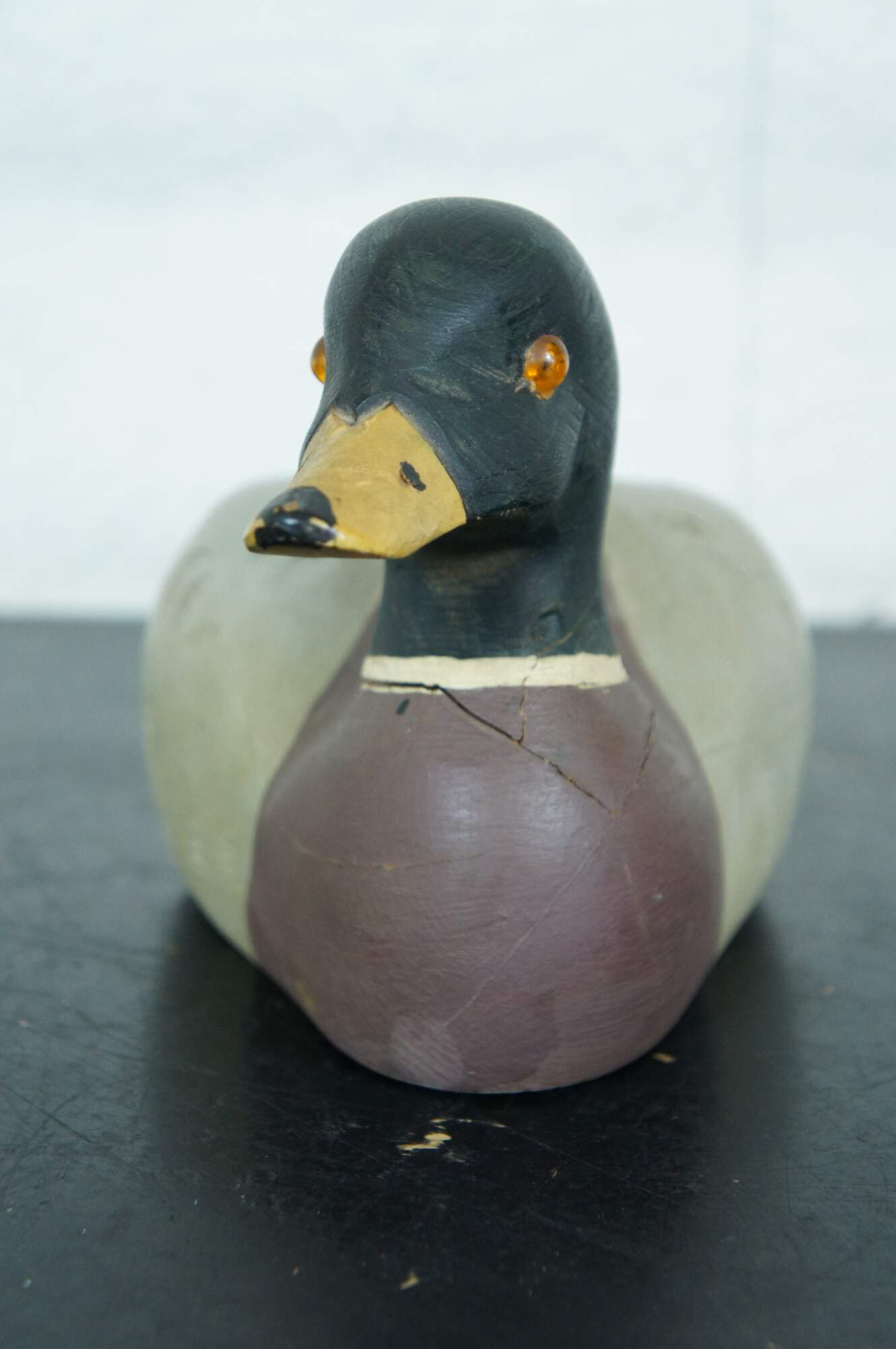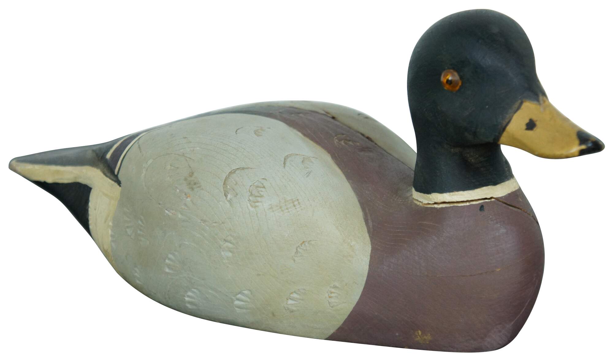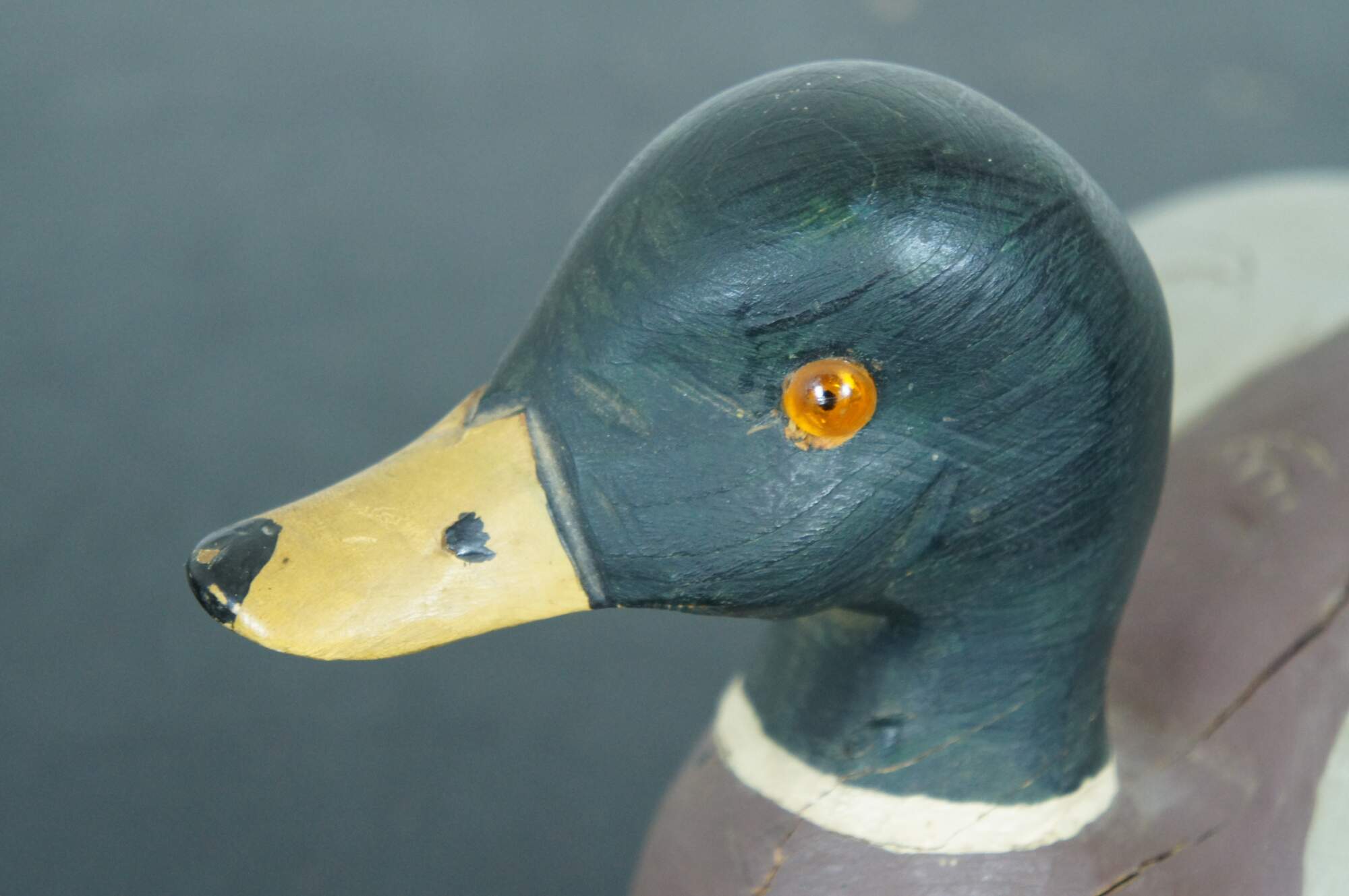 Vintage hand carved and painted wooden mallard duck decoy with amber glass eyes and a flat base.