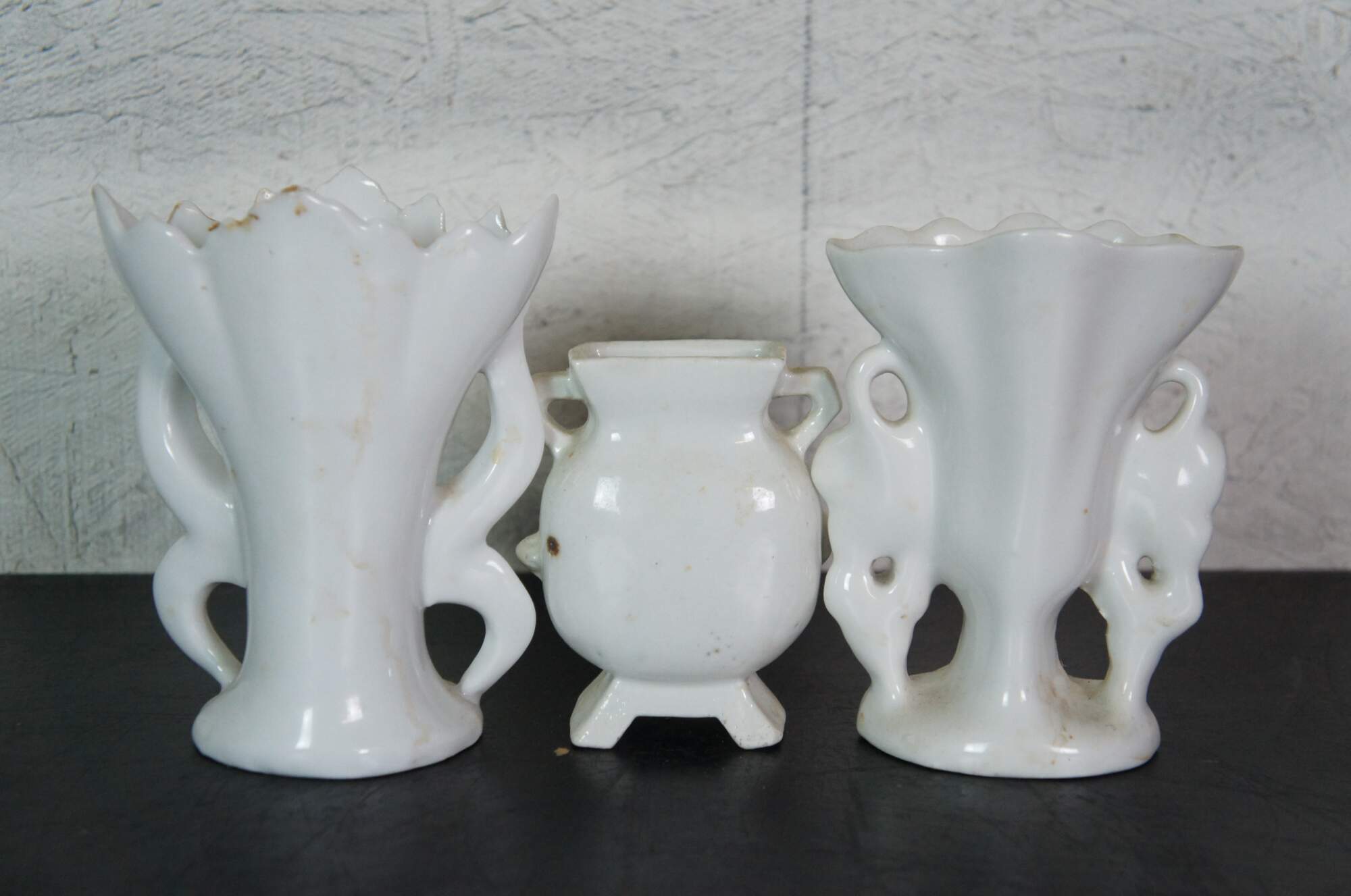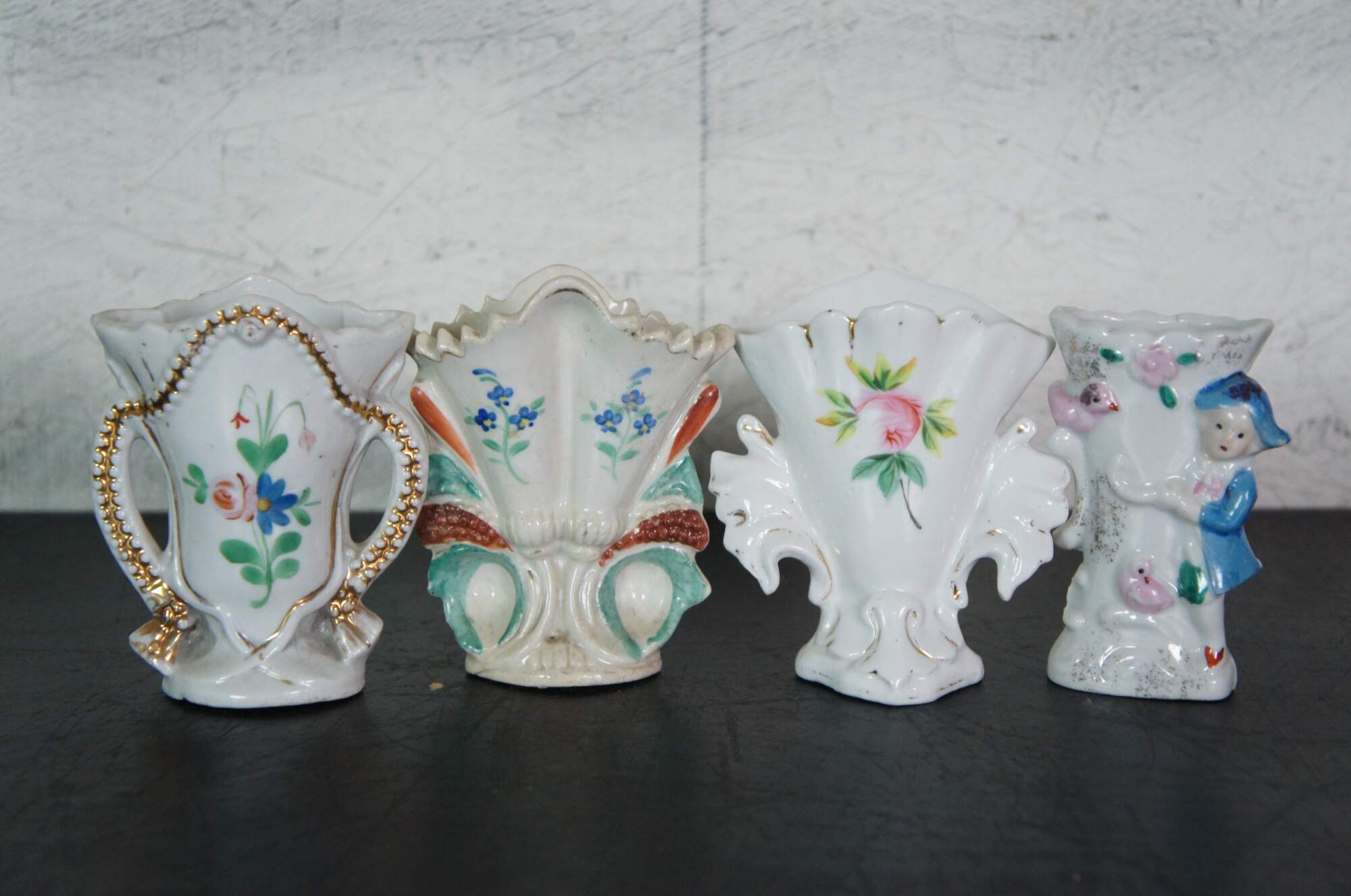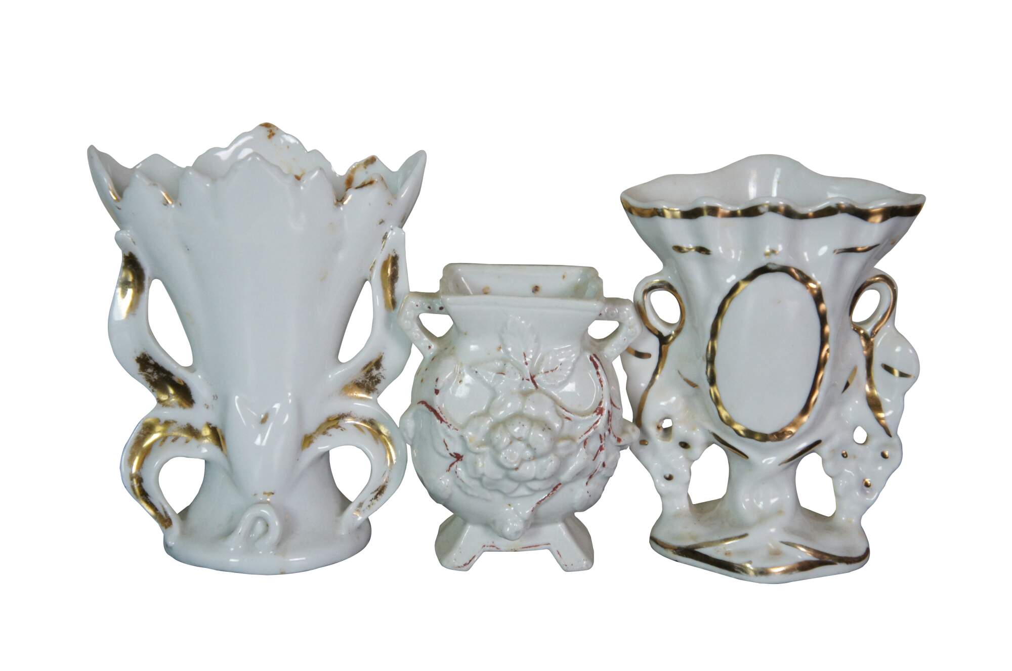 Lot of 15 late 19th to early 20th century white porcelain flower / bud vases in a variety of shapes and sizes. Hand decorated with gilt details and floral motifs.
