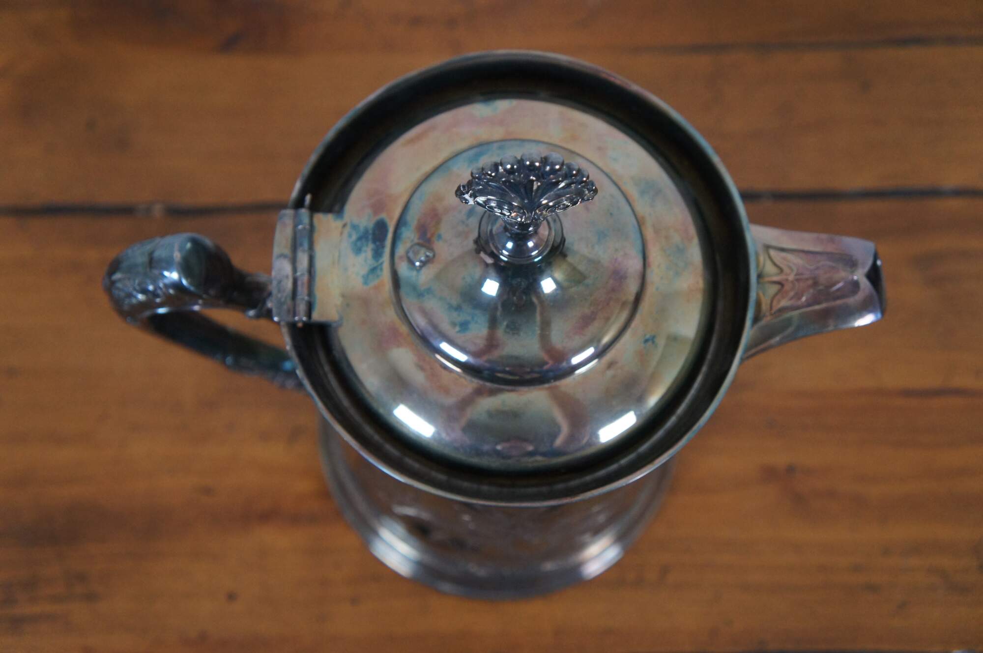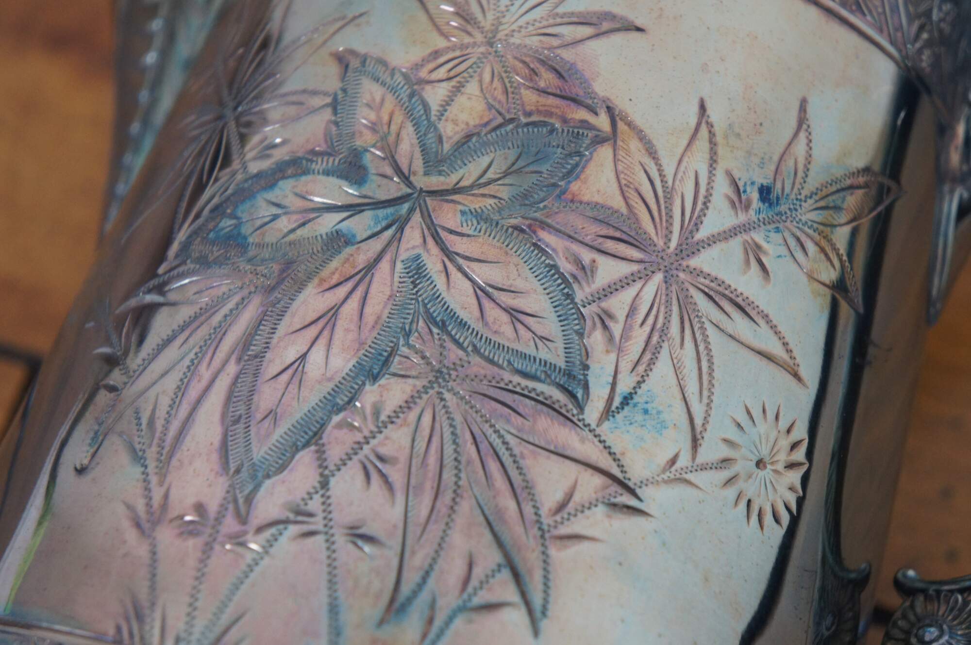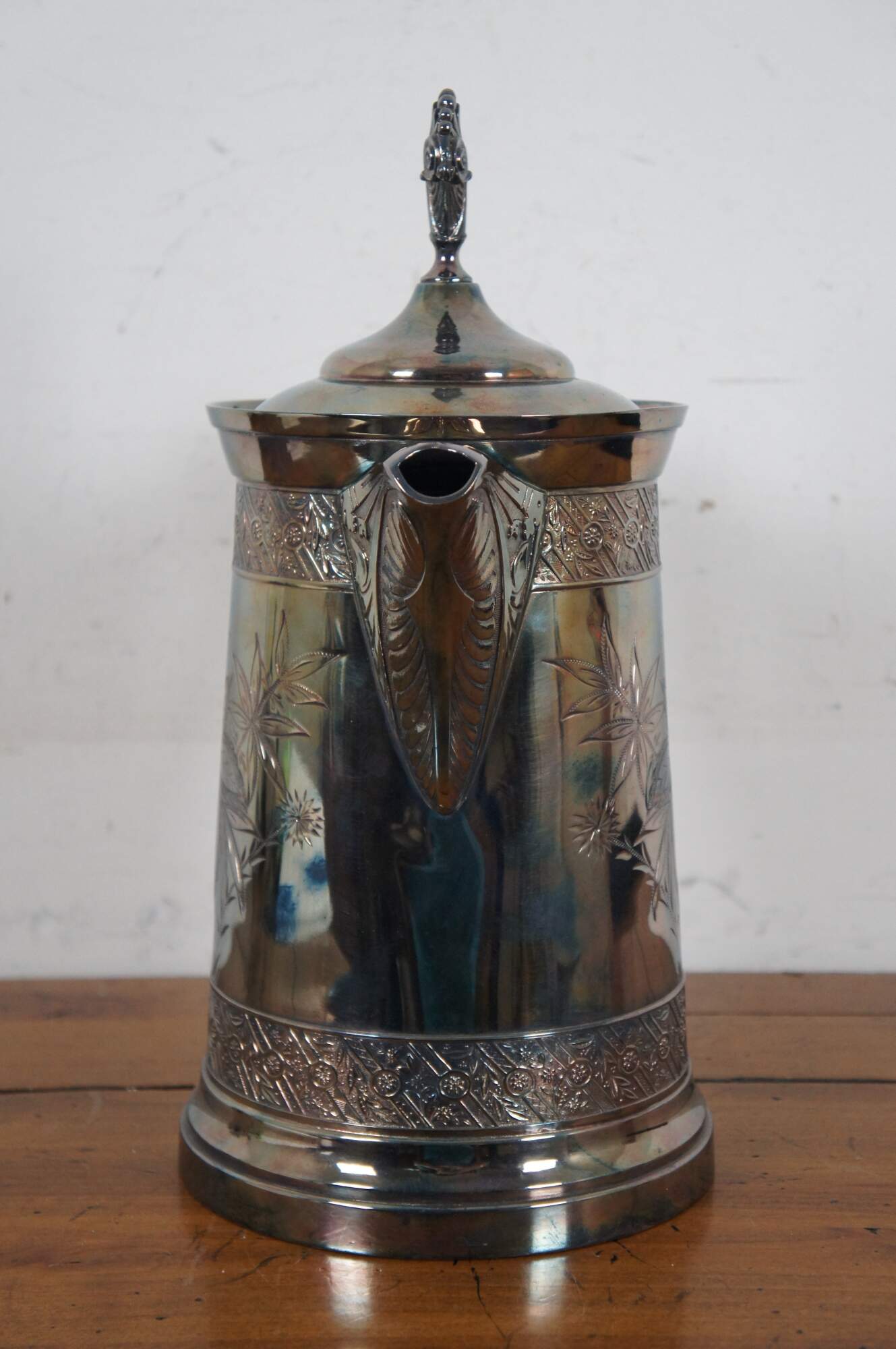 Antique Victorian quadruple silver plate water pitcher by Rogers Manufacturing Company featuring ornate detail with etched floral design.