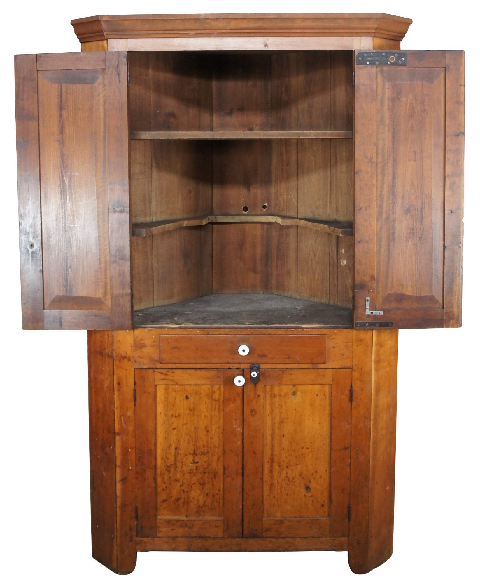 Primitive American corner cupboard, circa 1870s. Made from maple and constructed using hand cut nails. Features a warm patina with distressing from age. Hardware is iron and porcelain.