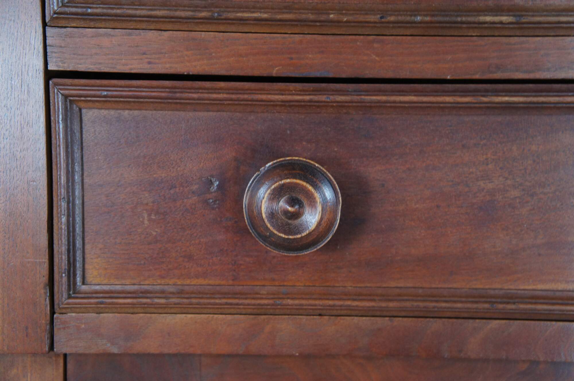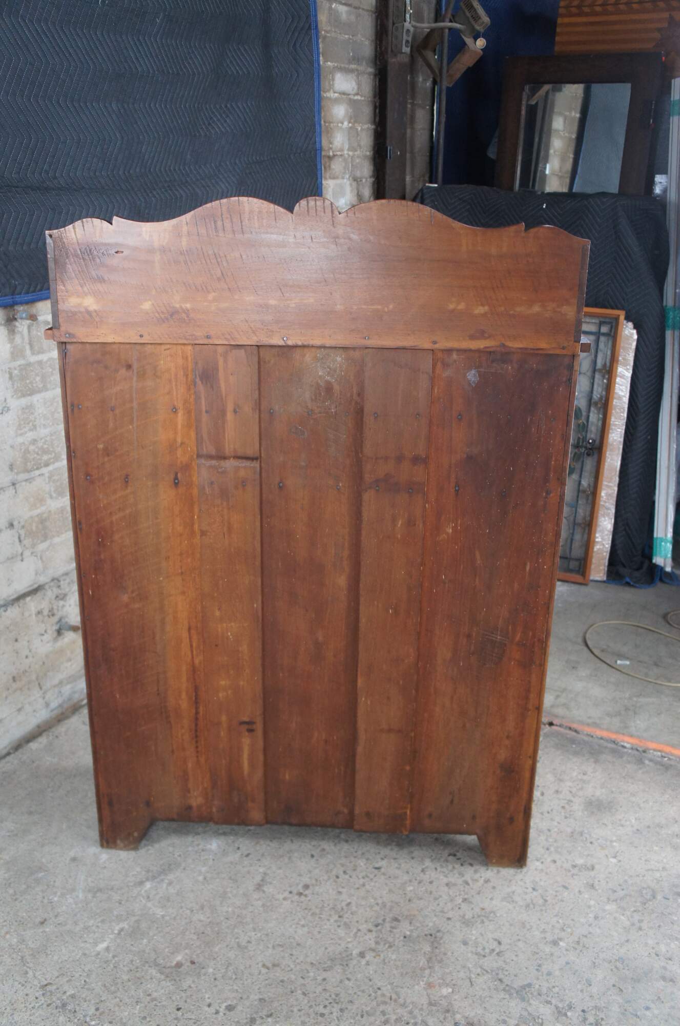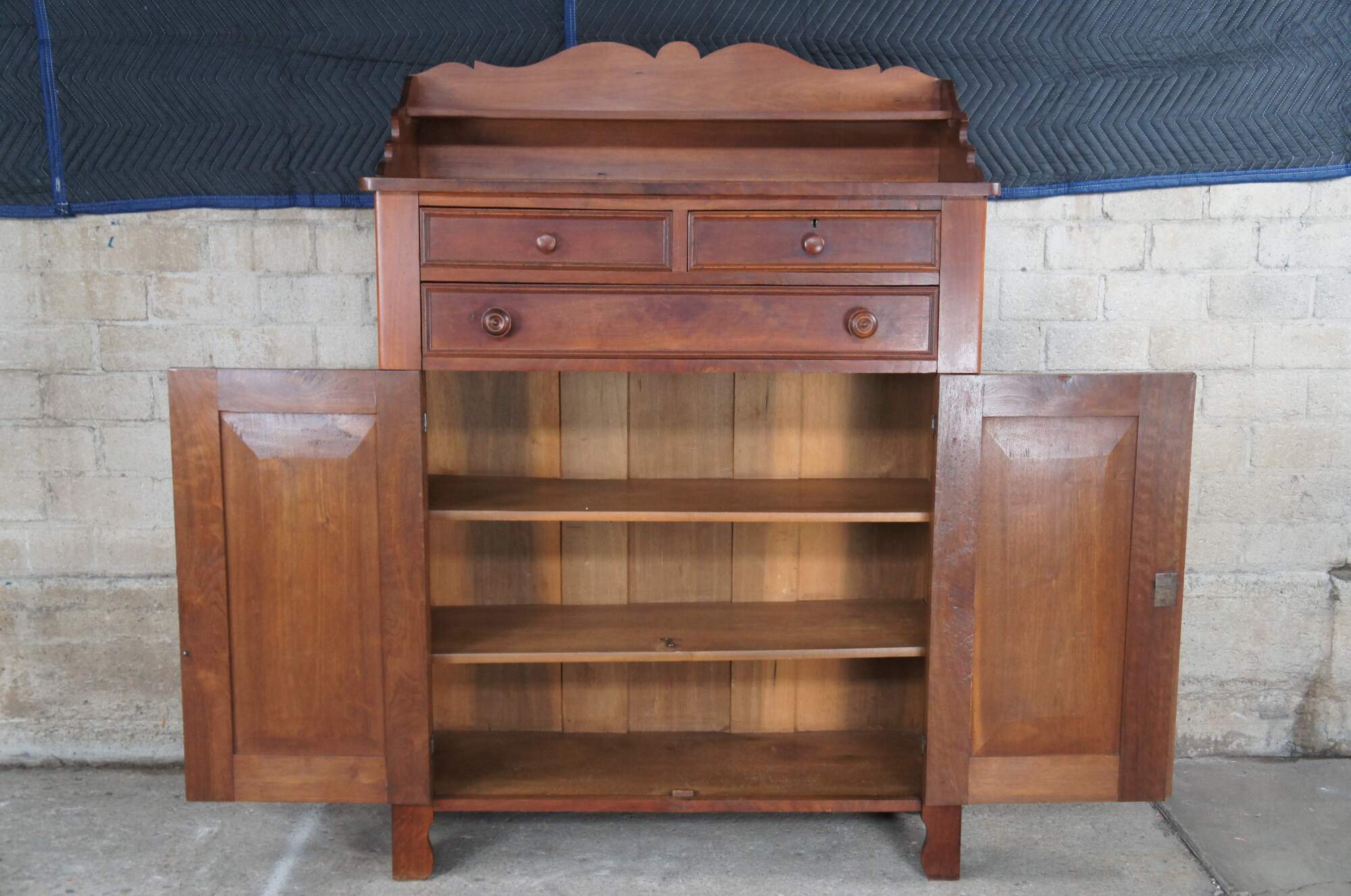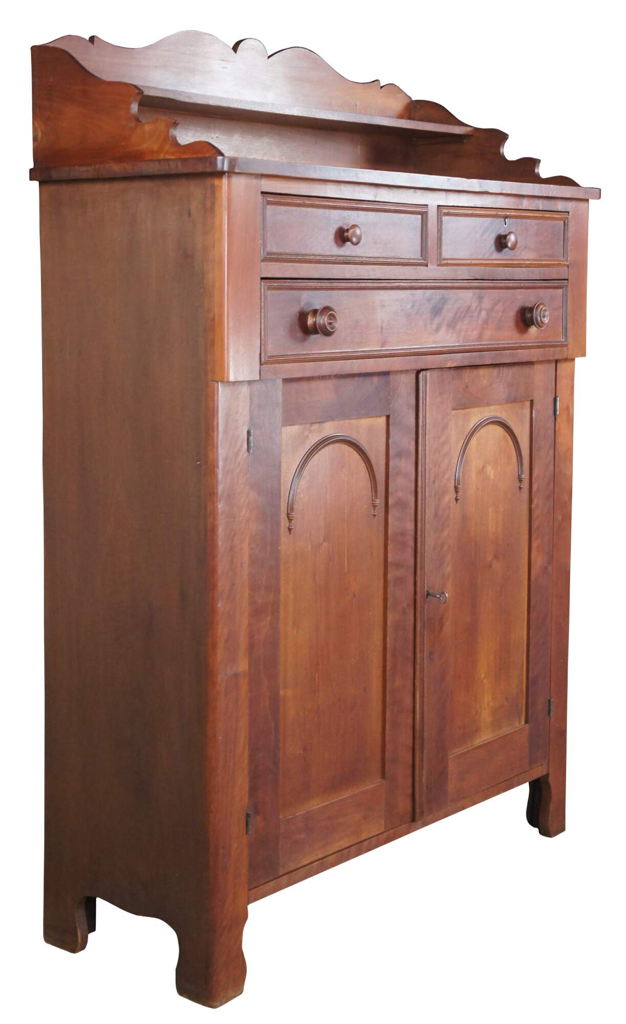 A warming handmade Mid 19th Century Early American Jelly Cabinet or Pantry Cupboard. A rectangular form made from American Walnut with an upper surface enclosed by a serpentine backsplash that features one shelf, over three hand dovetailed drawers and lower cupboard with two shelves.
