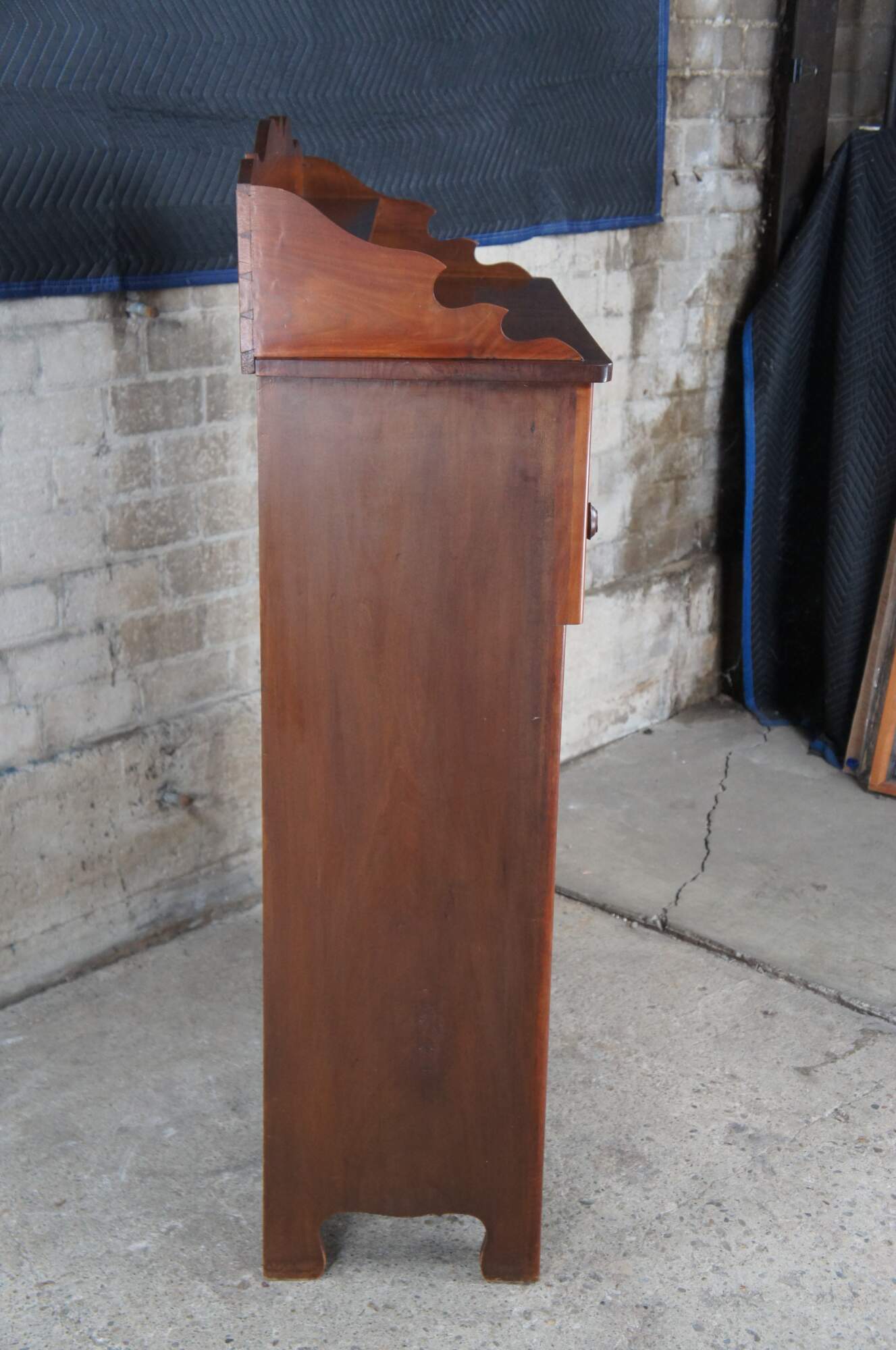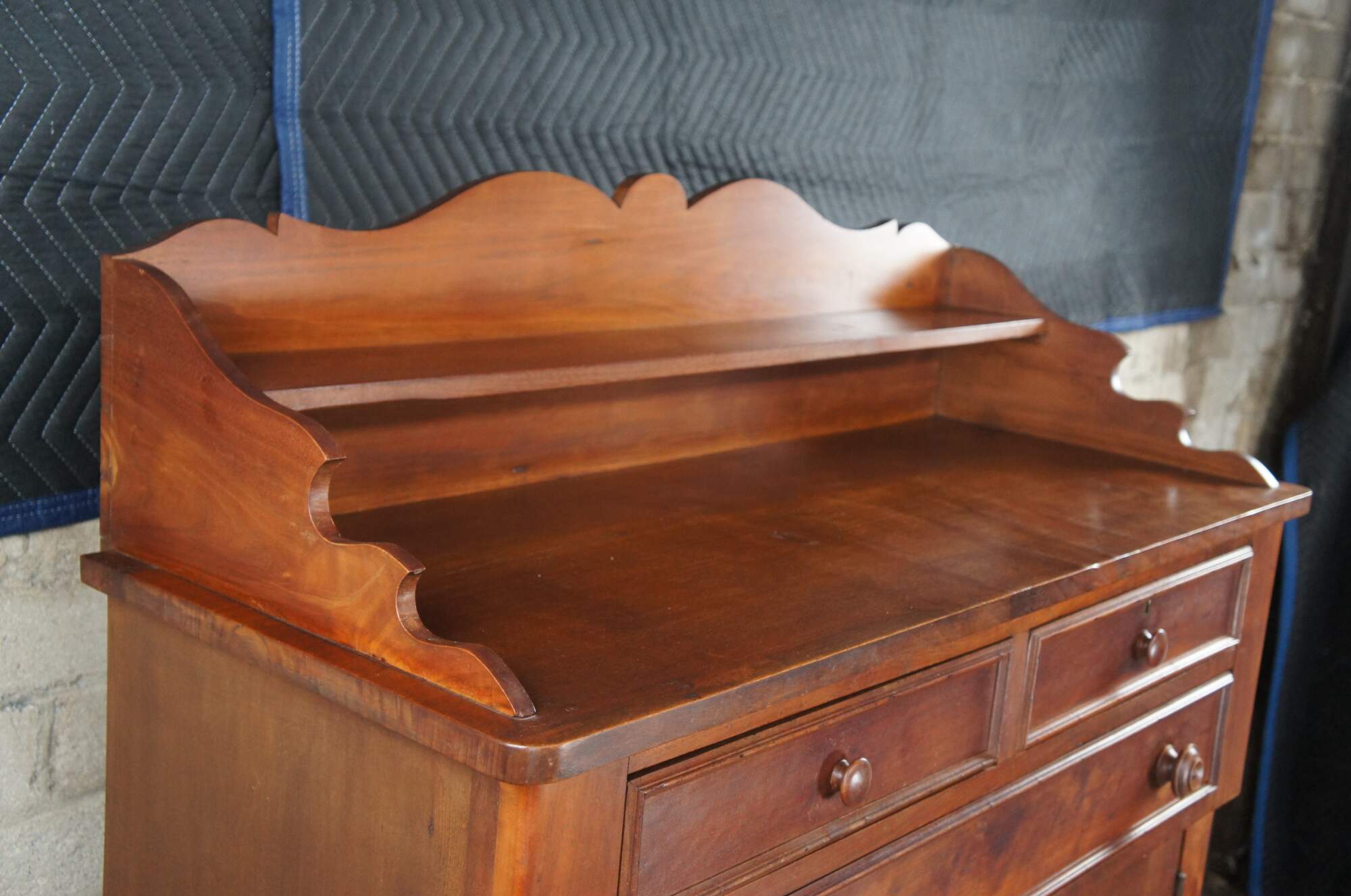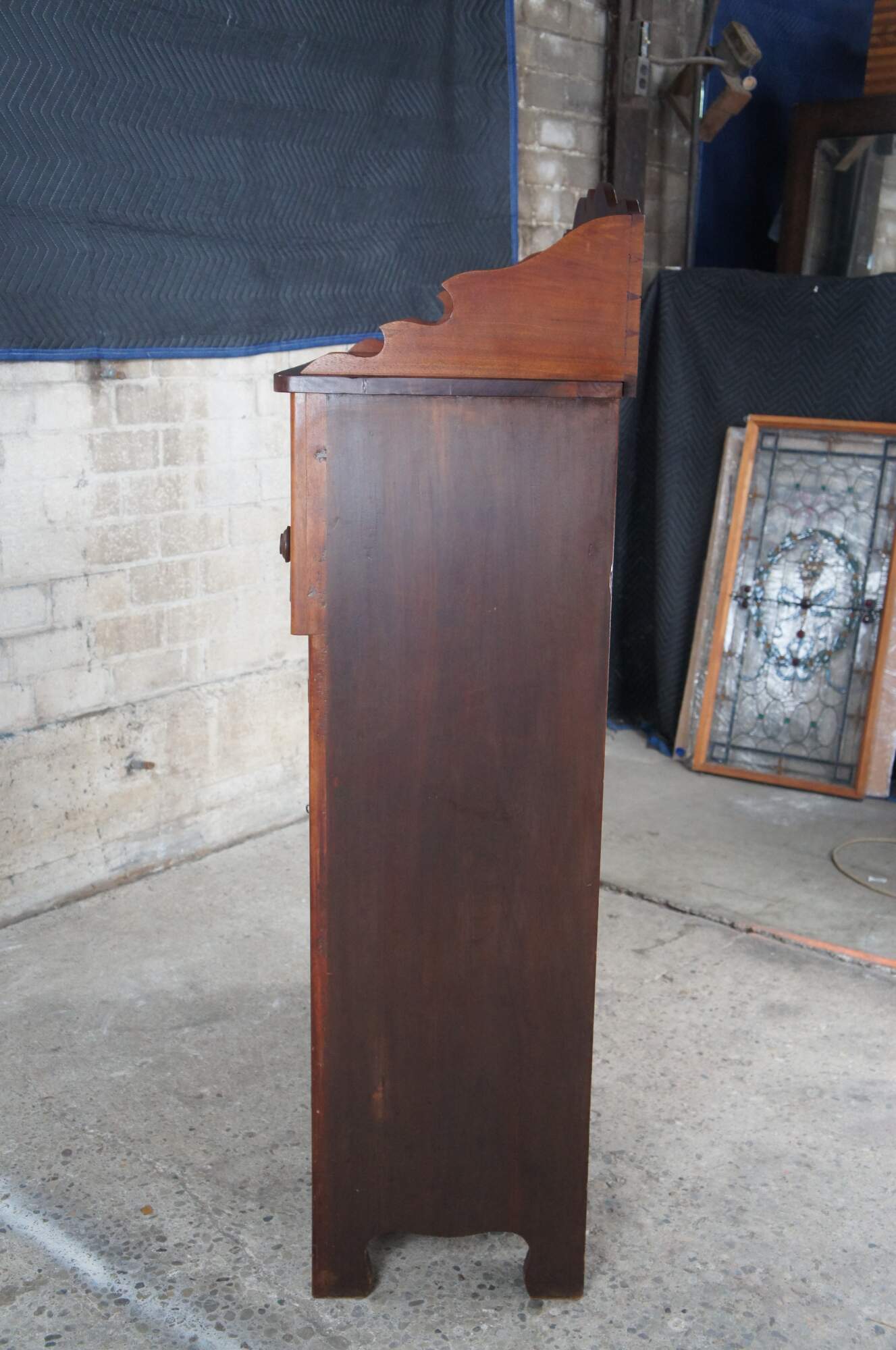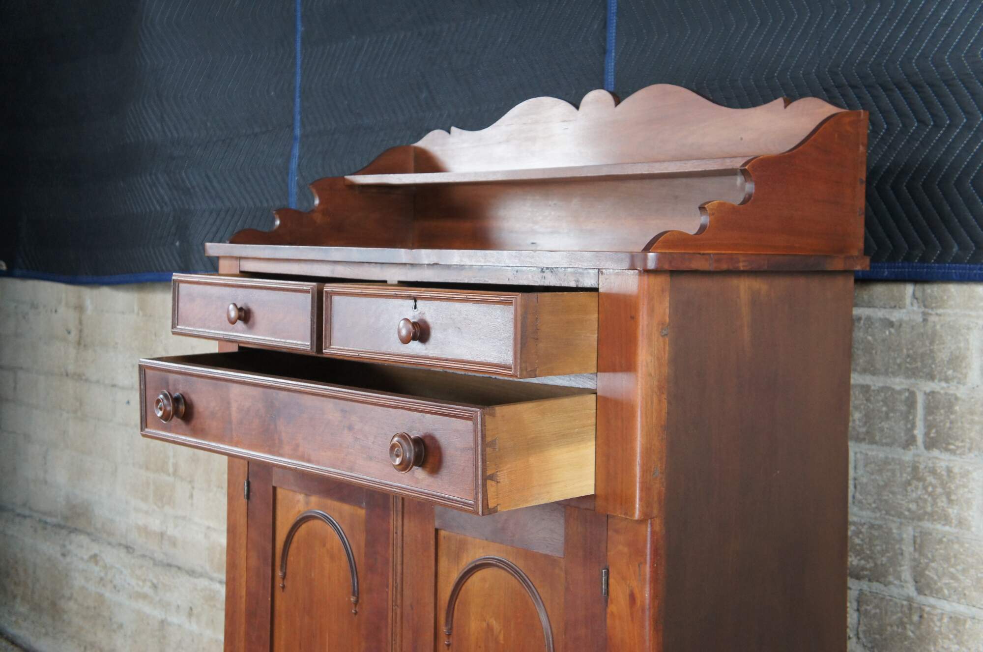 A warming handmade Mid 19th Century Early American Jelly Cabinet or Pantry Cupboard. A rectangular form made from American Walnut with an upper surface enclosed by a serpentine backsplash that features one shelf, over three hand dovetailed drawers and lower cupboard with two shelves.