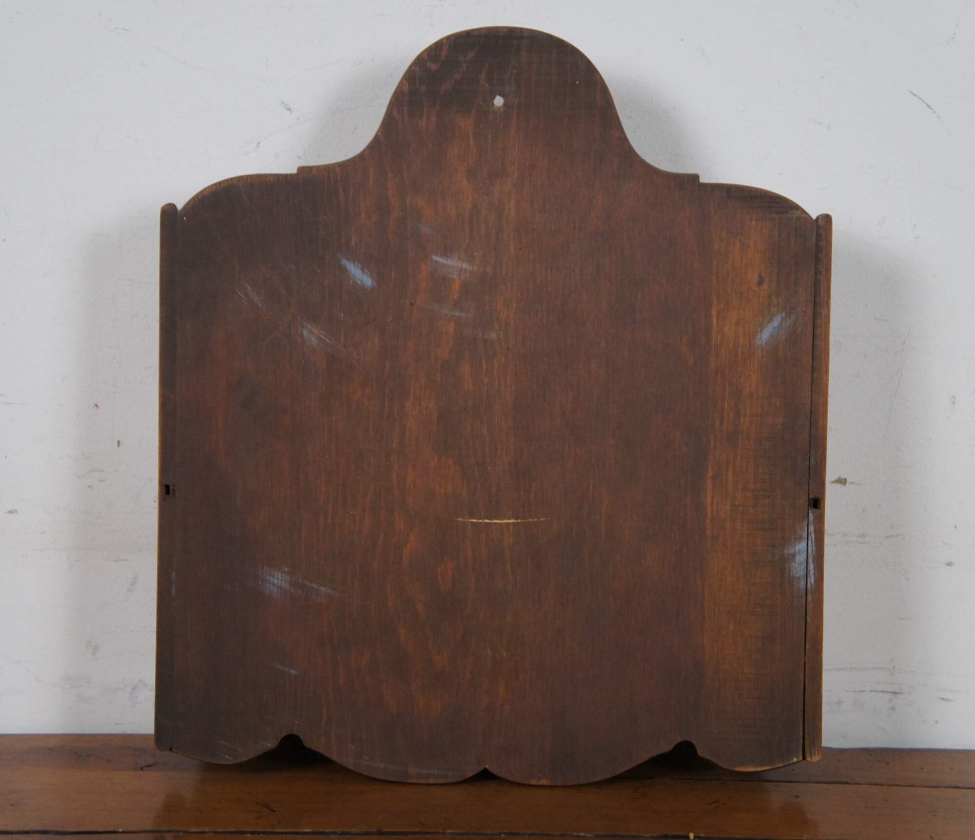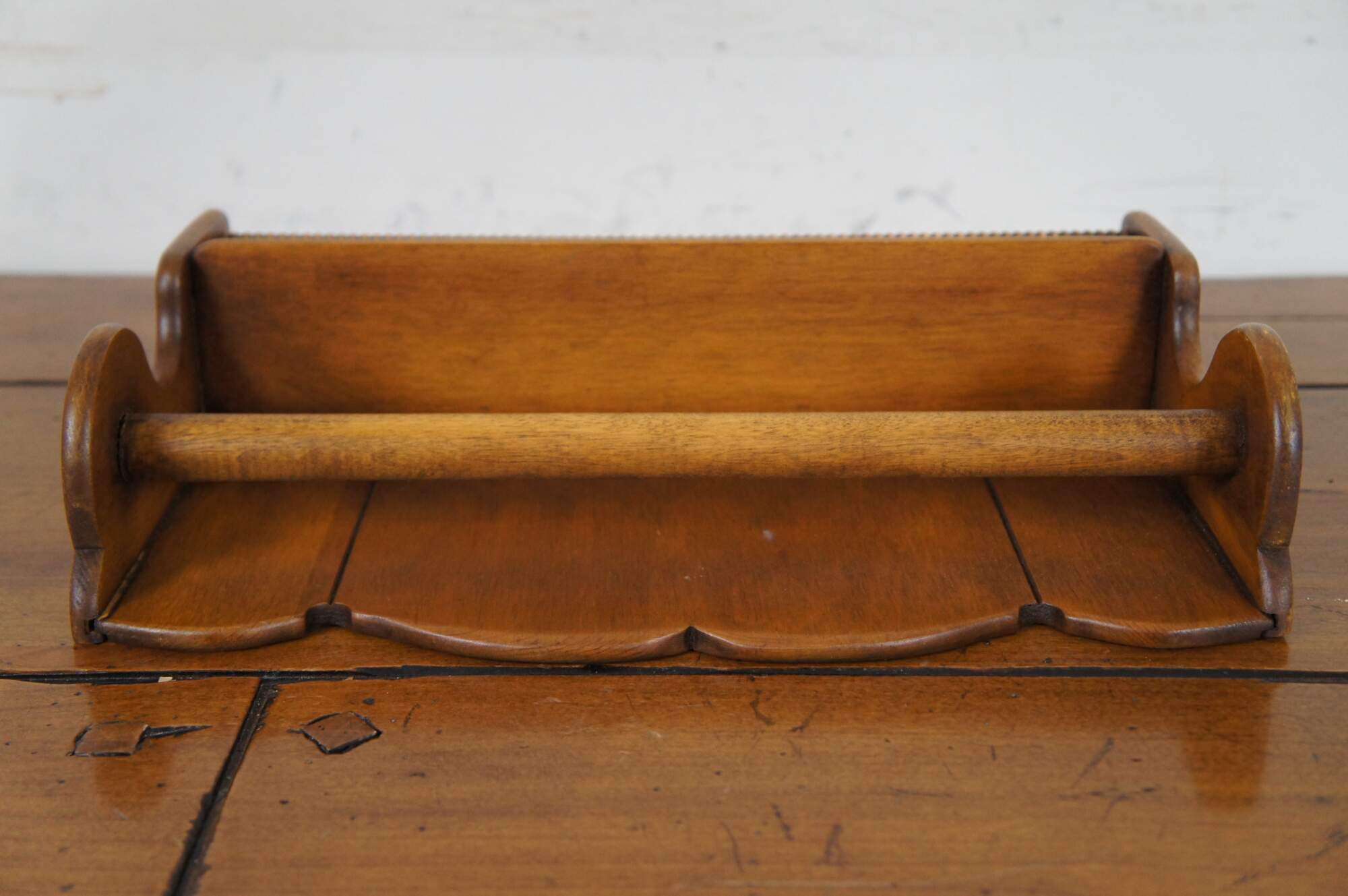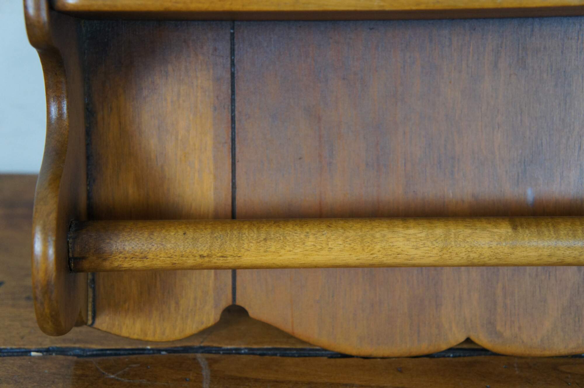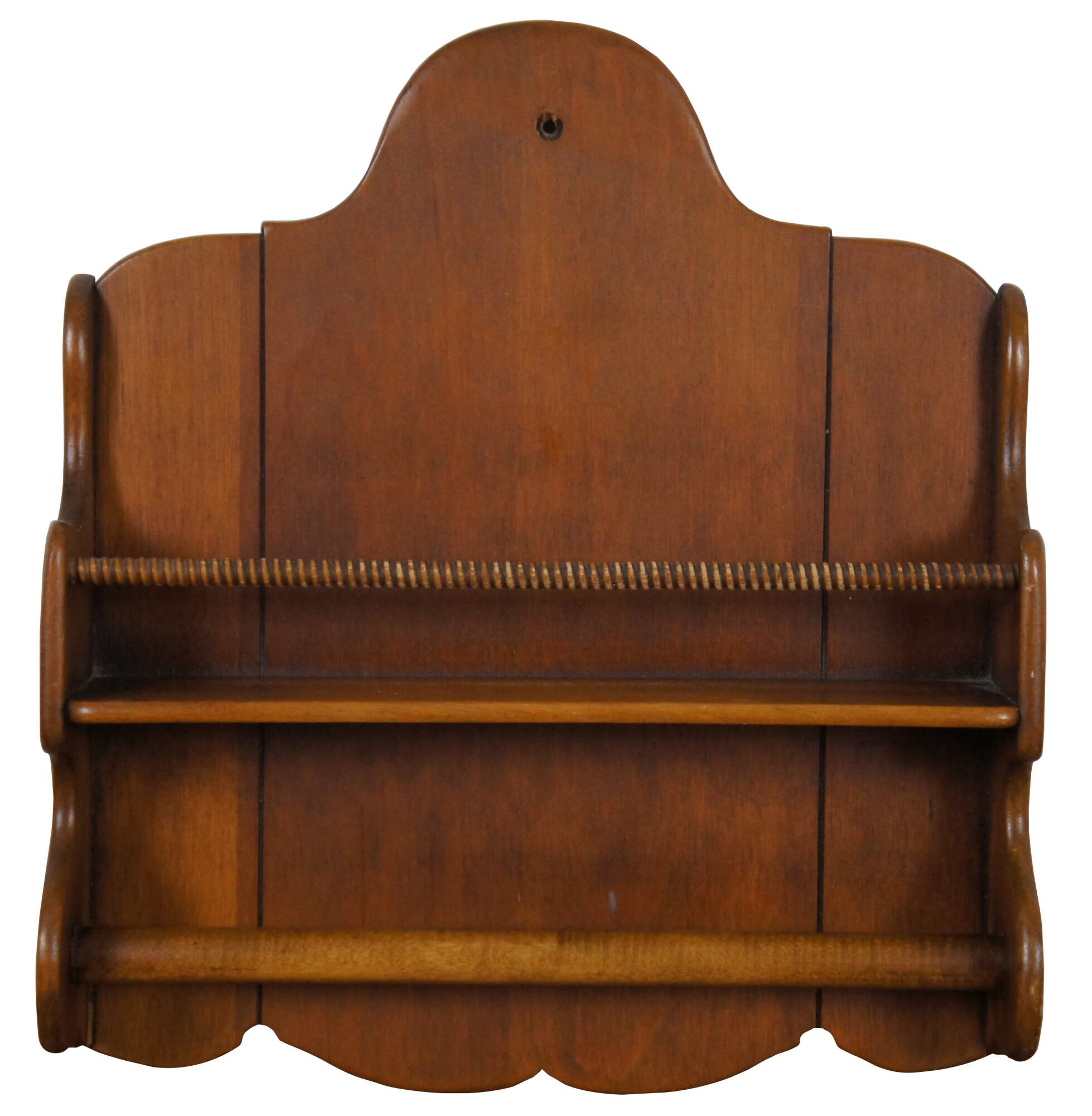 Early American style wall hanging shelf for kitchen or bathroom featuring one shelf / rack fronted with a spiral carved bar to prevent items falling with a towel bar below.