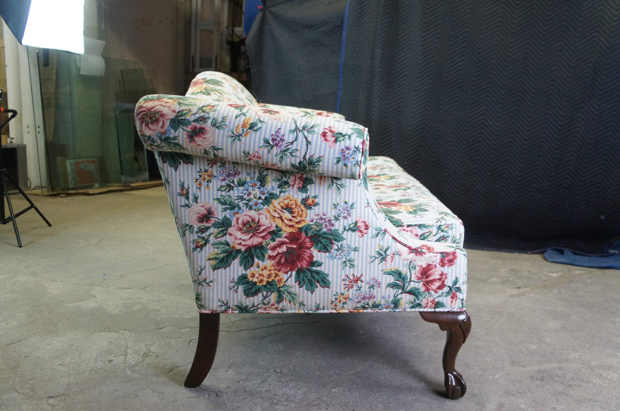 Ethan Allen Georgian Court Queen Anne or chippendale style camelback sofa Mp. 20-7179, circa 1970s. Made from cherry with cabriole legs featuring a shell carved knee and ball and claw feet. The sofa is upholstered in a blue and white fabric with floral sprays of yellow, red and green.