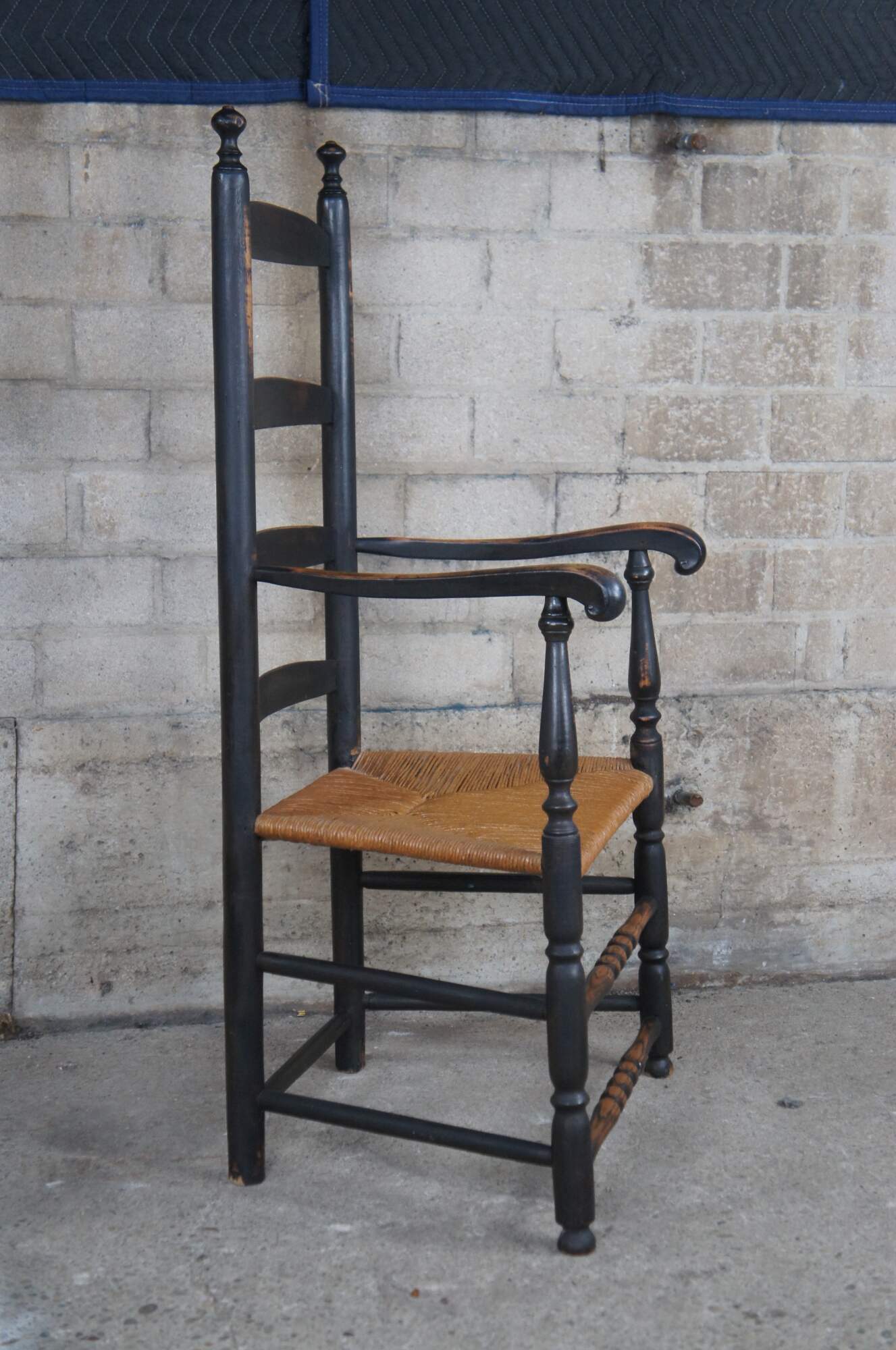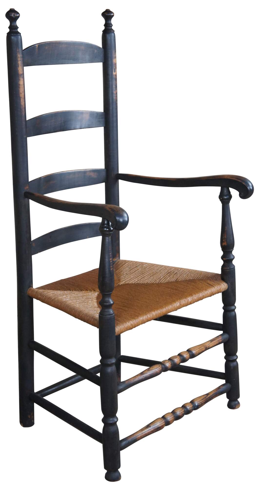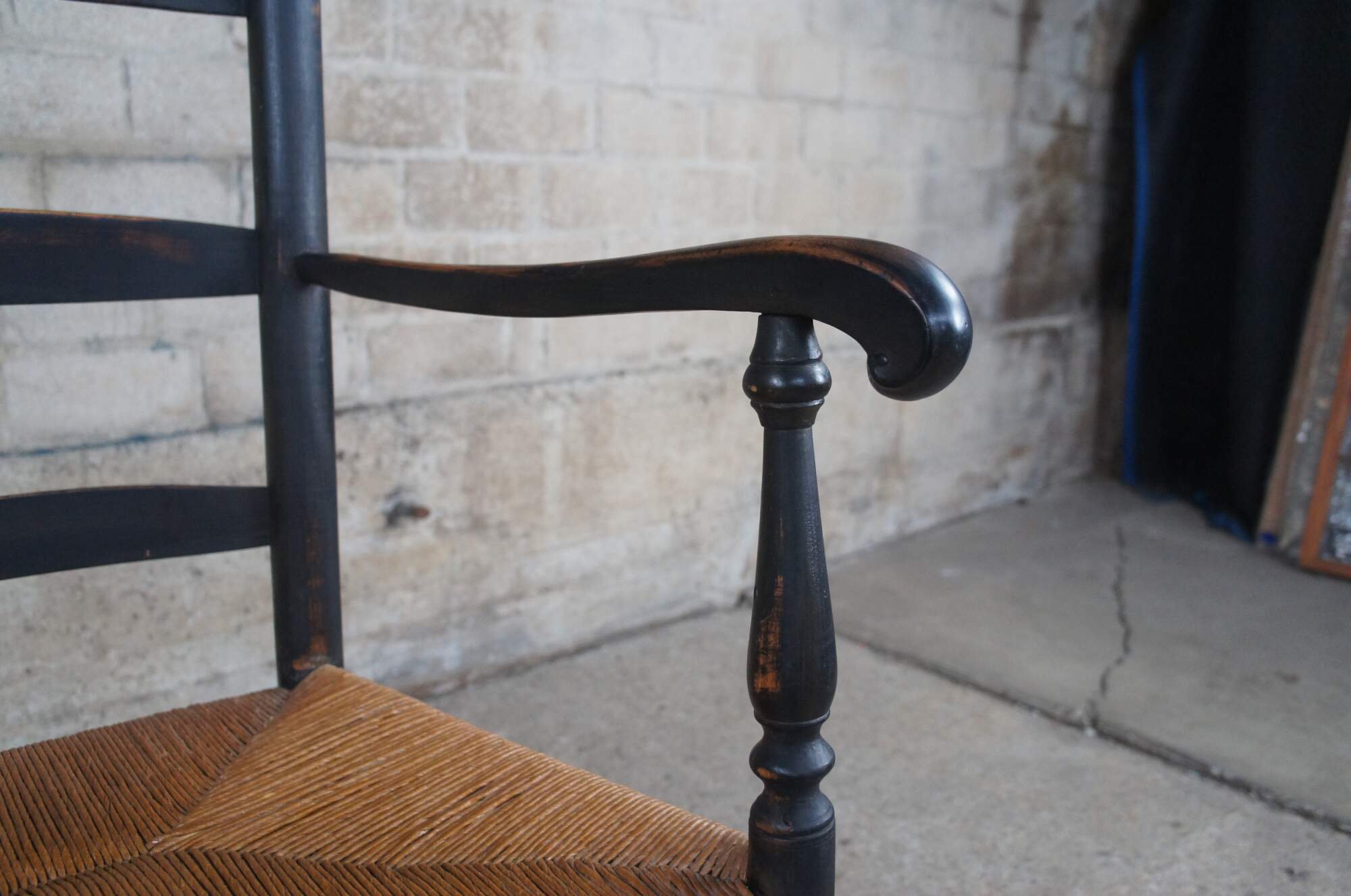 Vintage early american style shaker laddderback chair. Made from oak with black painted finish, naturally distressed allowing the oak to show through in spots. Features a ladderback design and scrolled arms.