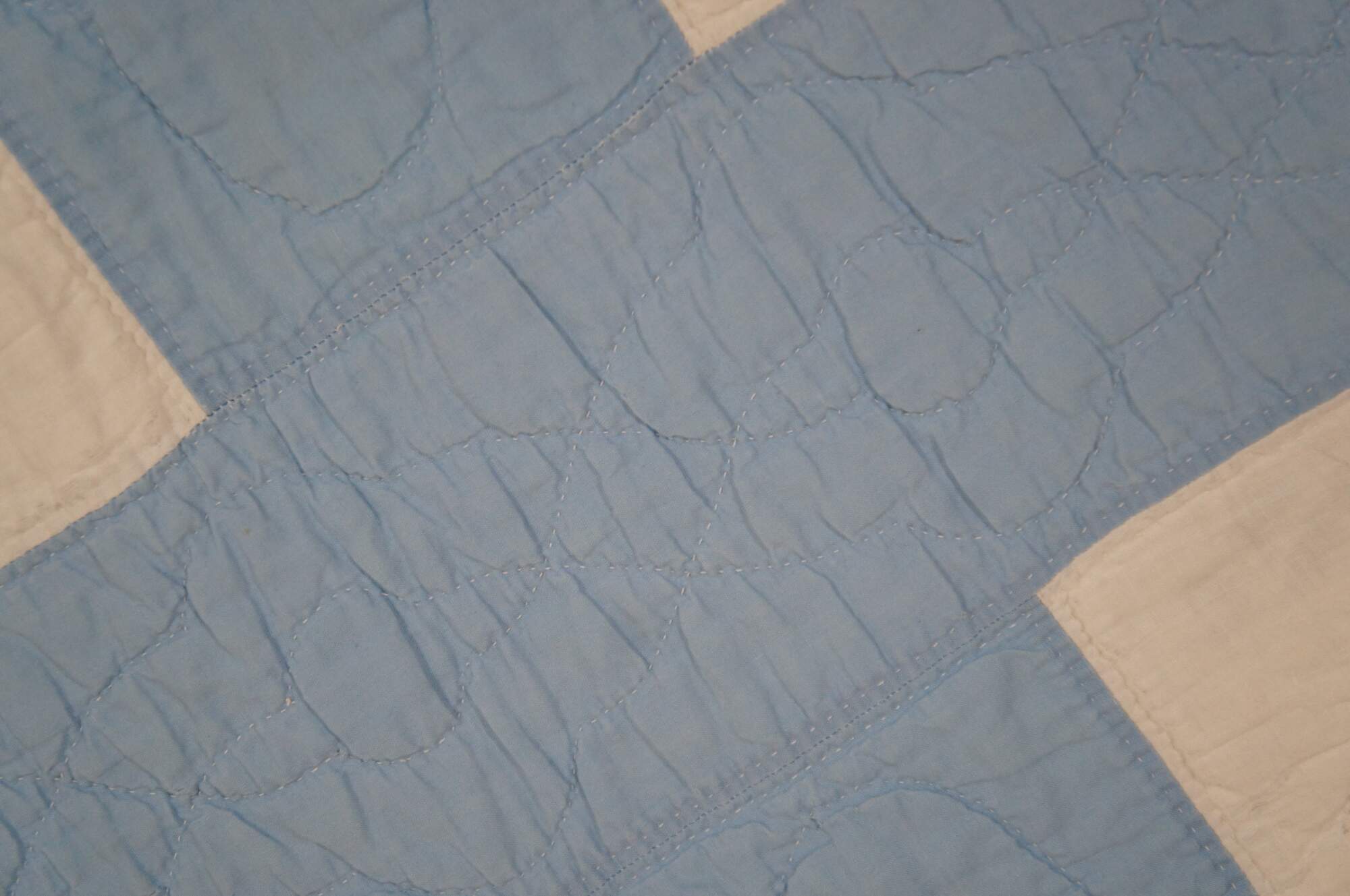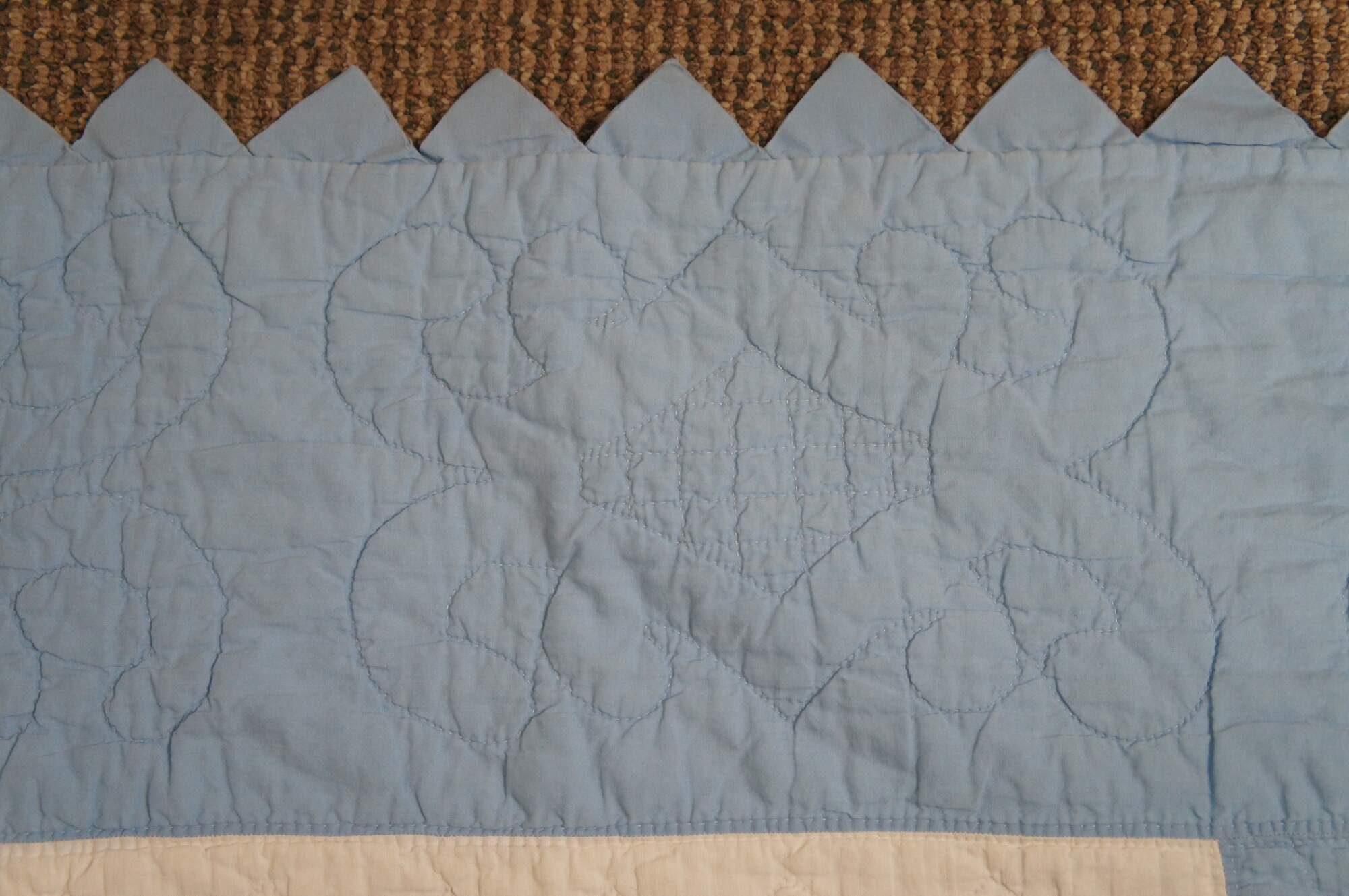 Antique hand stitched blue and white bedspread / blanket / coverlet / quilt with sawtooth border and blocks embroidered with woven interlocked eight pointed stars lined in pink flowers.
