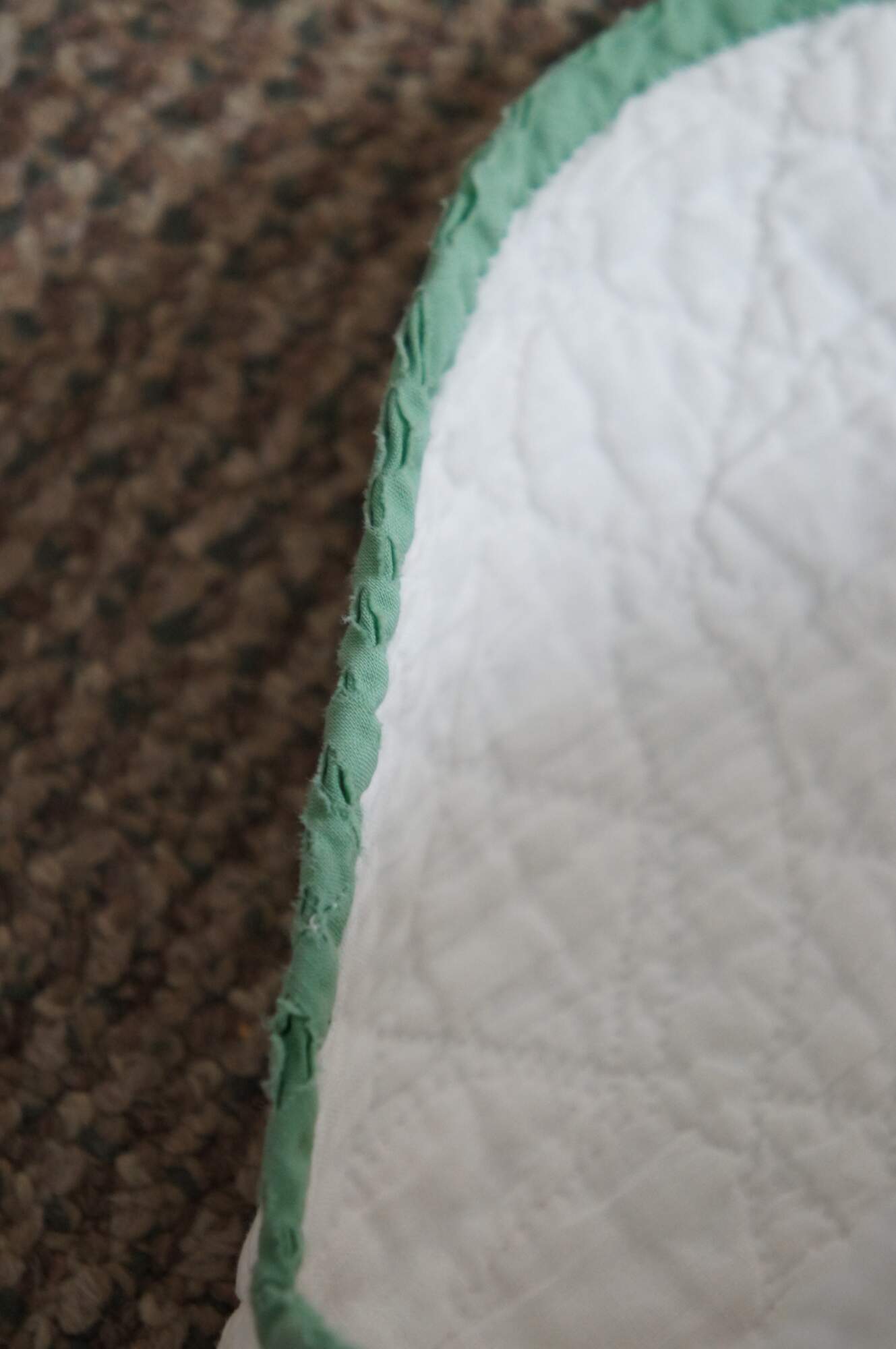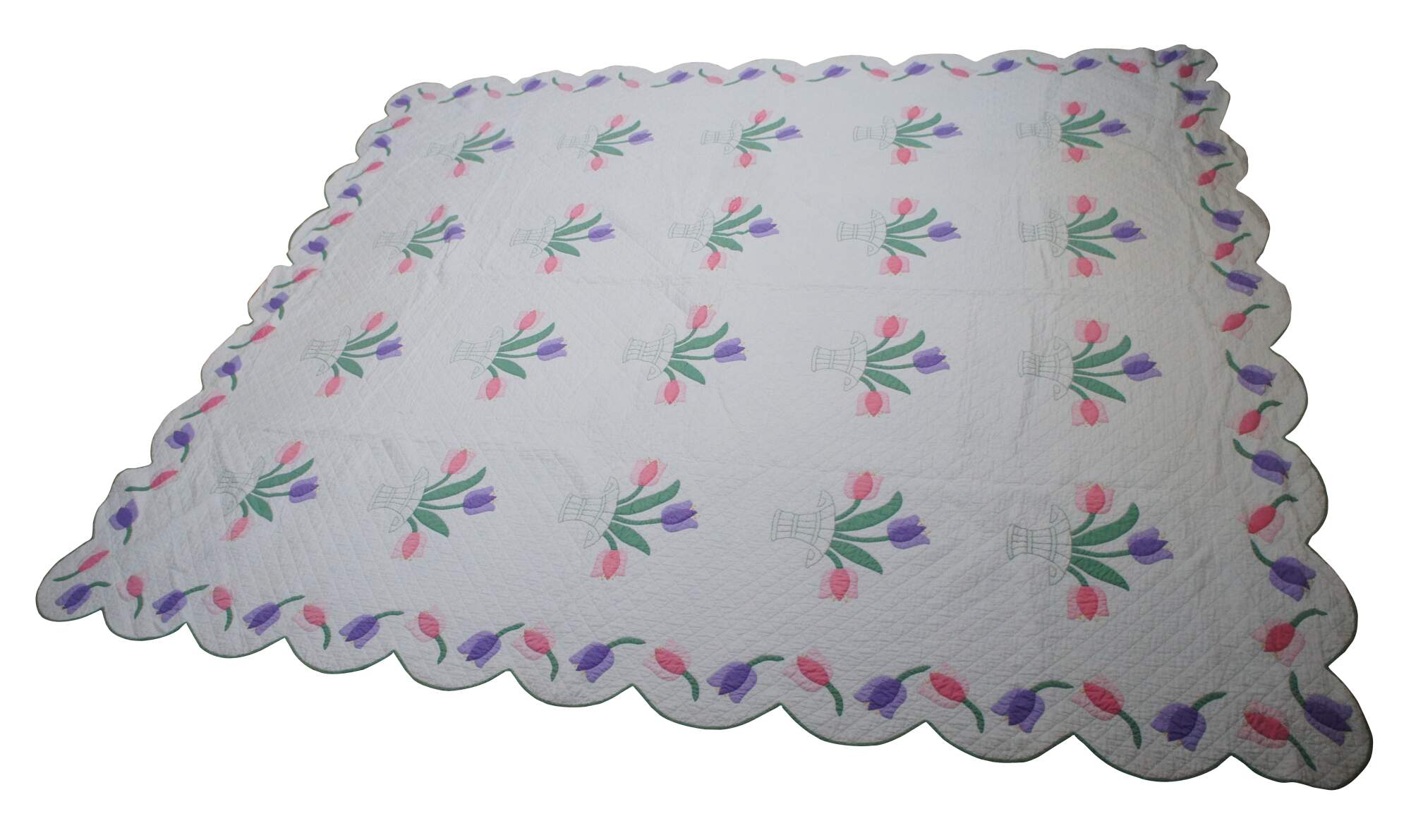 Vintage hand stitched white bedspread / blanket / coverlet / quilt with applique pink and purple tulips in embroidered baskets and loose tulips along the scalloped edge.