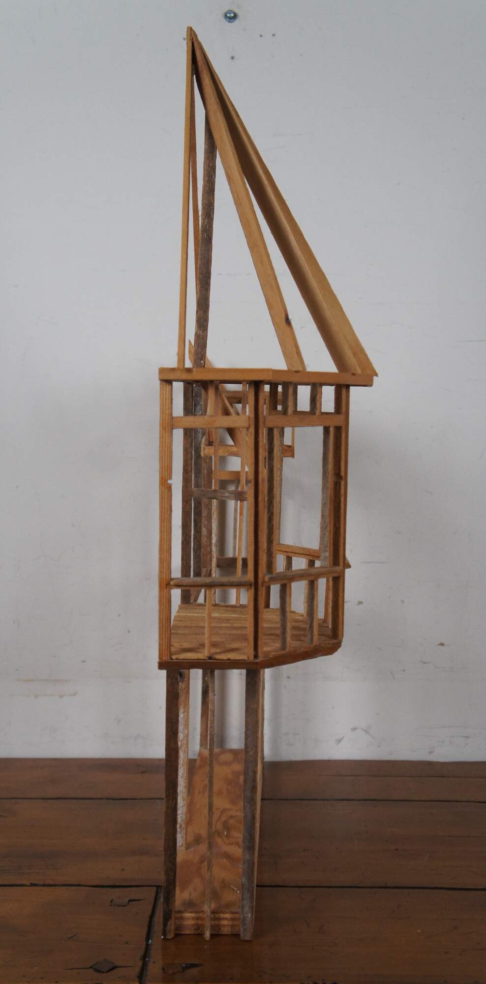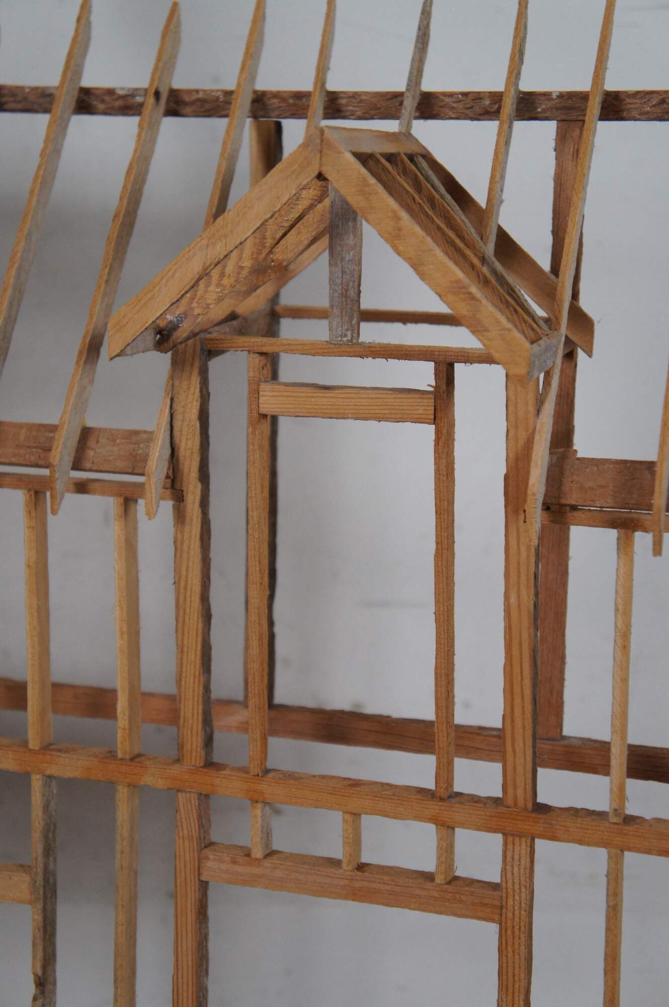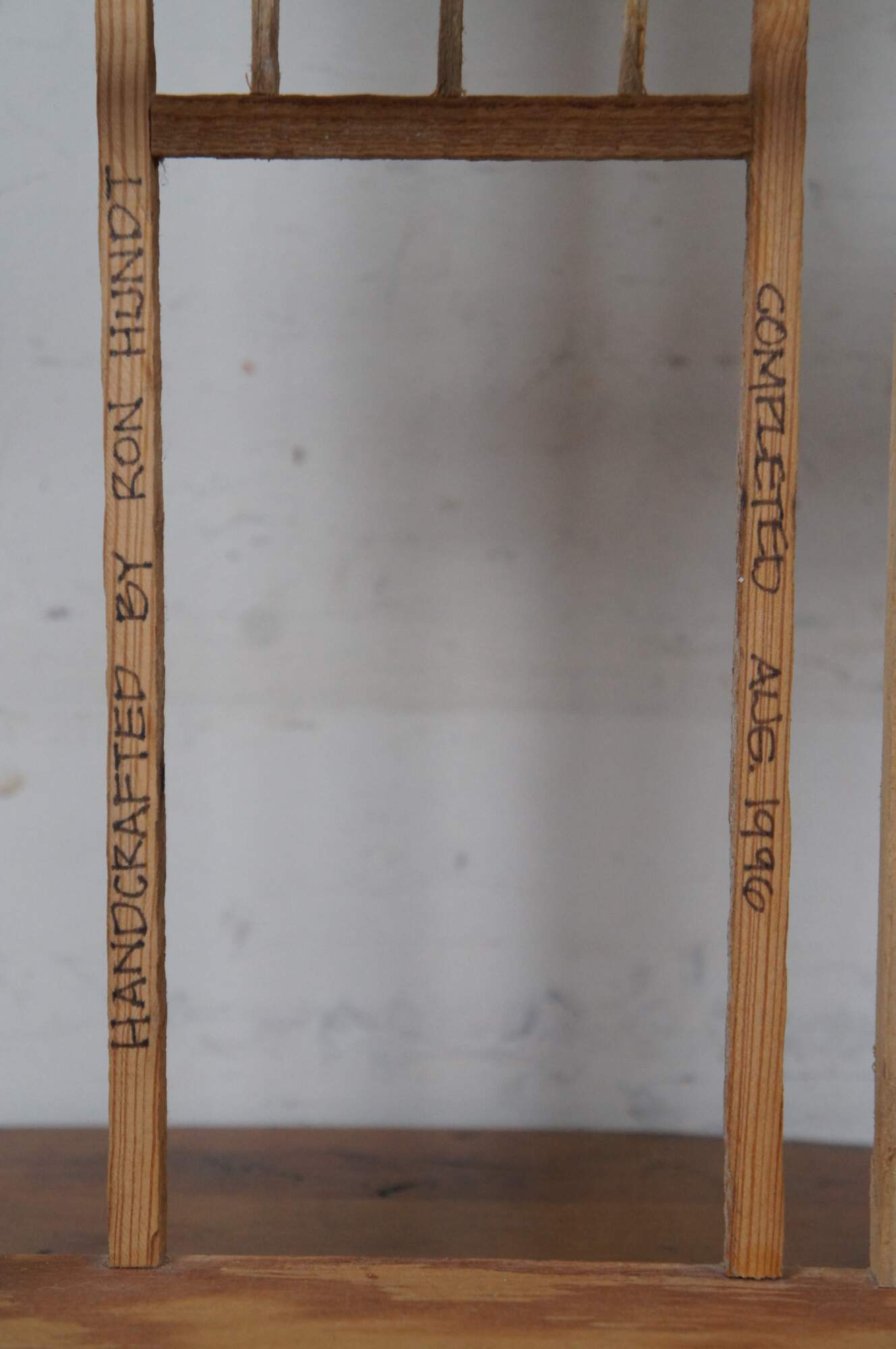 Unique piece of hand crafted wooden wall art trinket display, representing the front facade of a doll house or house shaped bird cage. Marked “Handcrafted by Ron Hundt – Completed Aug. 1996.