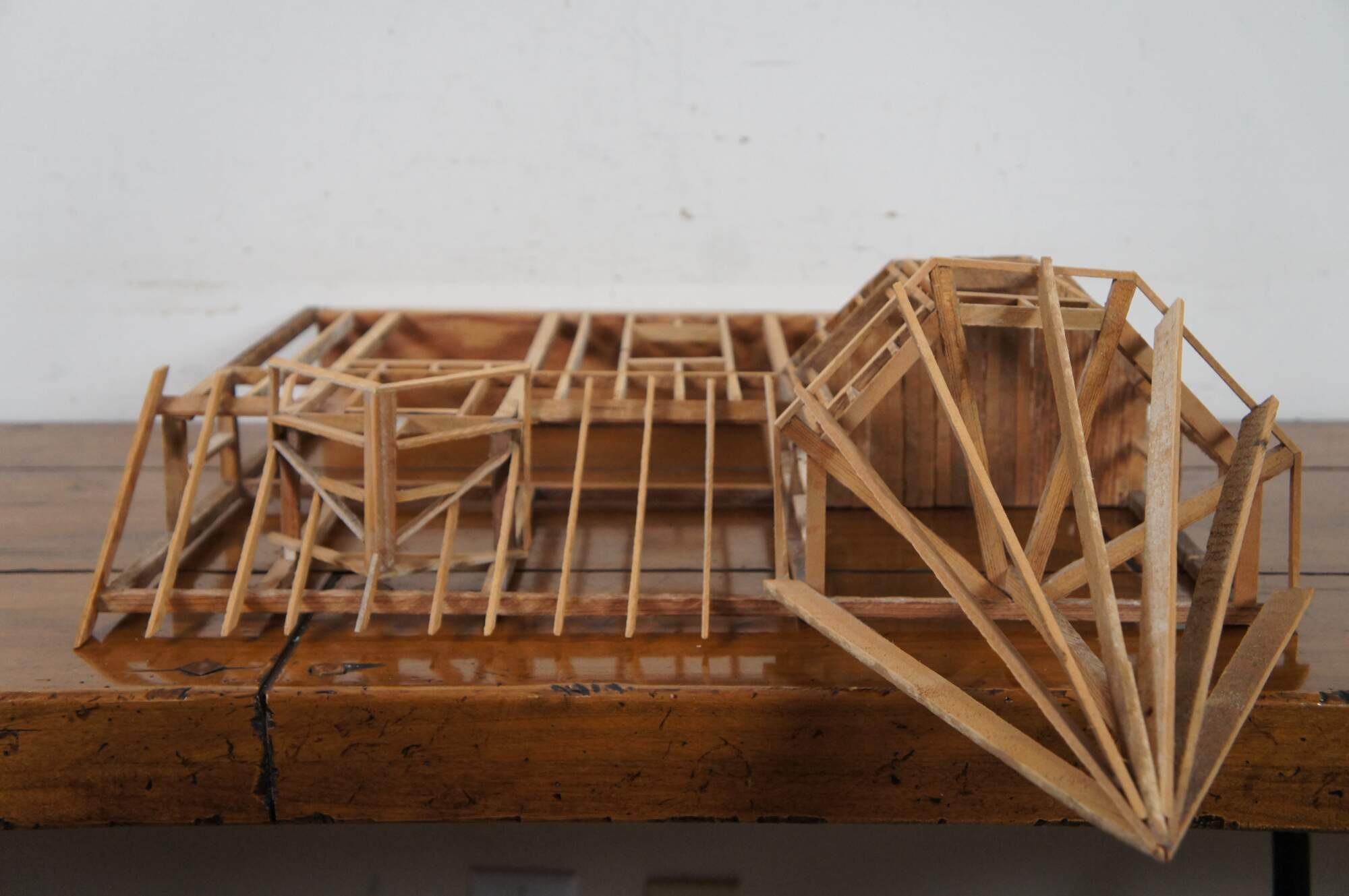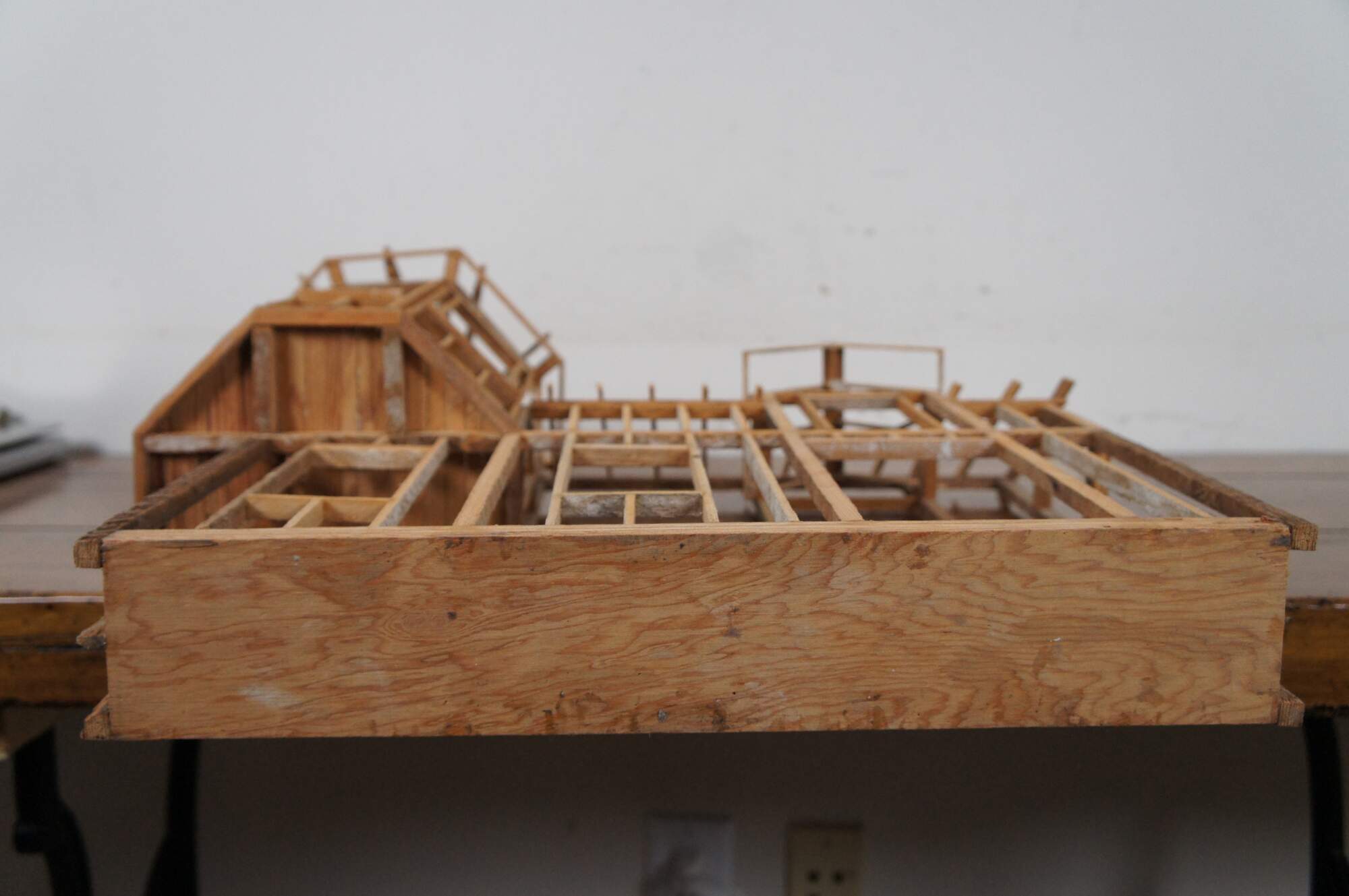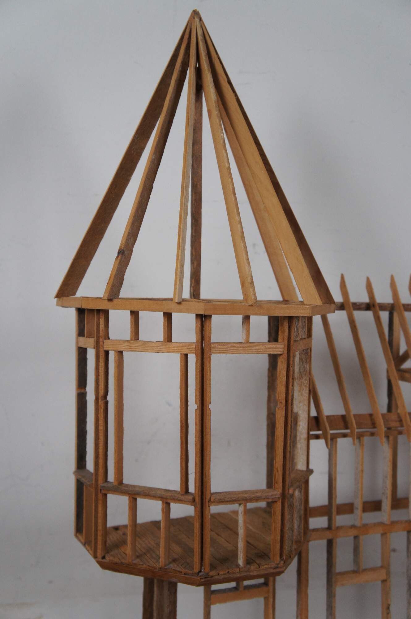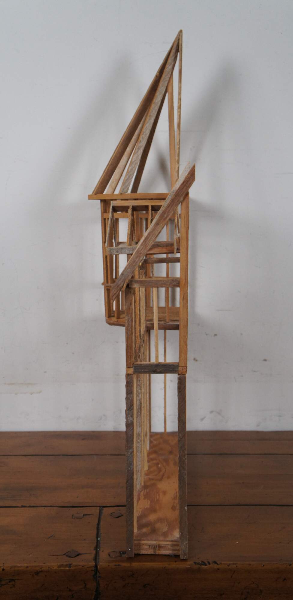 Unique piece of hand crafted wooden wall art trinket display, representing the front facade of a doll house or house shaped bird cage. Marked “Handcrafted by Ron Hundt – Completed Aug. 1996.