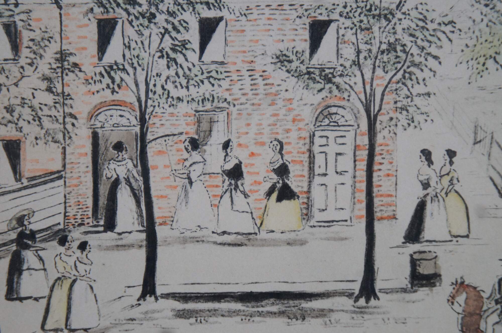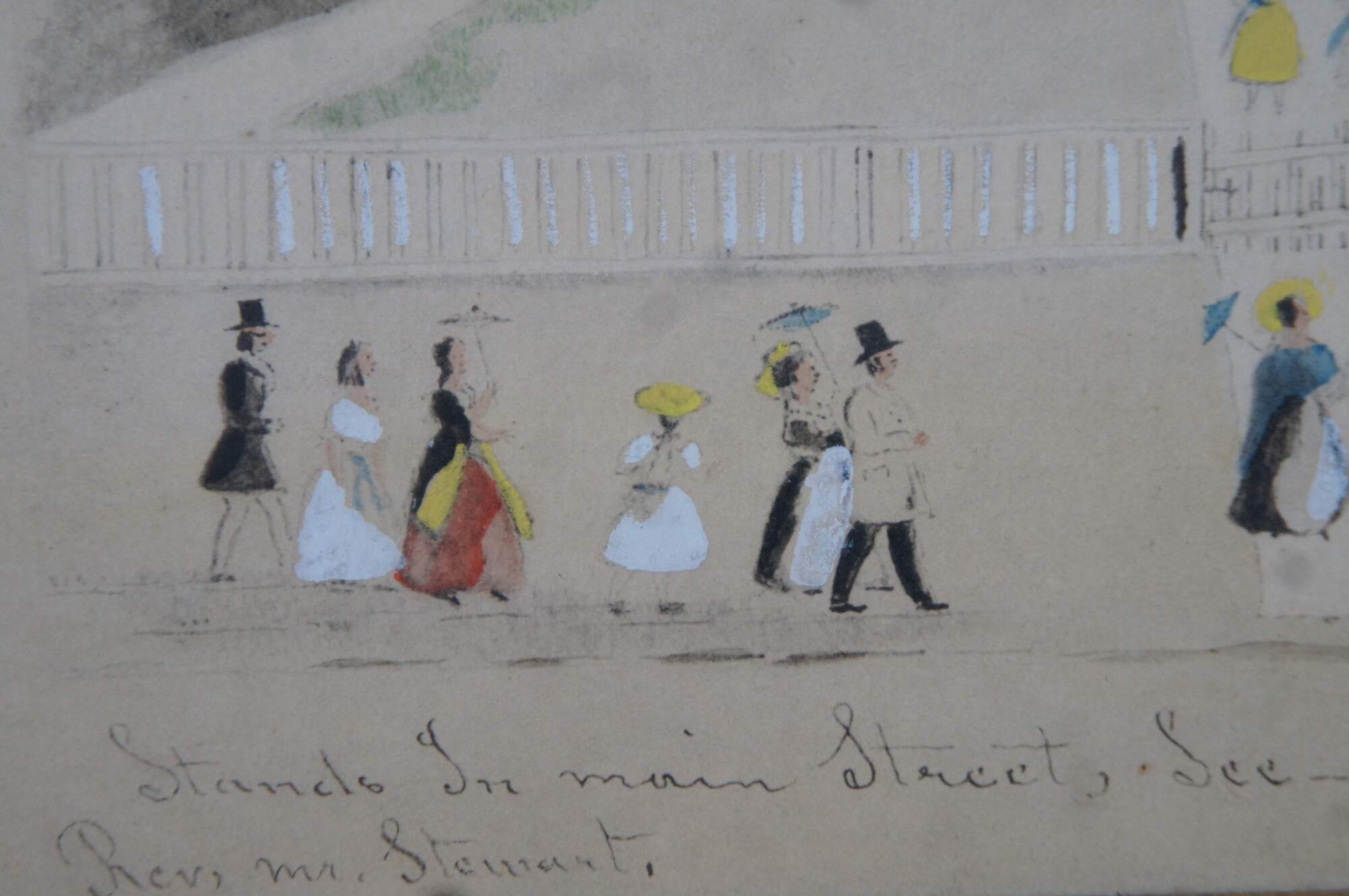 Set of 4 antique hand colored folk art style prints by Lewis Miller. Set includes The Residence of Mr. Croctett in Wytheville. July 1th, 1856; The New Presbyterian Church, Build in 1853; The Bridge over Reed Creek; and The Female Academy, in Christianburg May 15th, 1856.