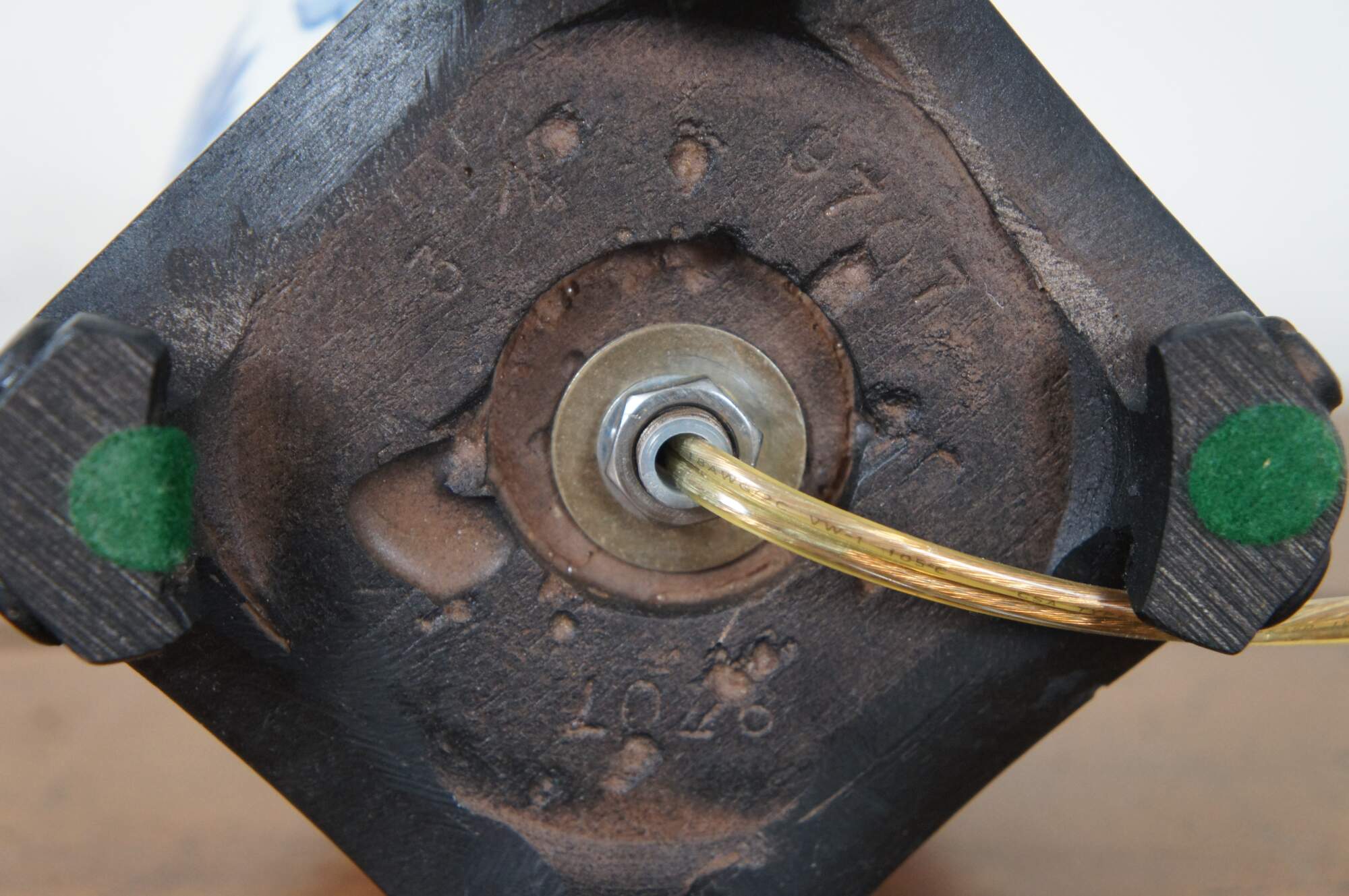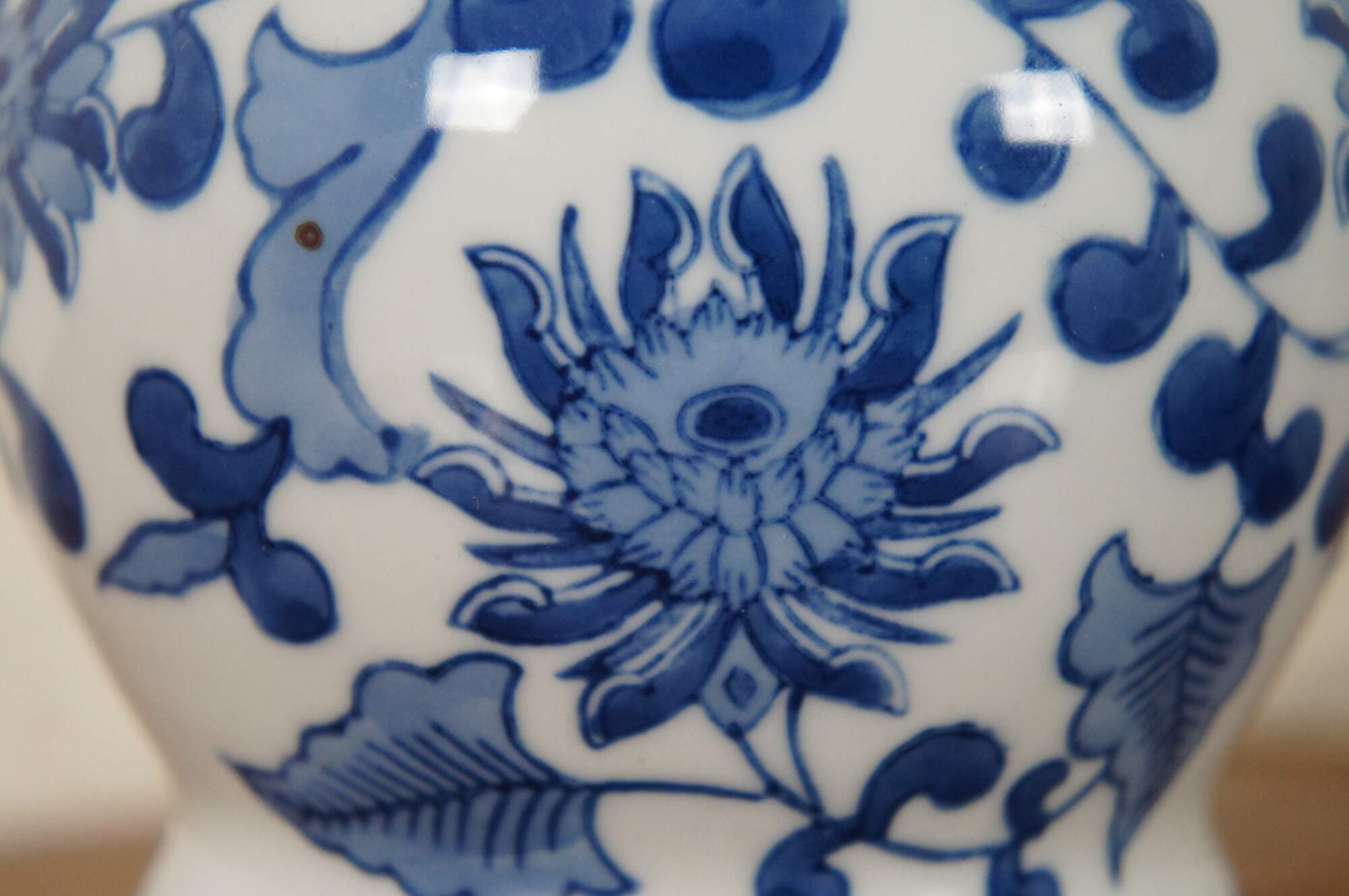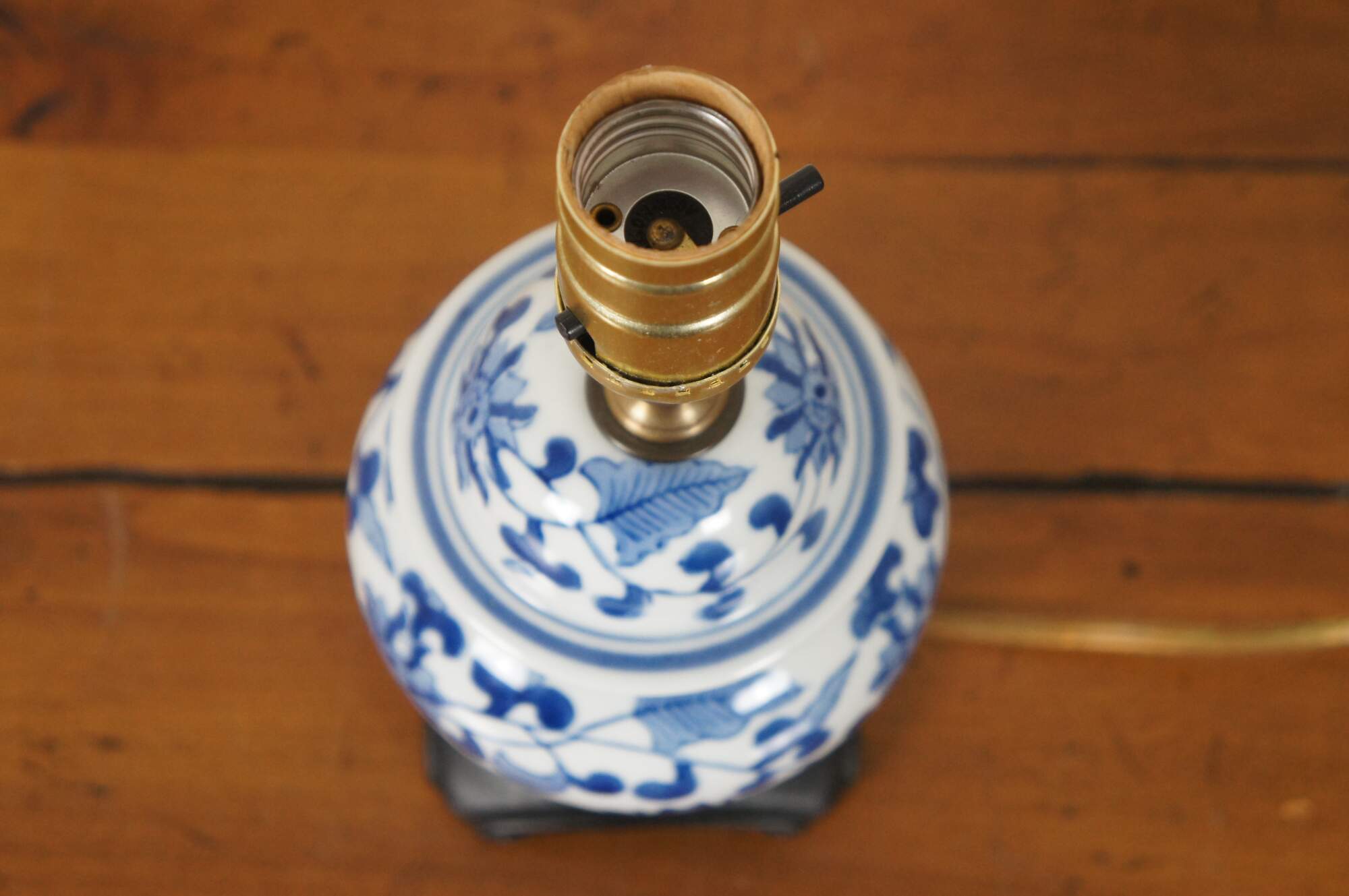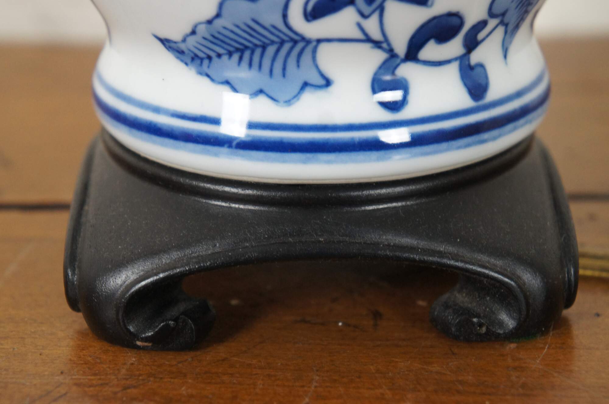 Vintage blue & white Chinese porcelain ginger jar shaped budoir / table lamp with dark wood base and white shade.