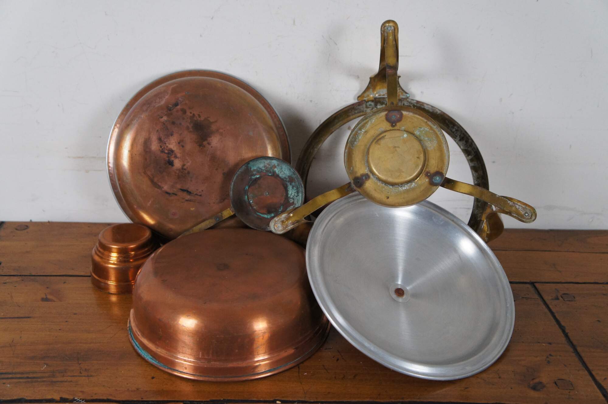 Vintage five piece copper and brass chafing dish / warming pan set with turned wood handle.