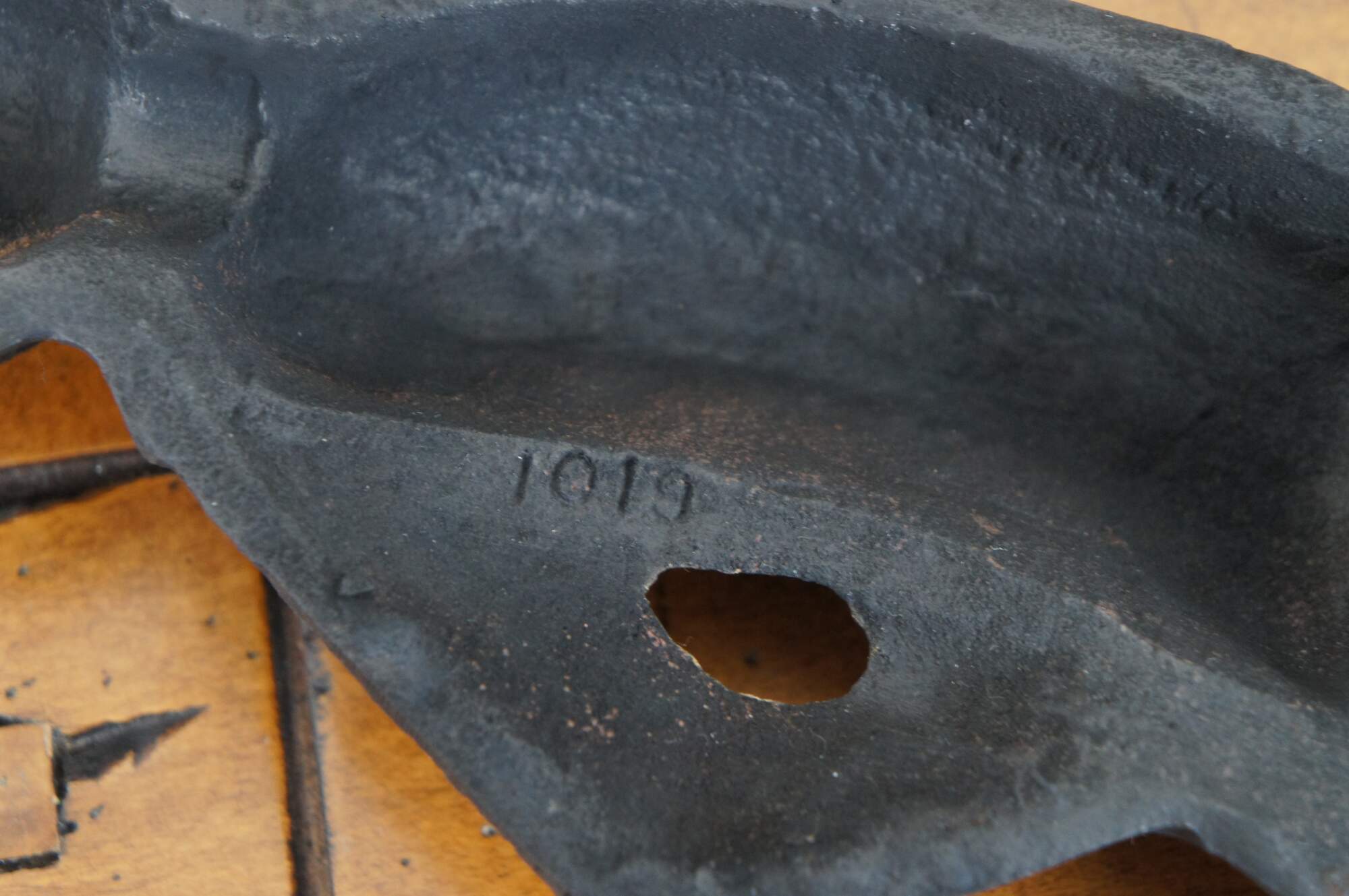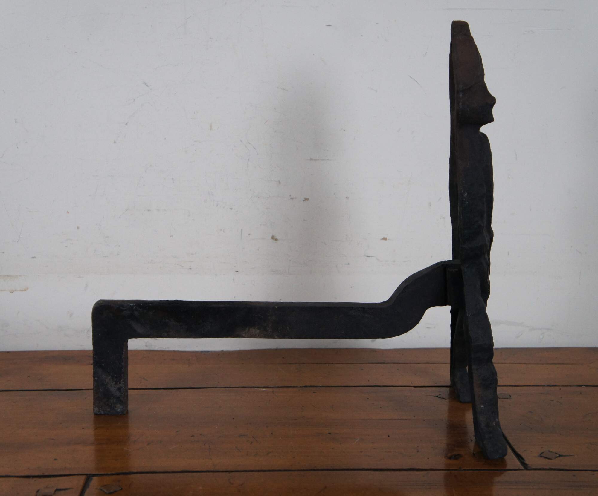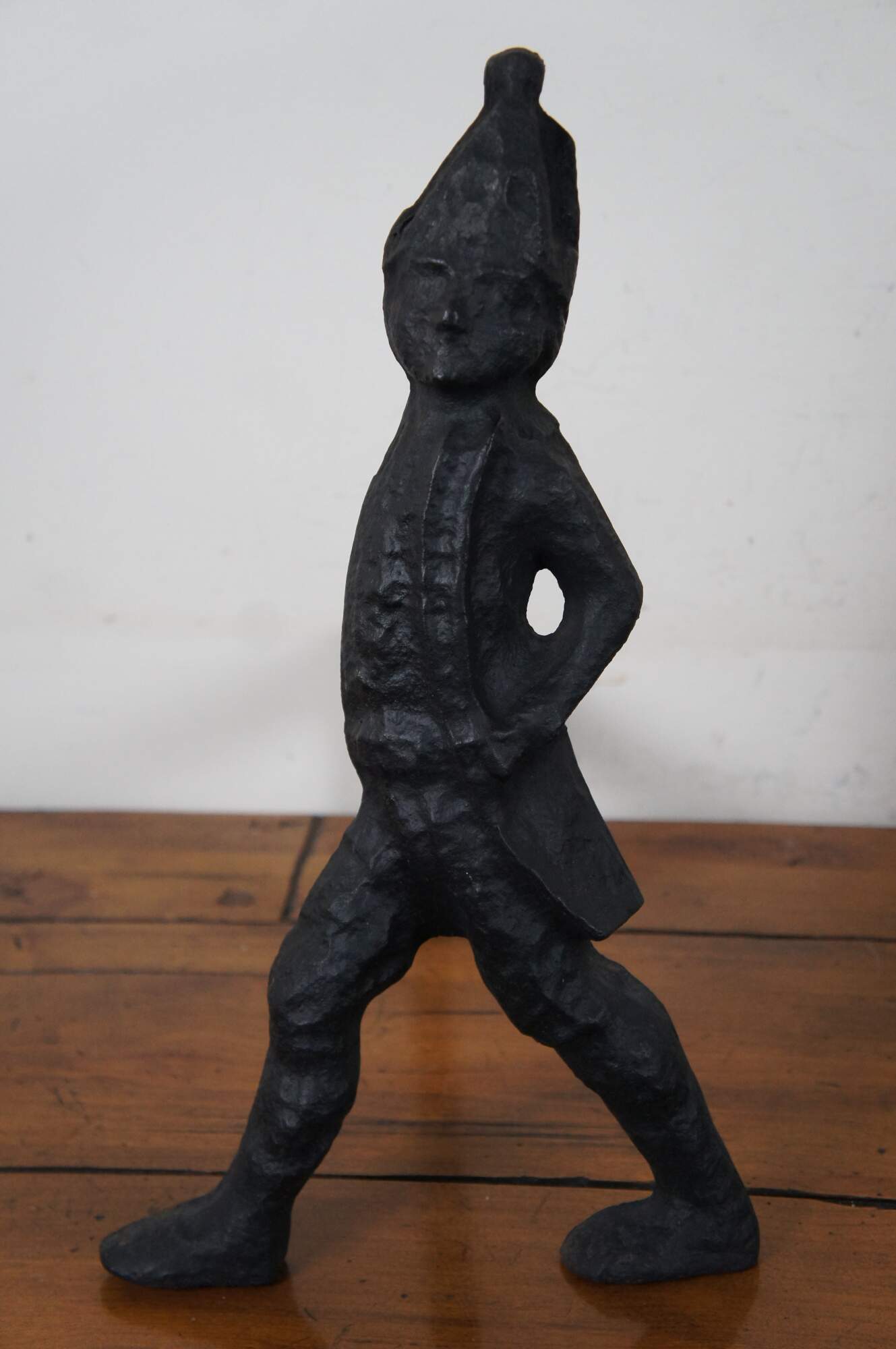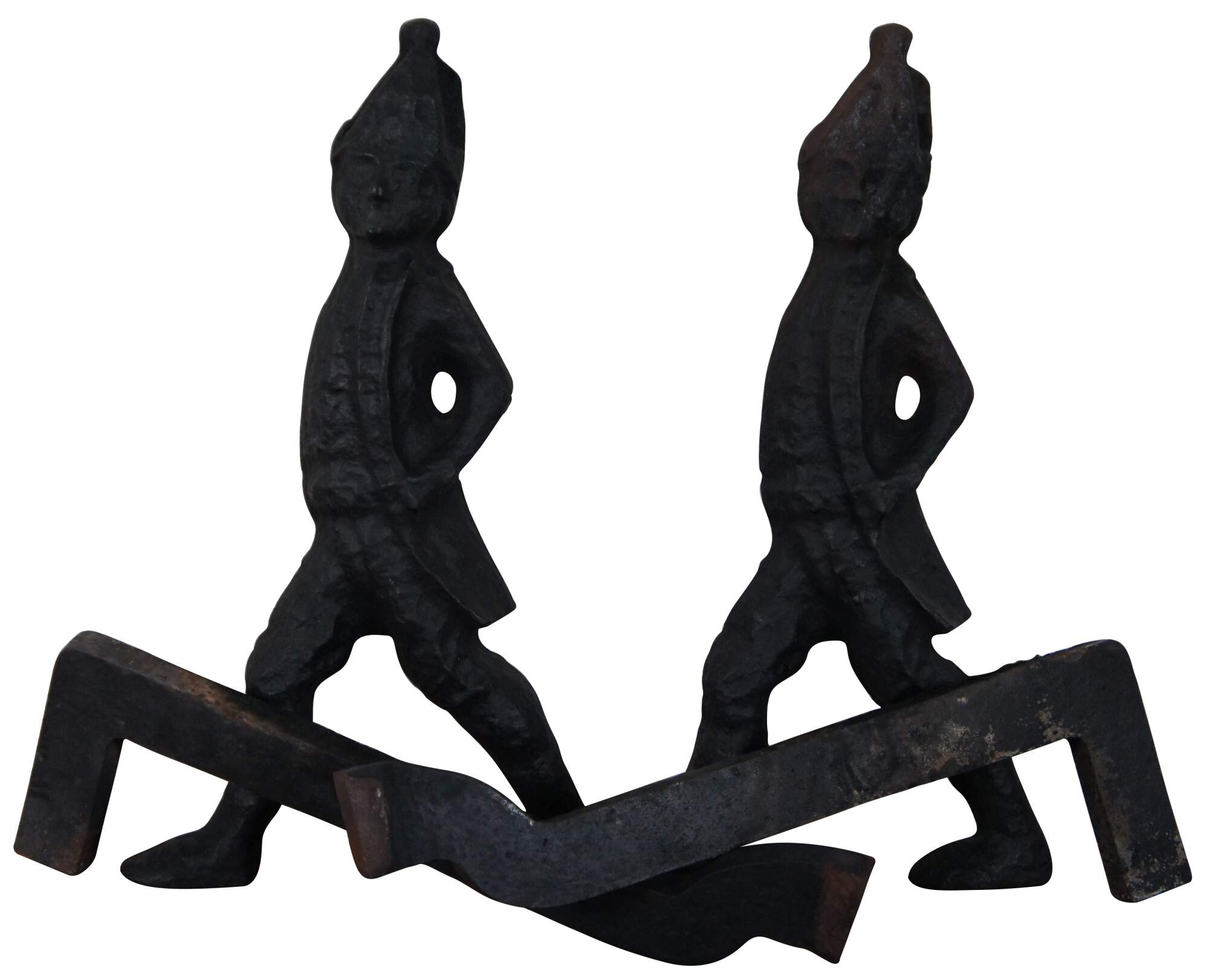 Antique Harvin Company cast iron firedogs / andirons, design number 1019 in the shape of 18th century style Hessian soldiers with removable supports. Also includes a fire poker and mantel hook for convenient hanging.