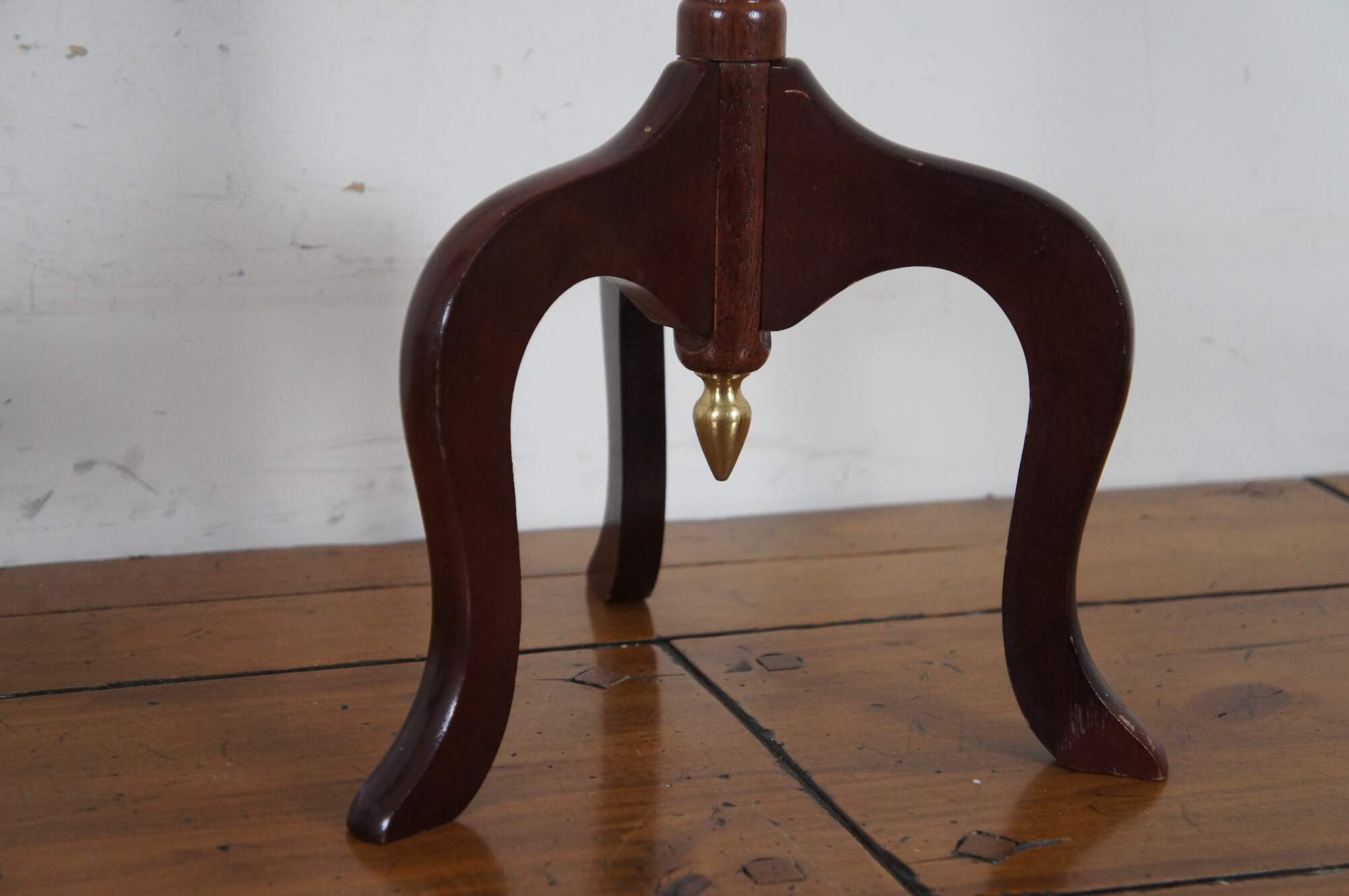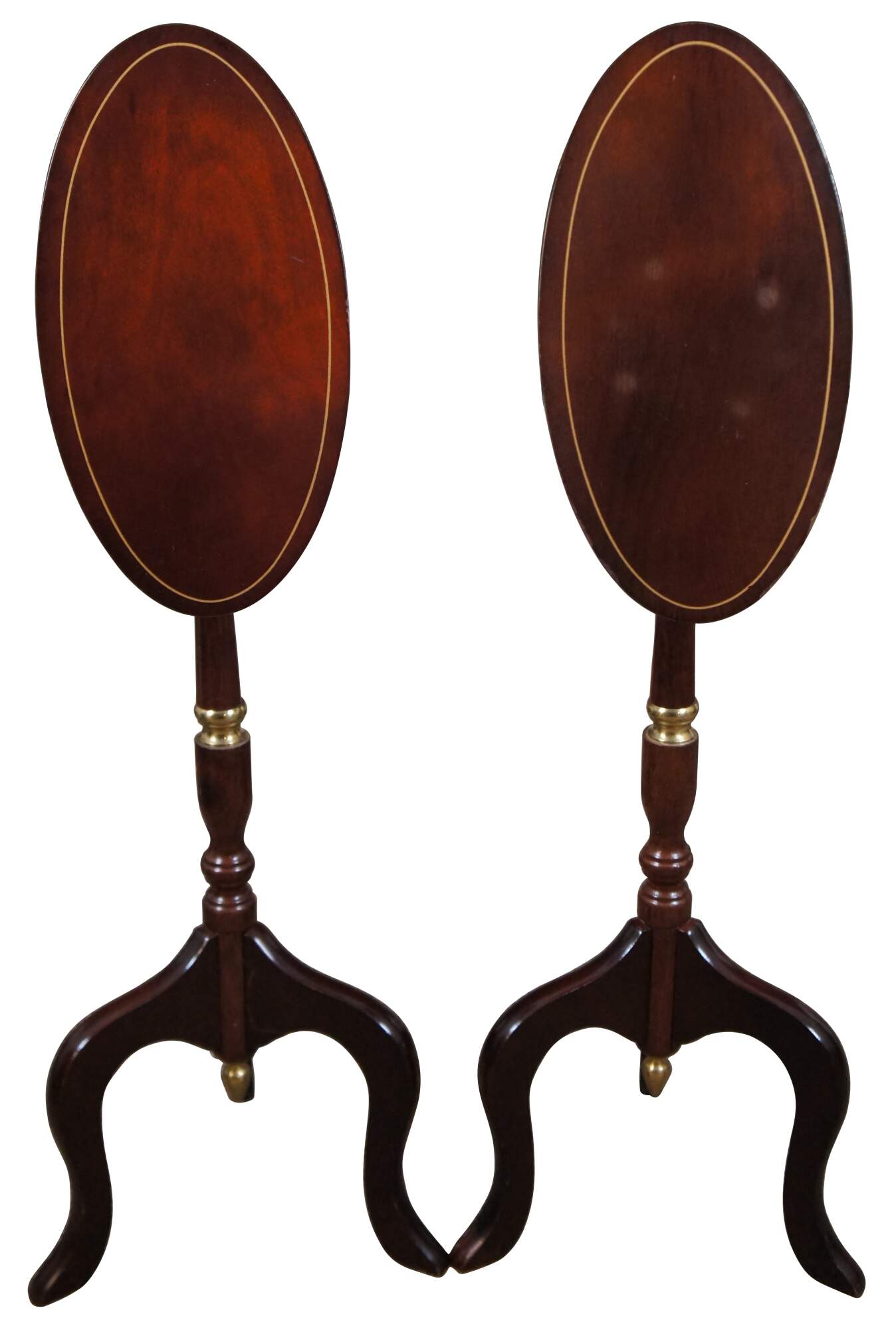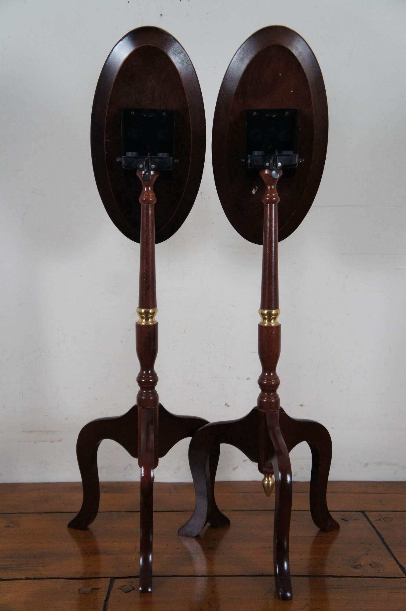 Pair of vintage Queen Anne style mahogany tilt top oval candle stands with inlaid top, tripod cabriole feet, central column and brass accents.