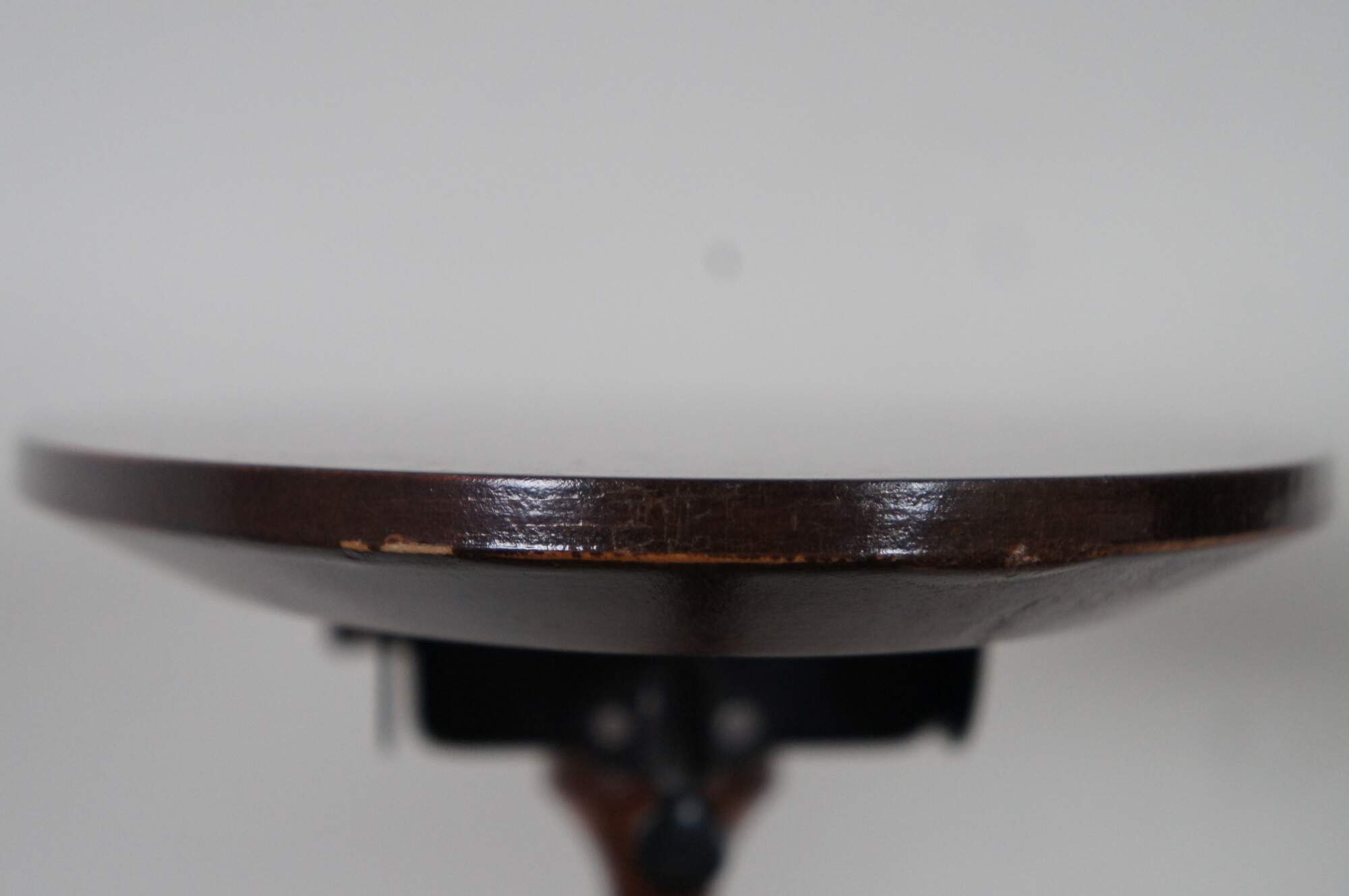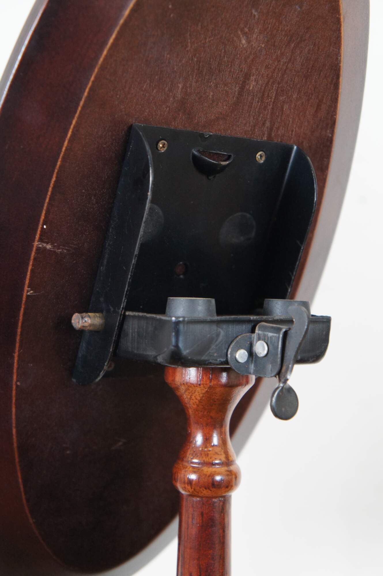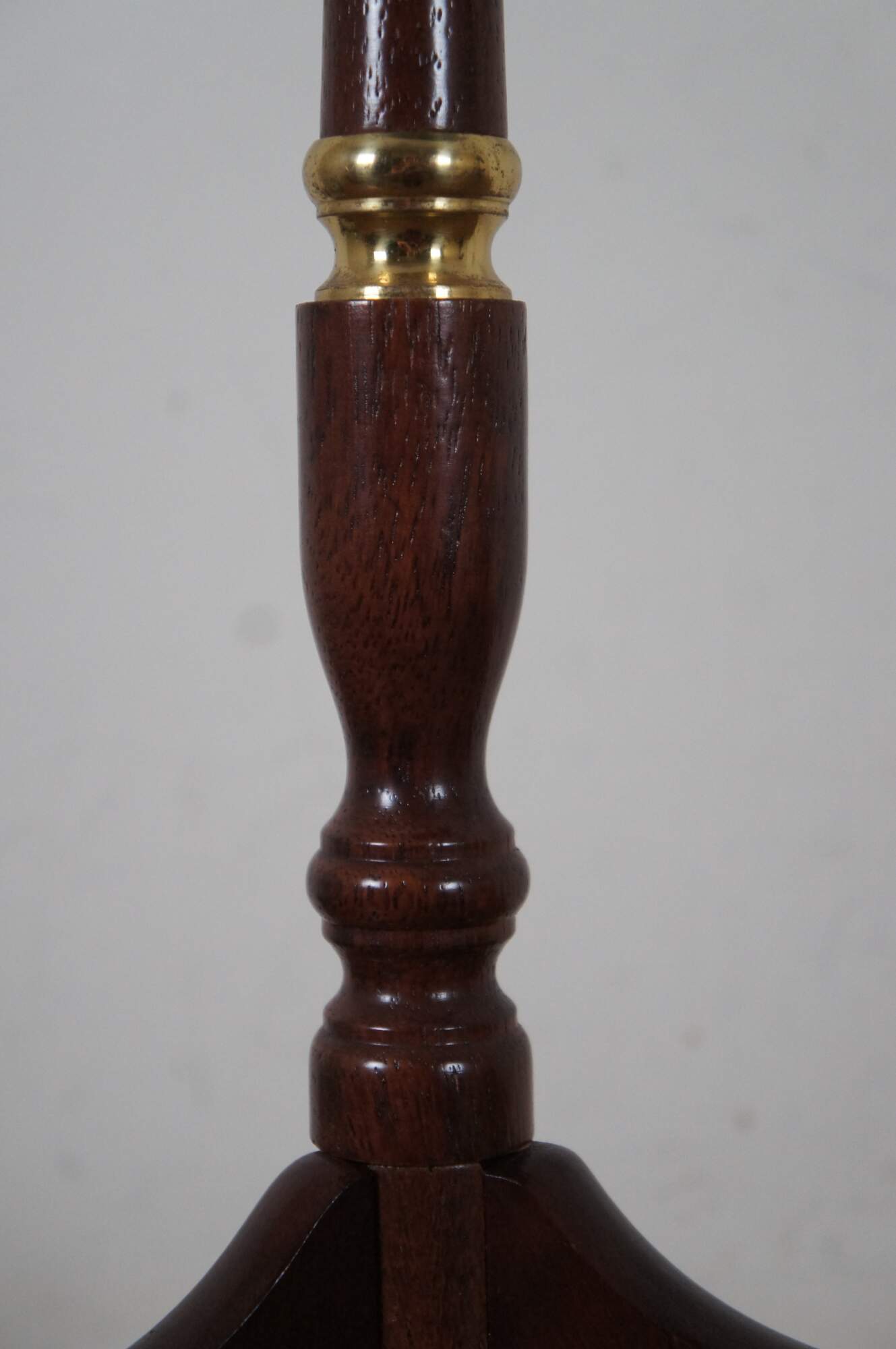 Pair of vintage Queen Anne style mahogany tilt top oval candle stands with inlaid top, tripod cabriole feet, central column and brass accents.
