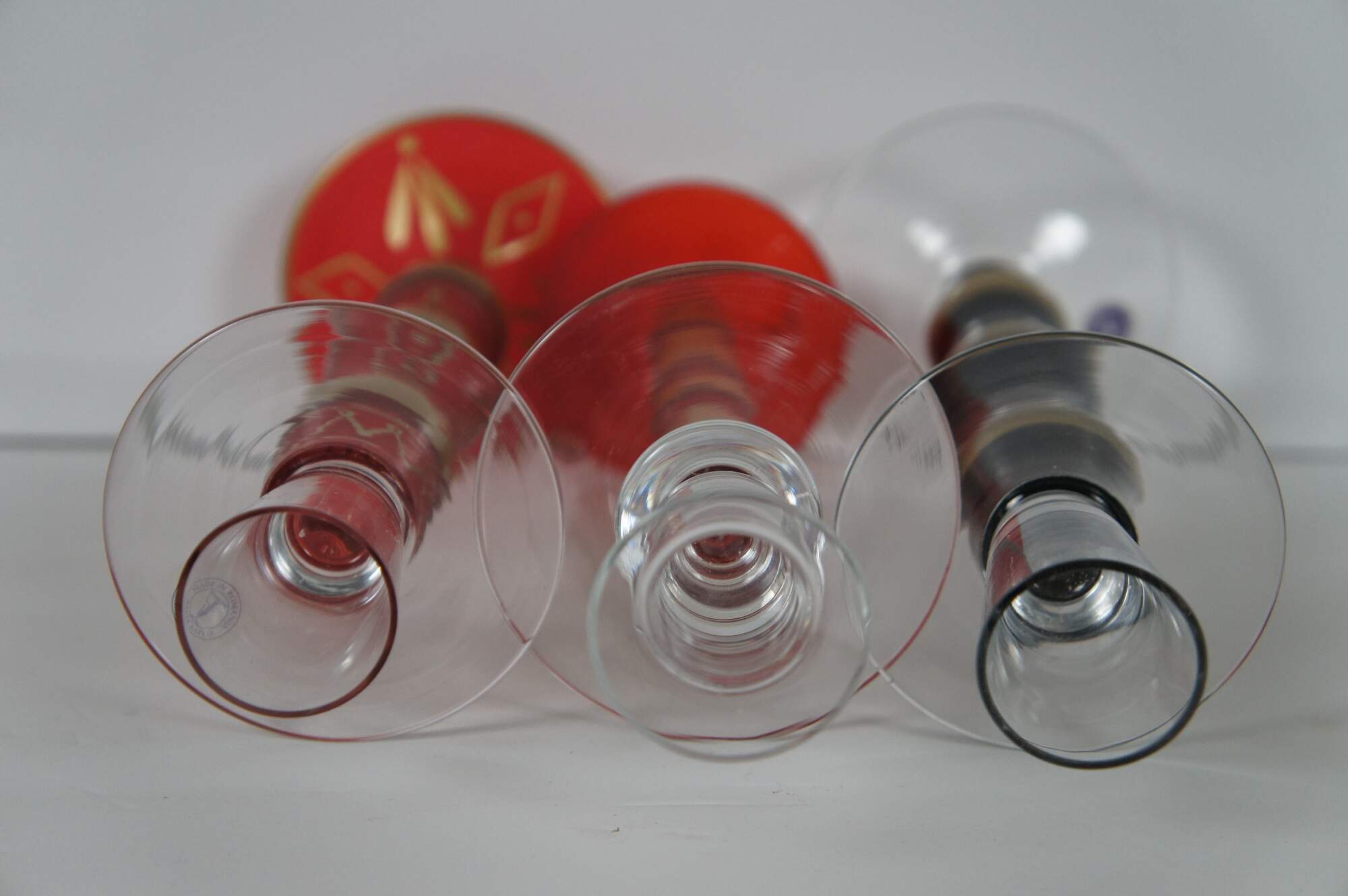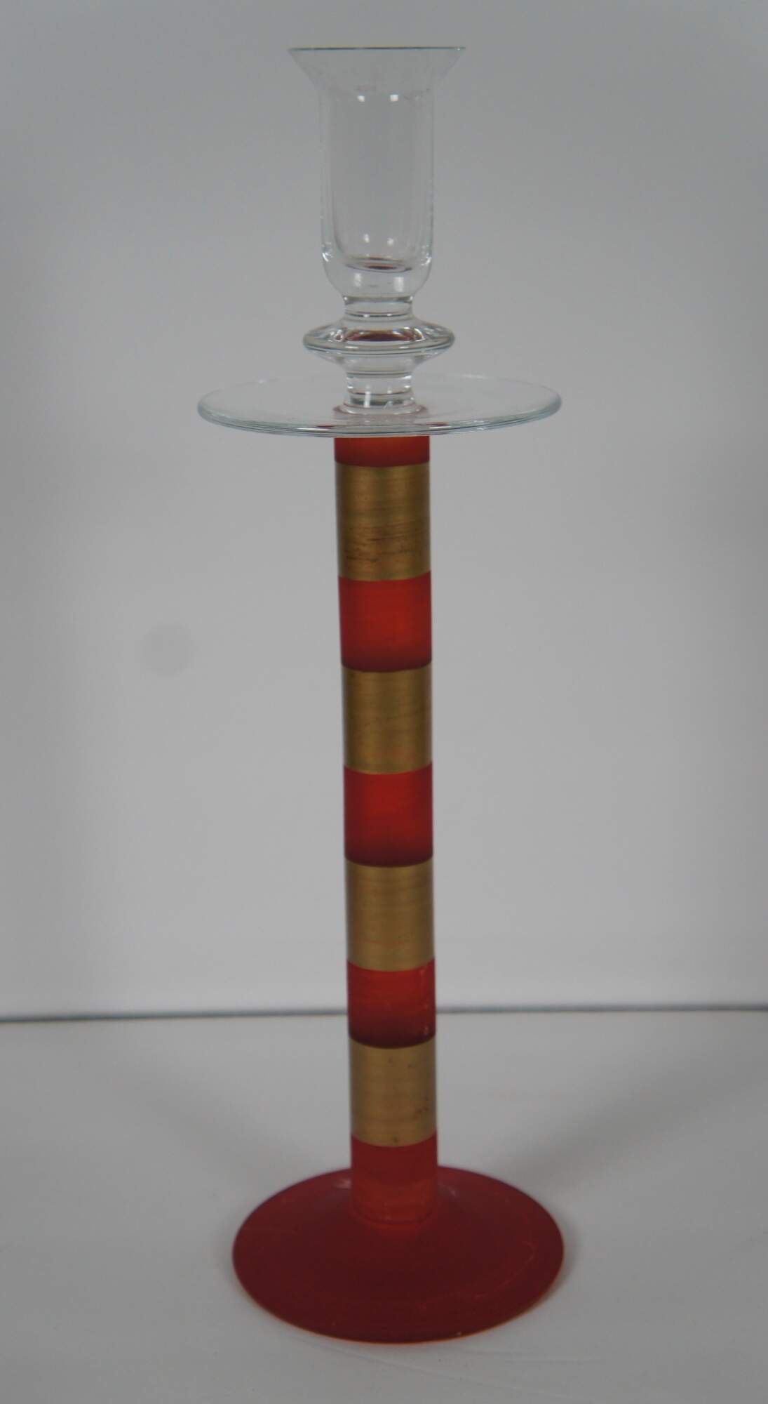 Set of three vintage hand blown and painted glass candlesticks in red and gold, and gold and black, made in Romania.