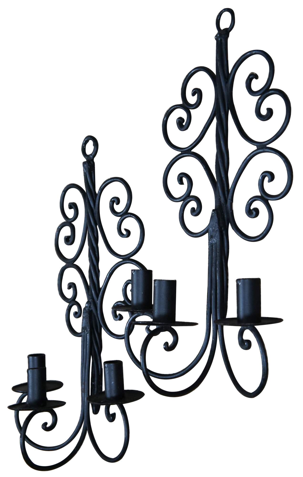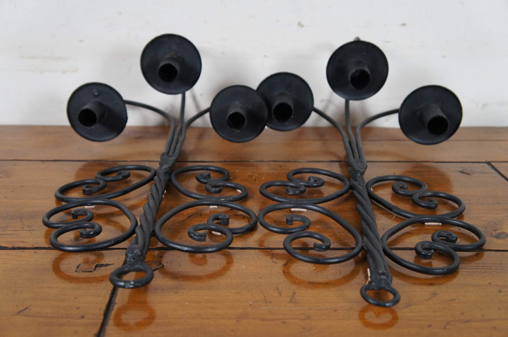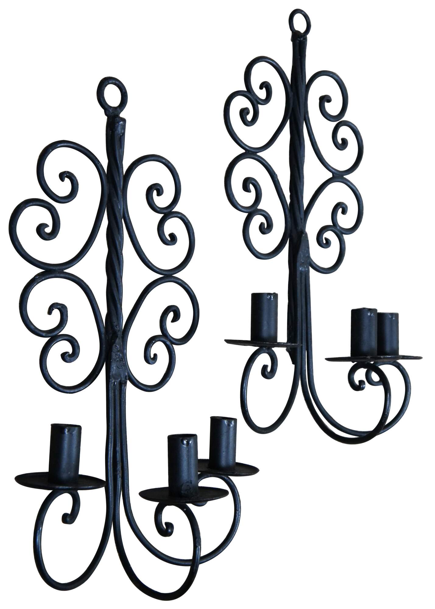 Vintage pair of twisted or scrolled wrought iron three arm candle holder wall sconces.