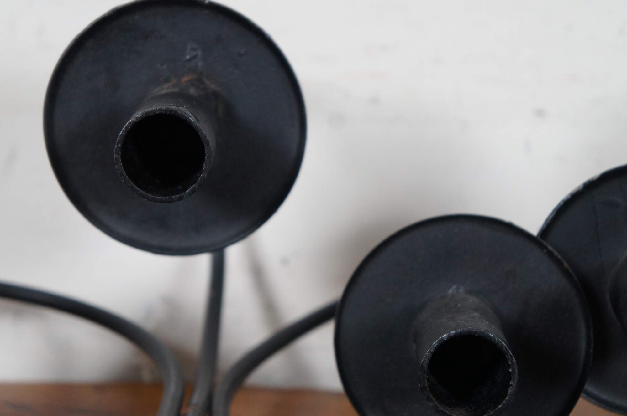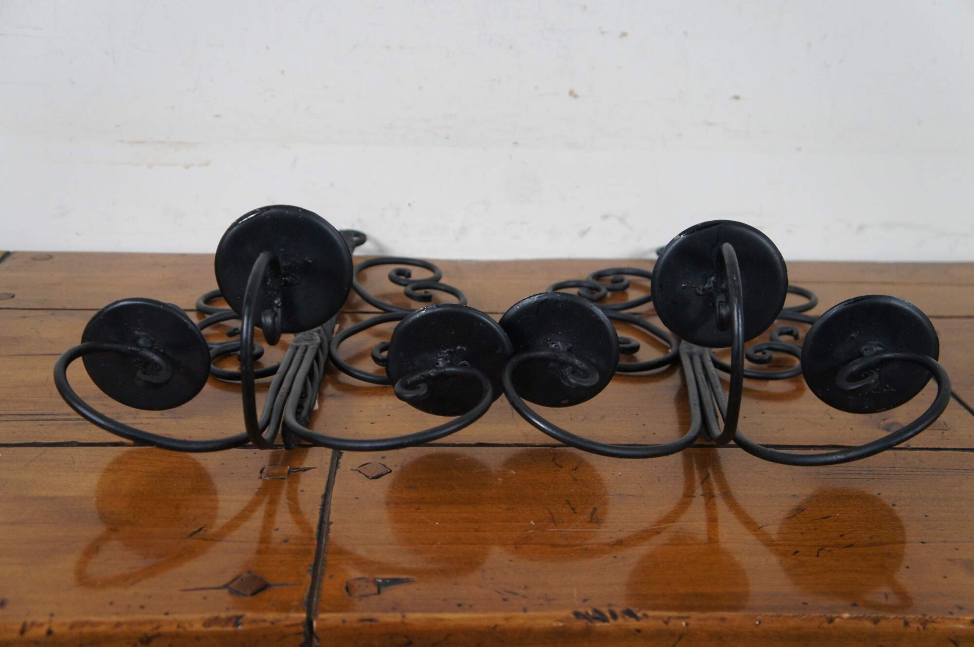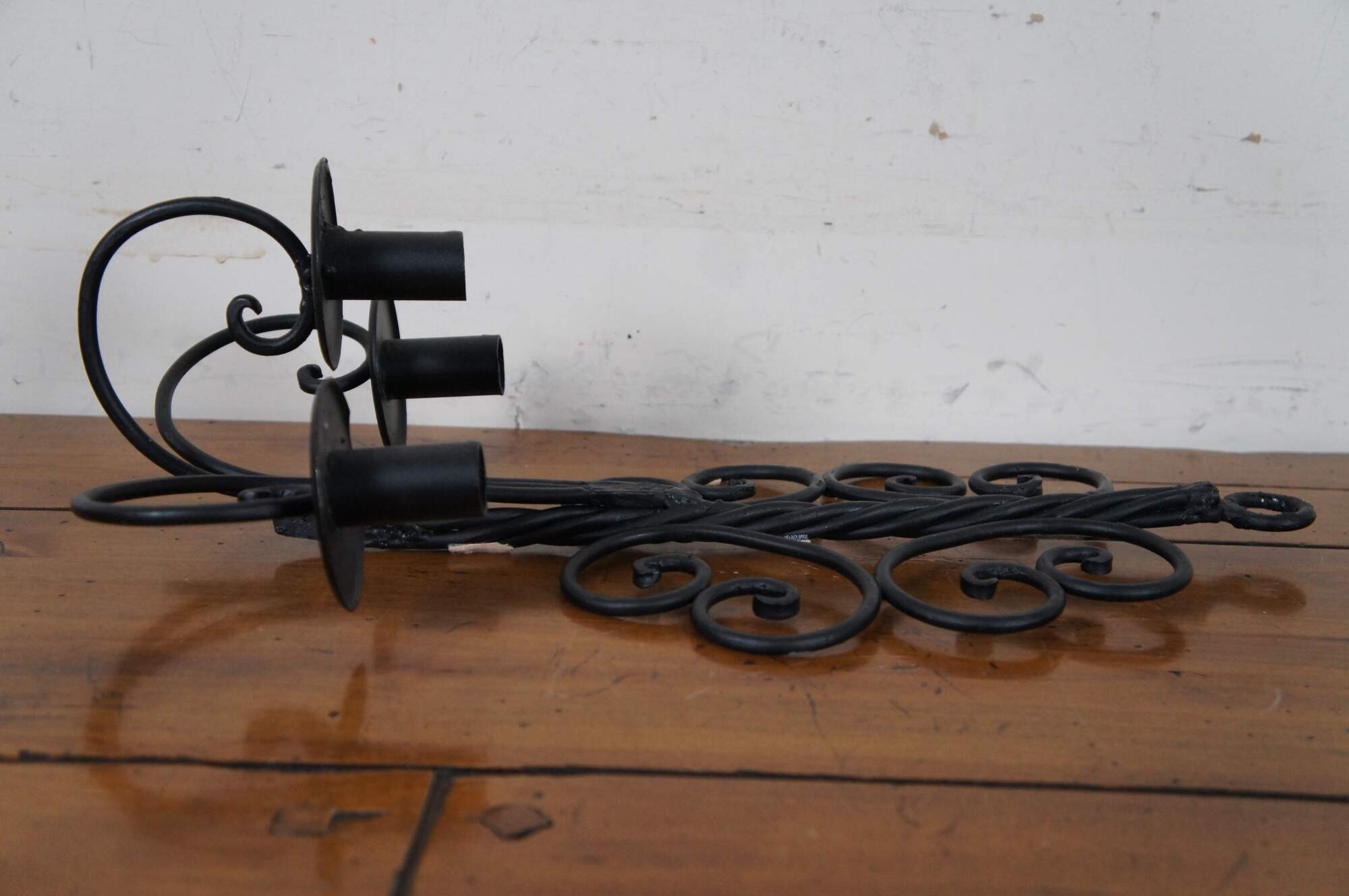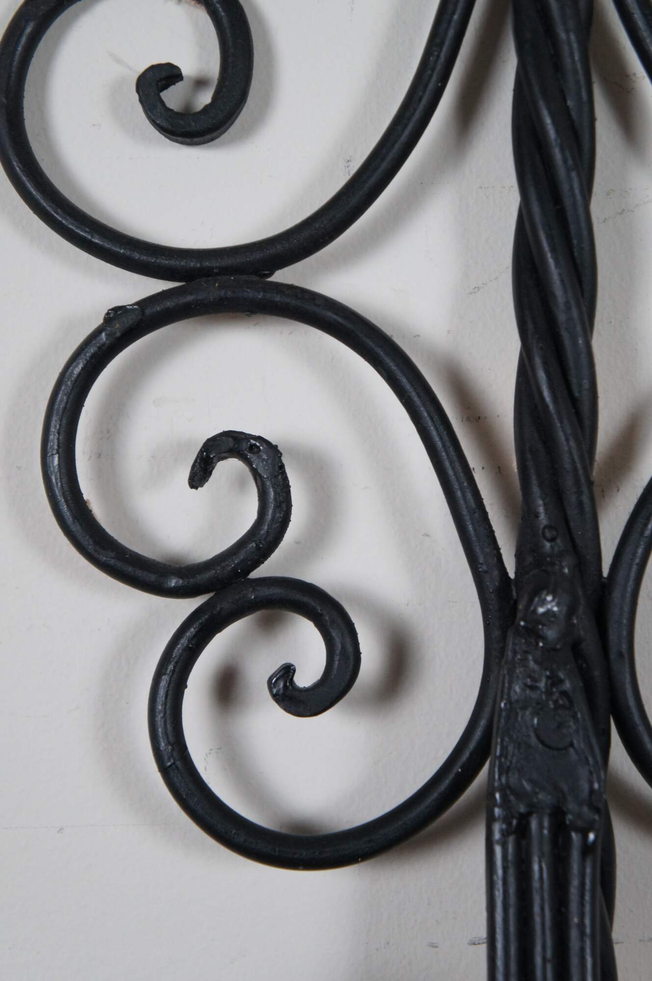 Vintage pair of twisted or scrolled wrought iron three arm candle holder wall sconces.